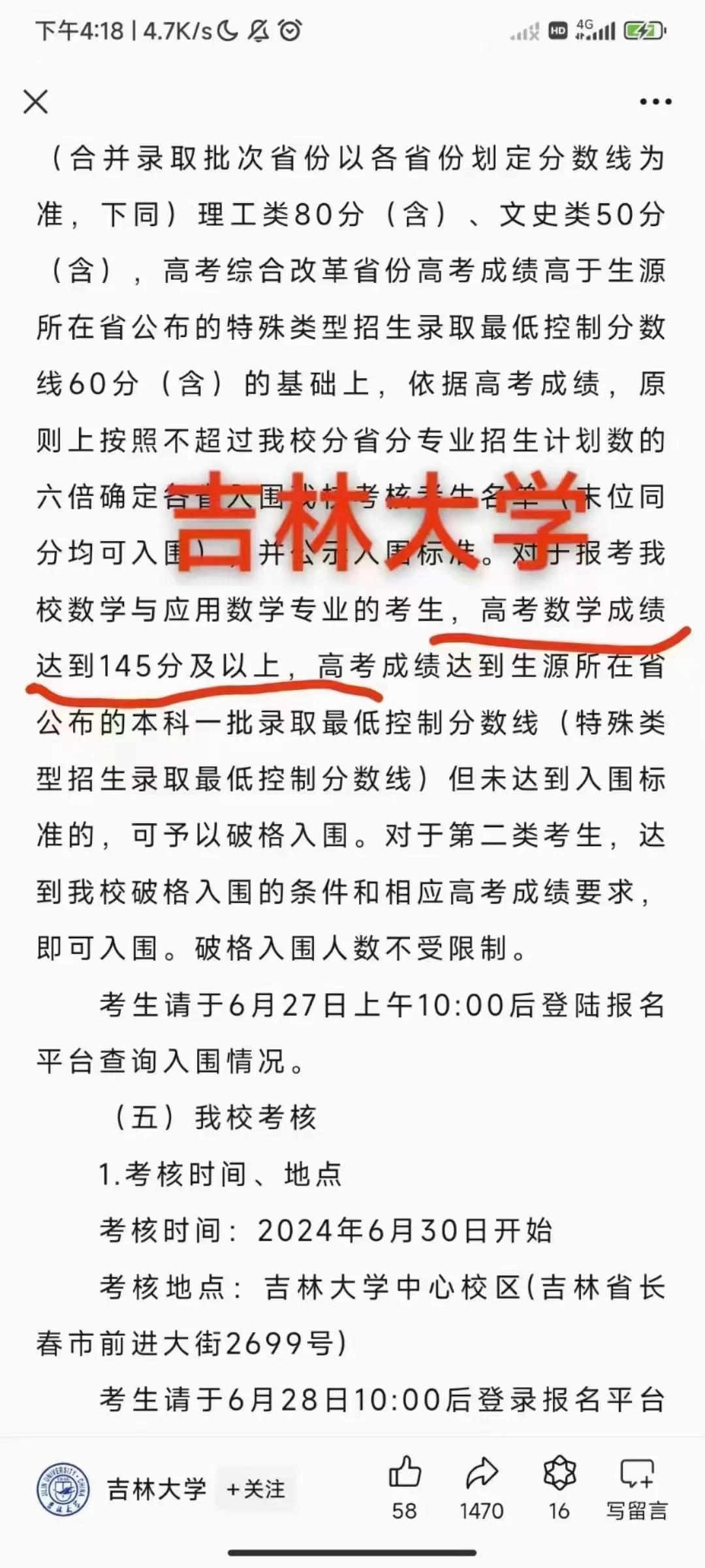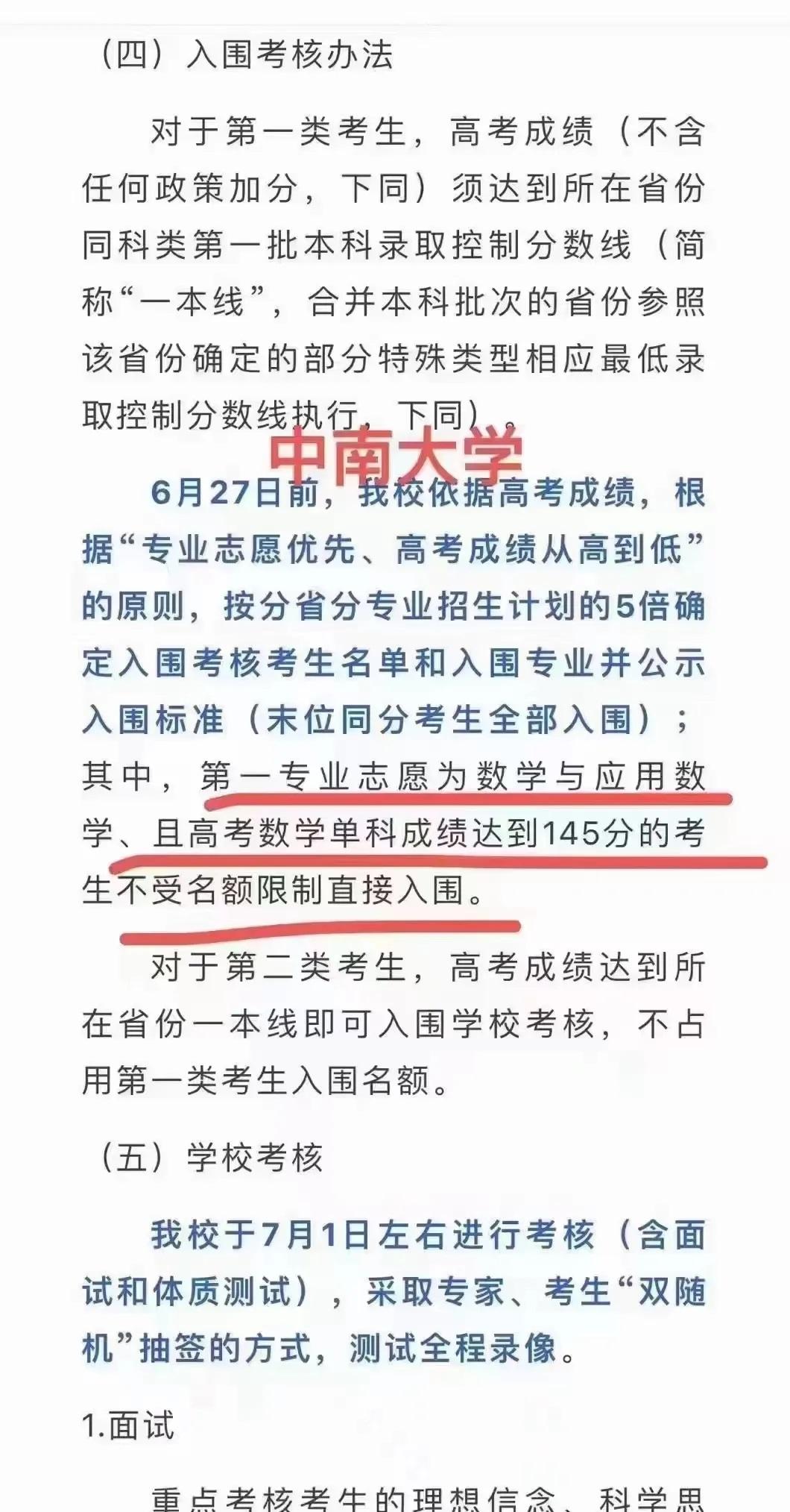 #2024高考# #2024高考变革# 2024年的高考命题改革可谓是波澜壮阔,引起了社会各界的广泛关注。简单概括一下这消息就是:如果你高考数学在145分以上,甚至是150满分,就可以破格甚至直接录取国内的一流大学。 在众多变化中,最为引人注目的莫过于数学单科成绩与985重点大学录取的紧密联系。中山大学、中南大学、吉林大学、国防科大、大连理工等一流学府,以及先前已经公布的北京理工、西工大、山东大学等高校,纷纷宣布将依据数学成绩破格录取优秀学子。 这一政策调整不仅是对考生数学能力的极大考验,更是对高等教育选拔机制的一次深刻变革。
