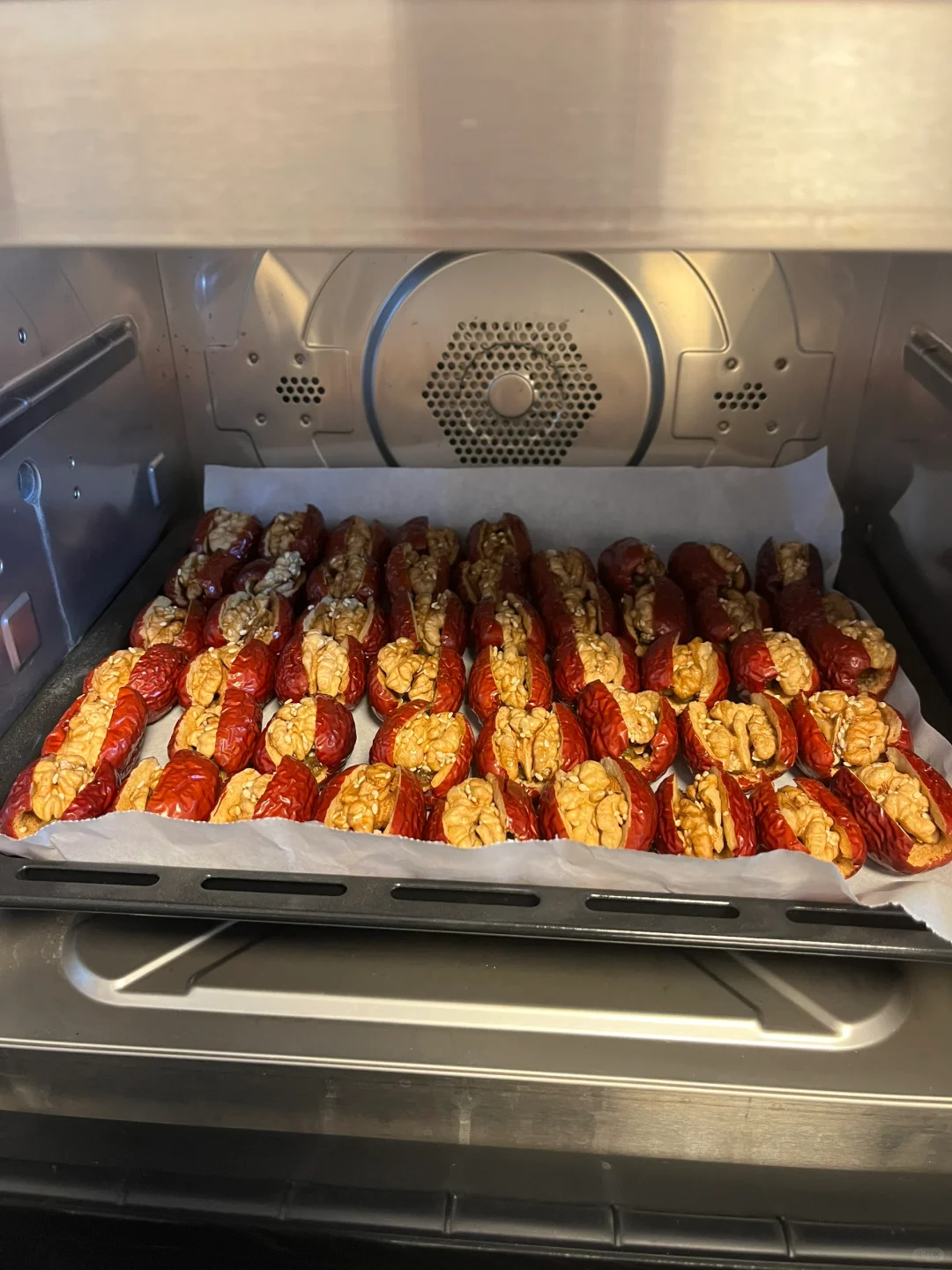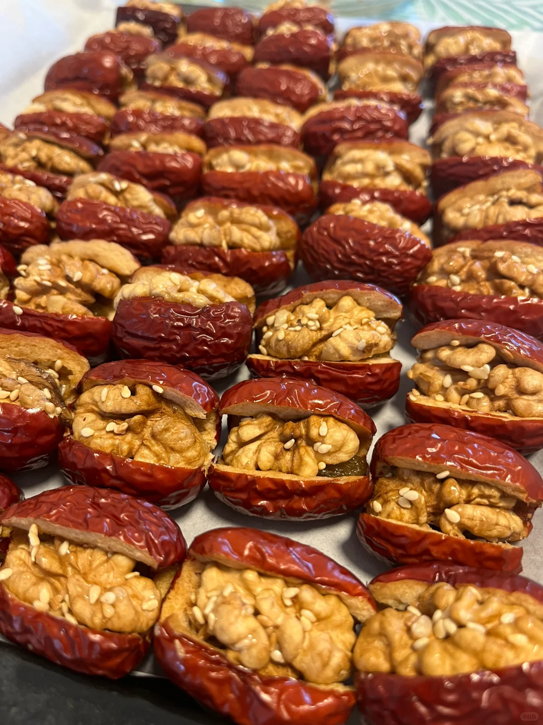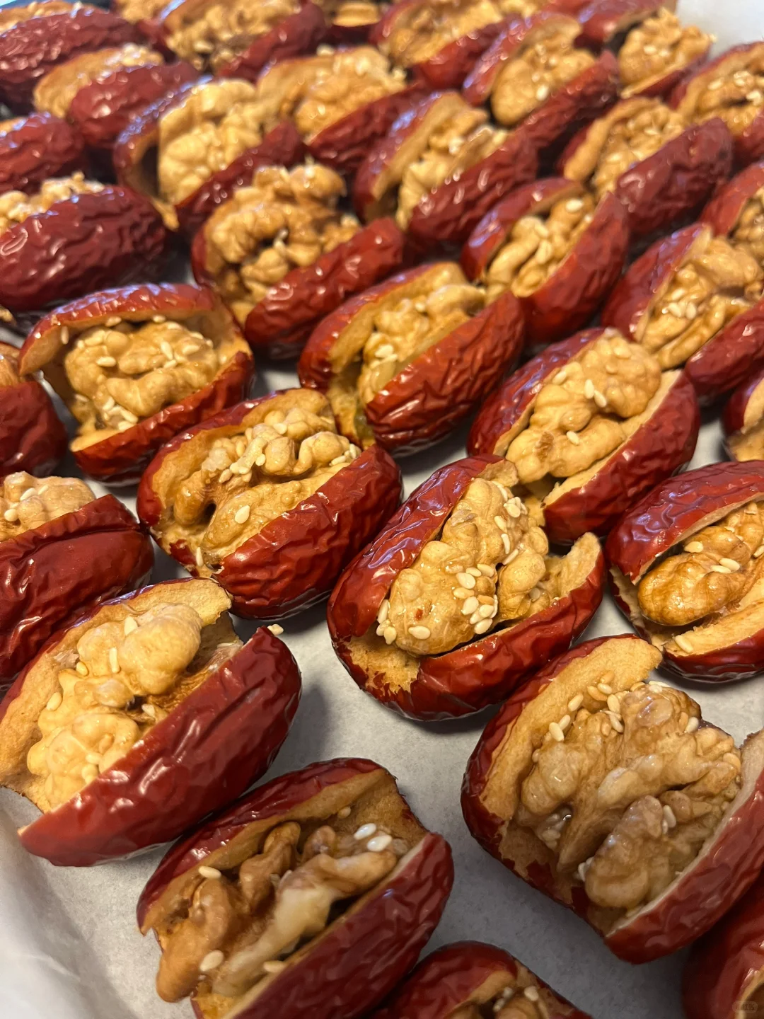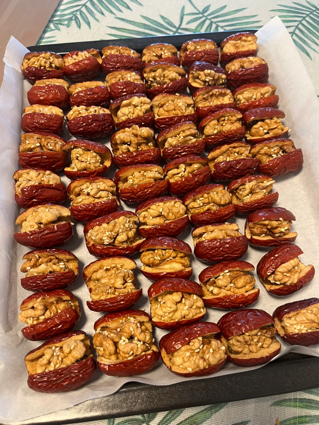 枣夹核桃的用料: 红枣50颗 核桃仁50粒 葡萄干100粒 白芝麻一小把 蜂蜜少量,为了使白芝麻能沾在核桃上 枣夹核桃的做法: 红枣洗净晾干去核,剪开 葡萄干开水洗一下用厨房纸吸干水分 将核桃仁、葡萄干,白芝麻,蜂蜜一起拌一下 将葡萄干、核桃仁塞进红枣 烤箱160度,烤八分钟 注:我用的是若羌枣,枣不大,所以每颗核桃仁是将一整瓣的核桃仁剪对开了。如果用和田大枣,可以将整瓣的核桃仁塞入大枣。