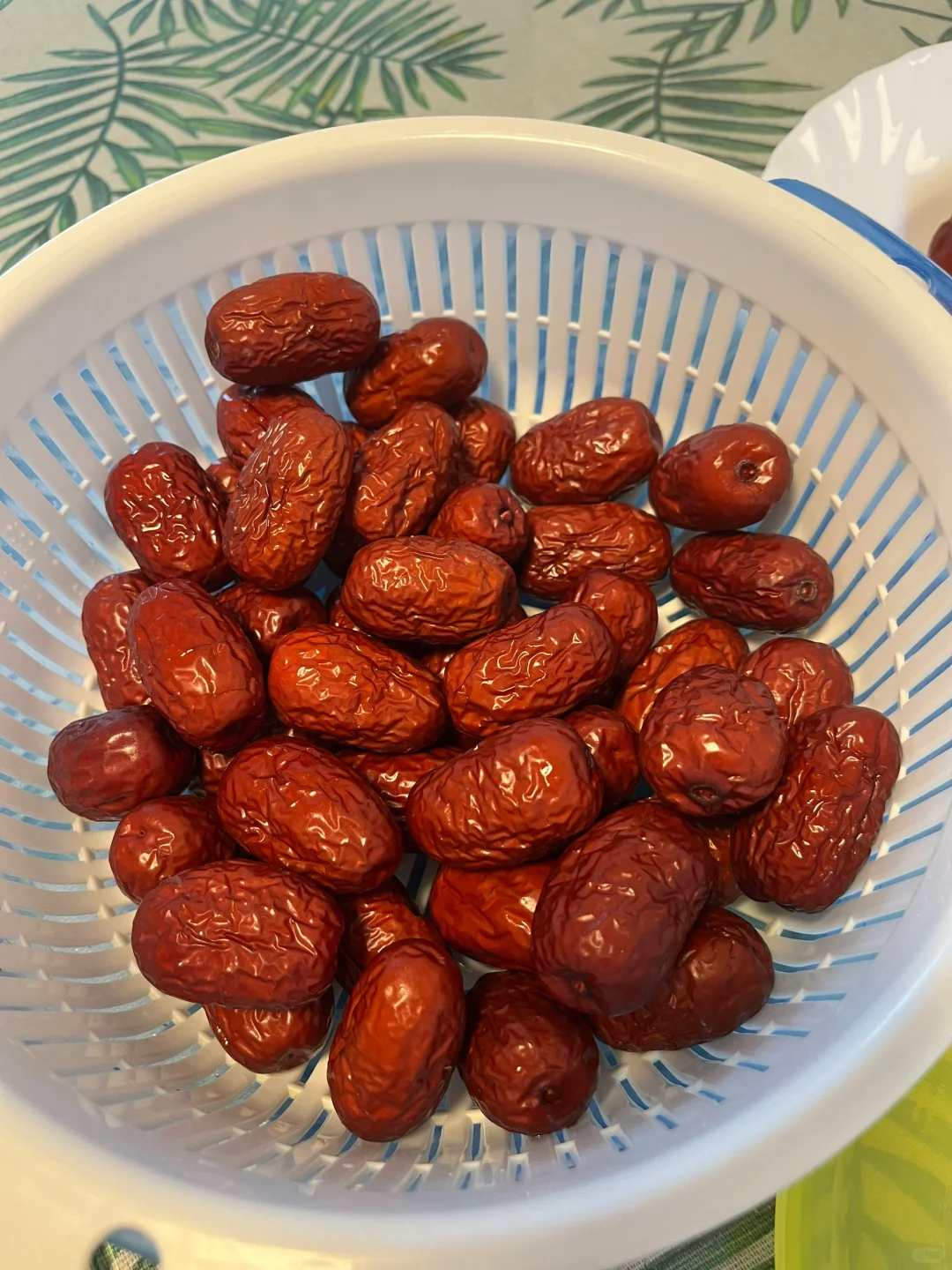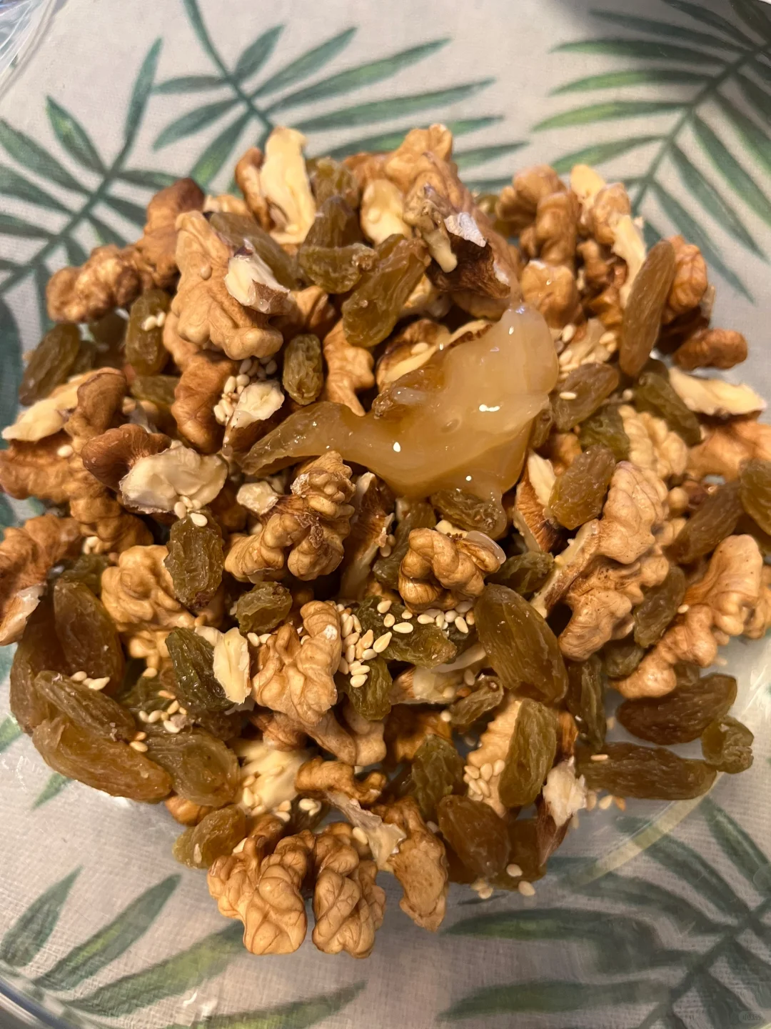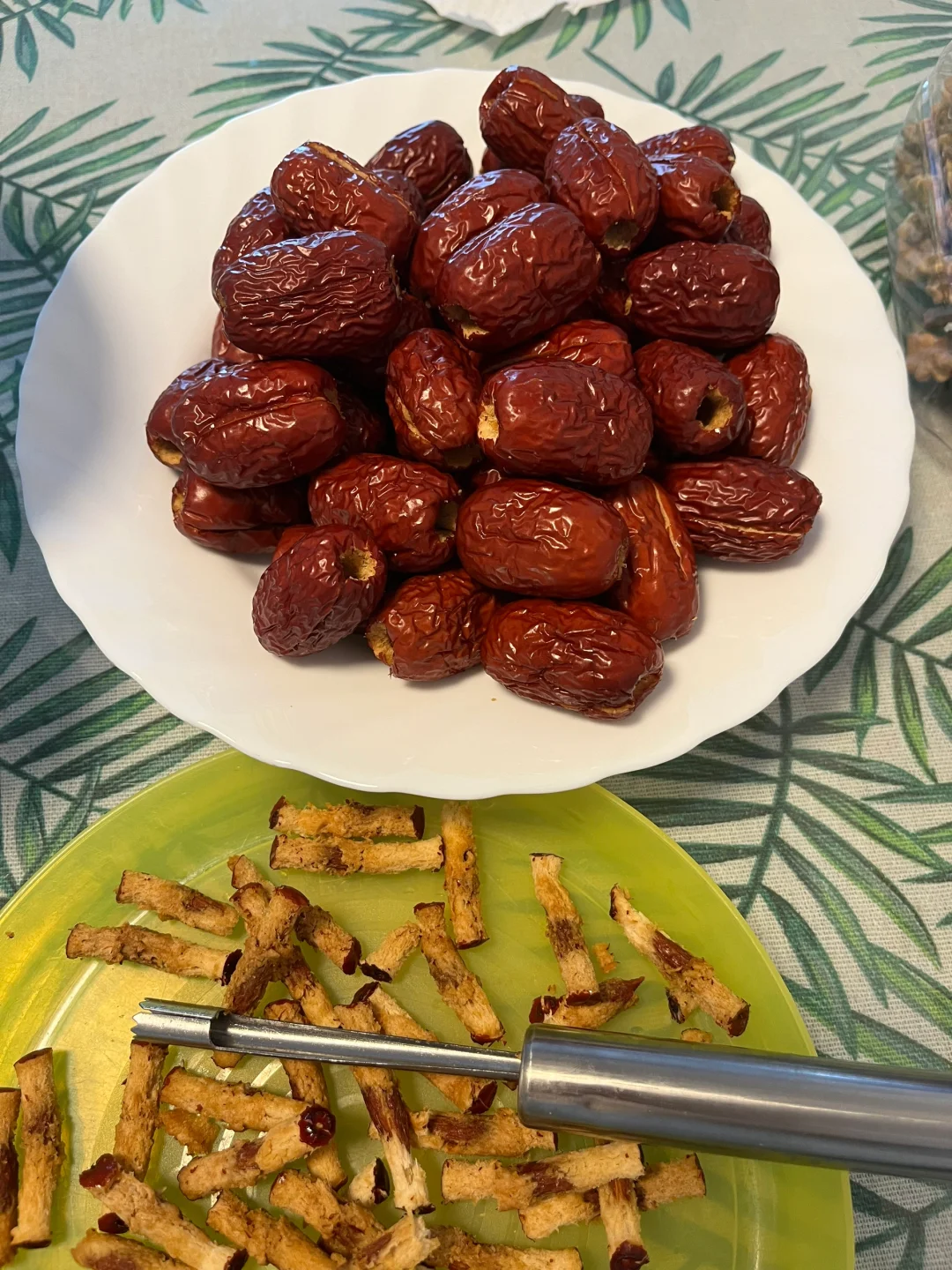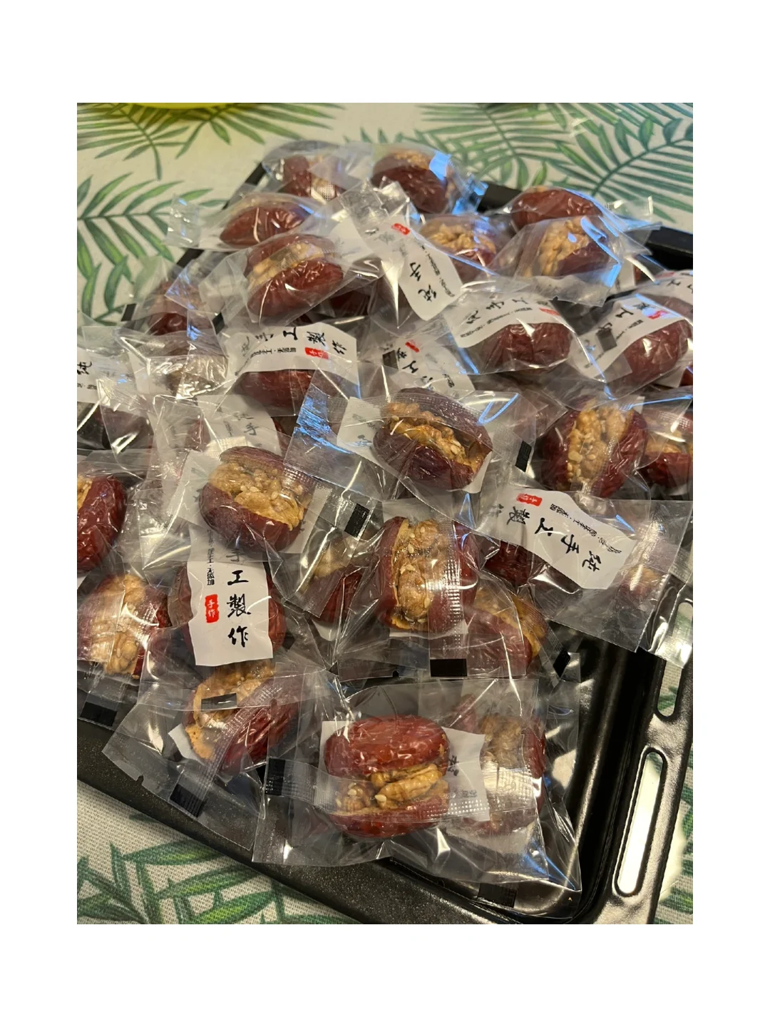 枣夹核桃的用料: 红枣50颗 核桃仁50粒 葡萄干100粒 白芝麻一小把 蜂蜜少量,为了使白芝麻能沾在核桃上 枣夹核桃的做法: 红枣洗净晾干去核,剪开 葡萄干开水洗一下用厨房纸吸干水分 将核桃仁、葡萄干,白芝麻,蜂蜜一起拌一下 将葡萄干、核桃仁塞进红枣 烤箱160度,烤八分钟 注:我用的是若羌枣,枣不大,所以每颗核桃仁是将一整瓣的核桃仁剪对开了。如果用和田大枣,可以将整瓣的核桃仁塞入大枣。