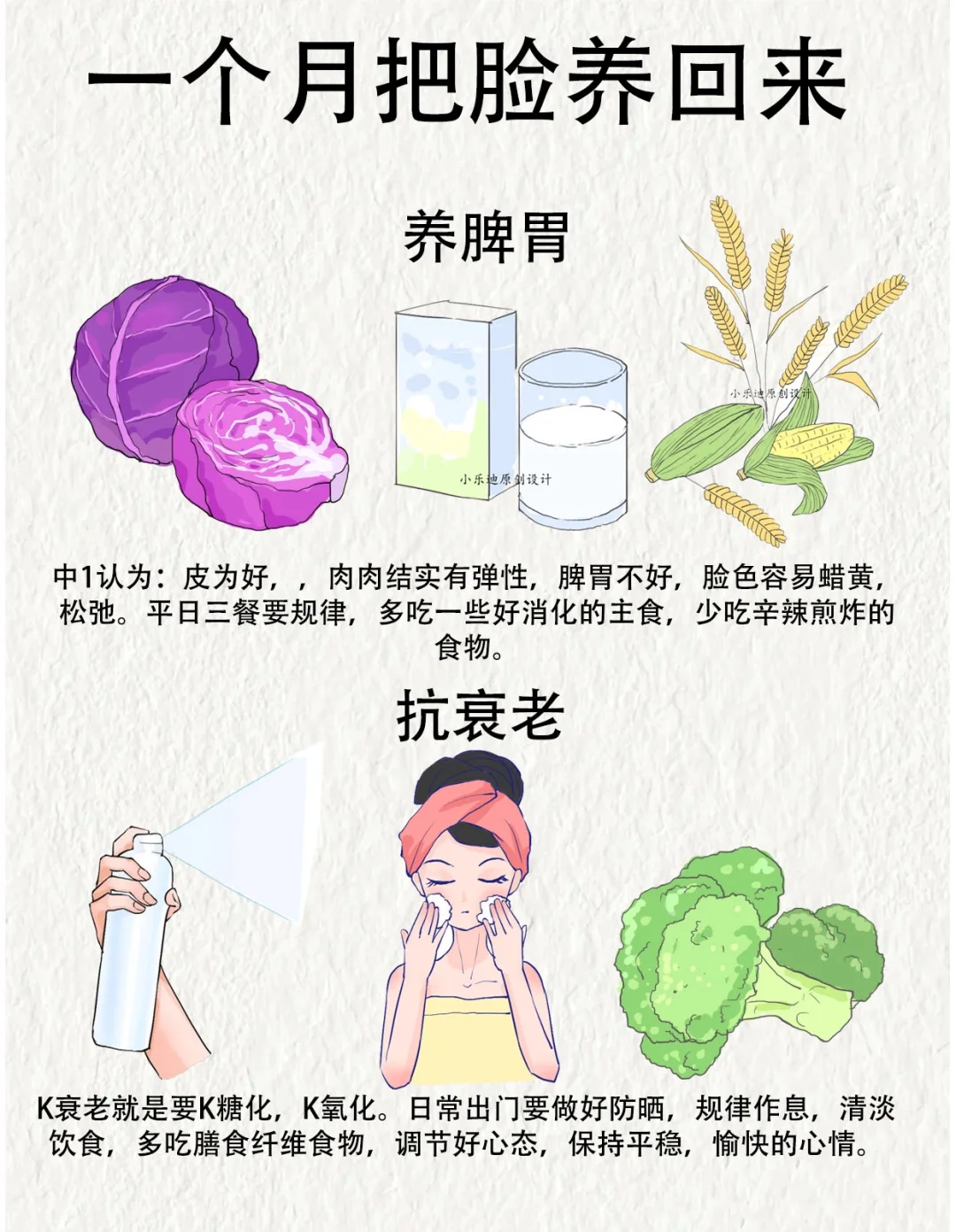 一个月把脸养回来 有人说美人在骨不在皮,但我认为骨相在好的女生,也扛不住脸上暗黄脸上密密麻麻的小瑕疵,干裂的皮肤,厚厚的粉底液也掩盖不住脸上的瑕疵。都多多少少影响整体的美感,颜值被拉低。 对于五官比较普通的女生,皮肤透亮,白里透红,近看没有什么痘痘和斑~点。整个人看上去精气神十足,状态特别好,颜值提~升了好几个度。 从今天开始,从现在开始,把脸养干净,把漂亮养回来 从养气血,祛~痘,美~白,去湿气,养脾胃,抗衰老开始。坚持一个月,皮肤变好了,整个人精神气十足,脸养回来了。