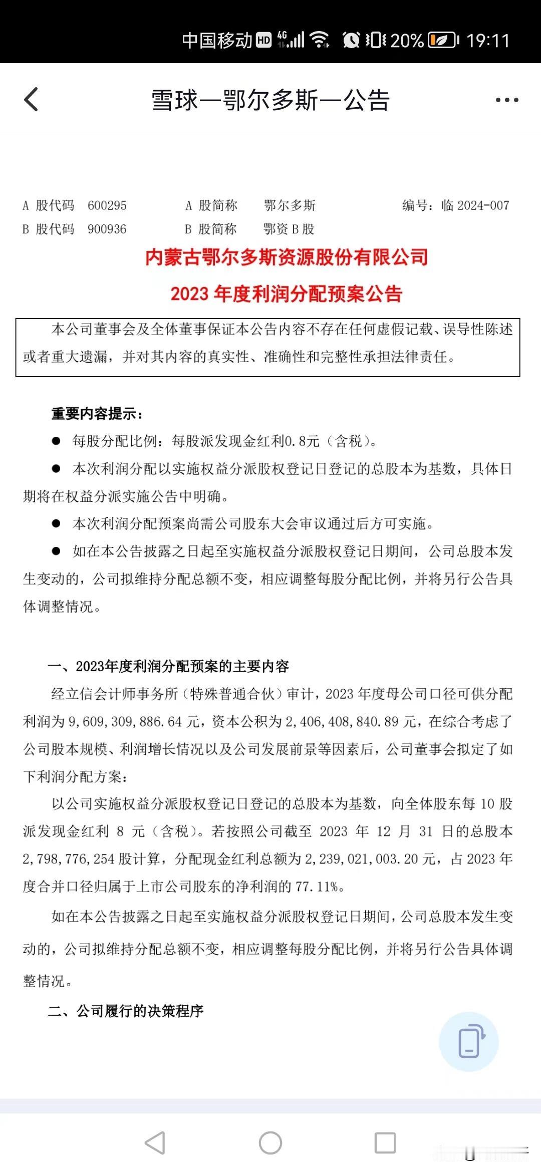 本人持有的鄂尔多斯B股(鄂资B),刚刚发布2023年度分红预告(详见图4),2023年可分配净利润的77%全部用来分红,每股分红0.8元人民币,折合0.11美元每股。 本人持有4000股,成本0.909美元,股息率12%,股市投资,赚取分红的钱才是王道!B股分红,好比桶里打鱼!稳稳的幸福! 今天上午操作,按照0.11美元每股,4000股分440美元,利用现有账户余额继续在0.978买入500股,对于鄂尔多斯这只股票,整个24年操作结束,后续分红到账,留作备用金。 鄂尔多斯投资逻辑: 鄂尔多斯,也是管理层非常厚道善待股民的一家上市公司,硅铁、羊绒规模均是世界前列,自有煤矿,烧煤发电搞化工,搞钢铁冶炼,成本比同行业低很多;缺点是周期性行业,一个大周期大致三到五年;目前B股不到1美元的股价,低估。 #分享股市的幸福时刻##股市分析##期待A股雄起#