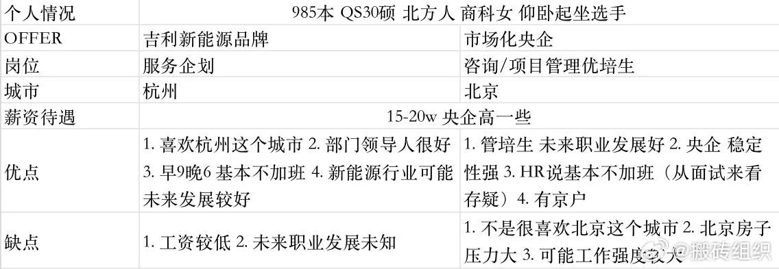 1⃣优缺点其实比较明显,吉利那边胜在行业还可以+杭州区域OK,央企那边胜在稳定性+待遇+户口,从目前环境和确定性来讲,央企的优势还比较大的,这年头有20w+户口的央企其实进去难度系数不小的;