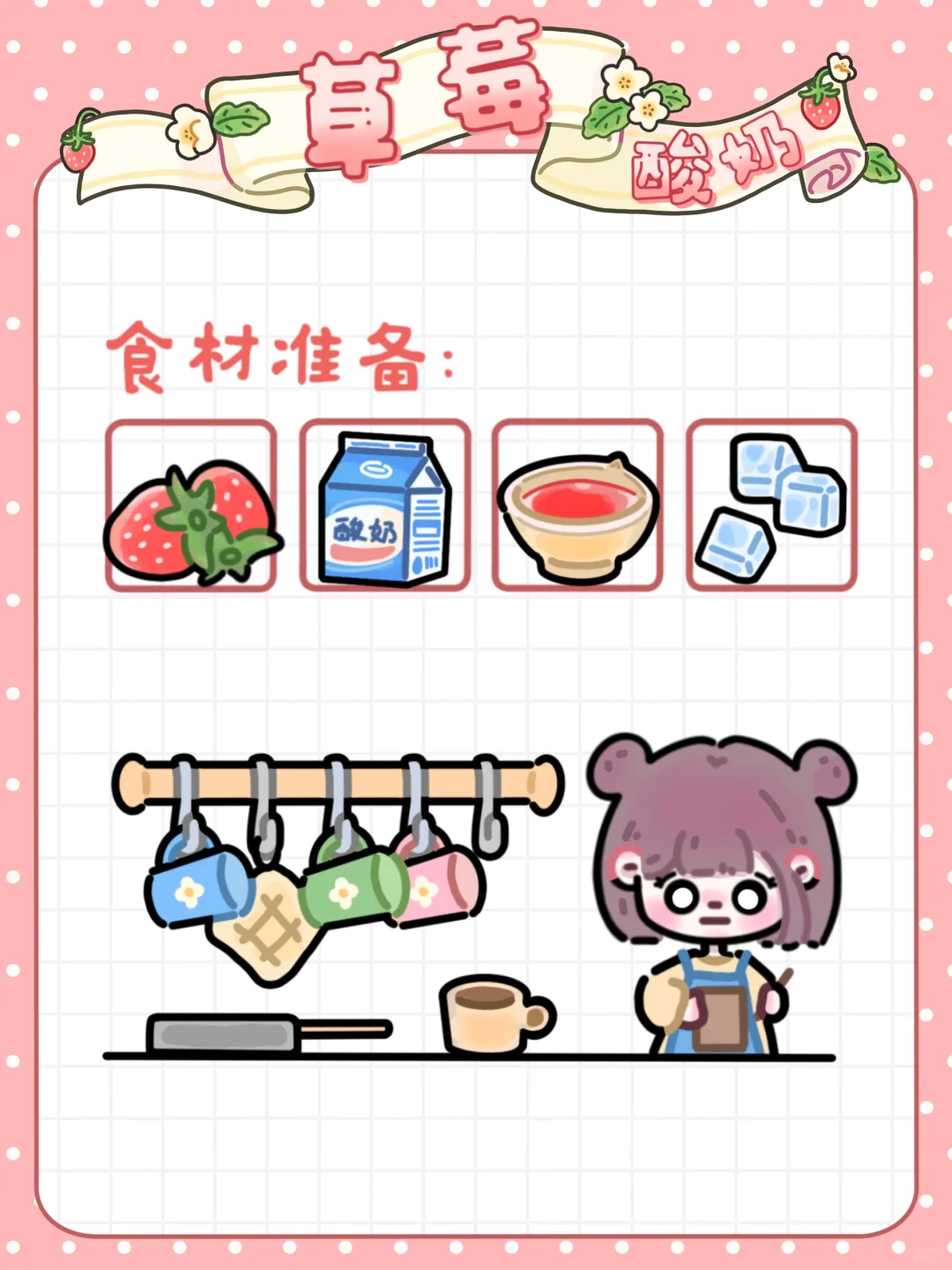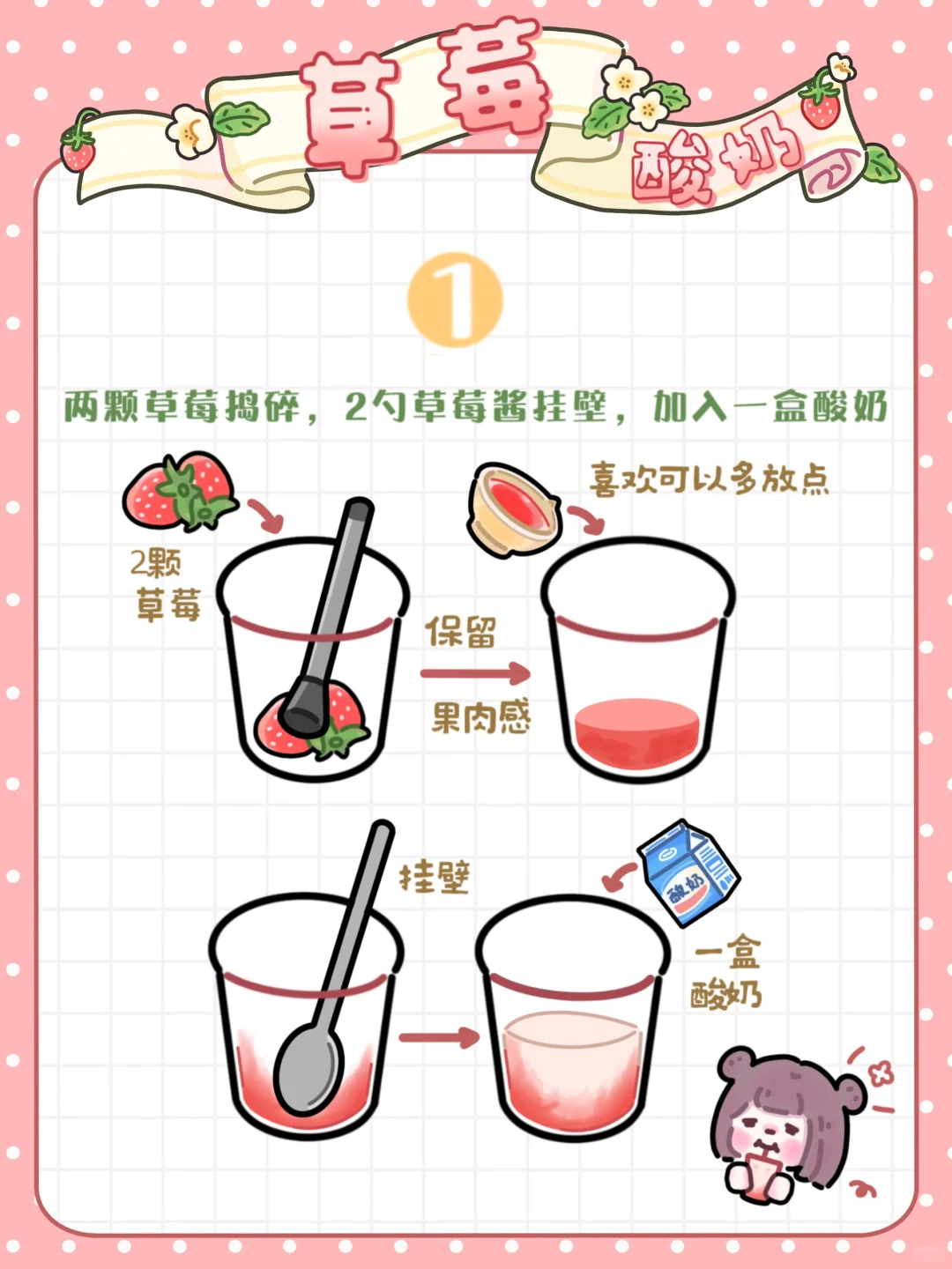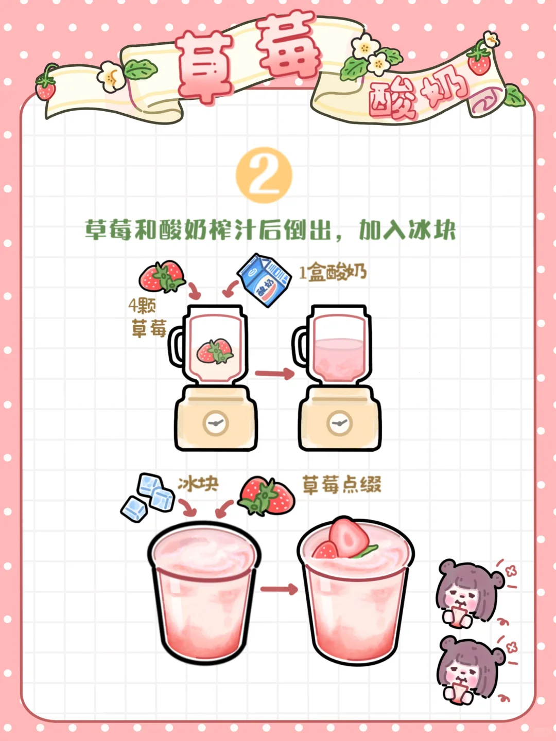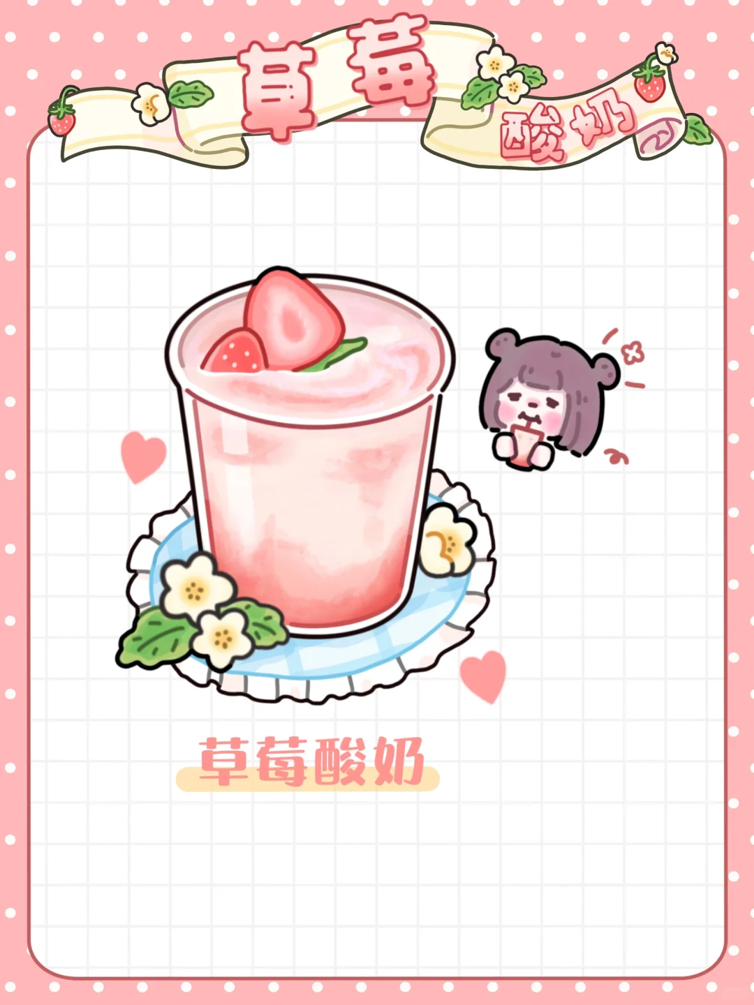 Hi!这里是小羊柚柚~ 今日份丝滑浓郁的草莓酸奶🍓来喽!年前报了银河特快老师的团练,但素到现在才开始学起来😭于是用特快老师的风格重新设计了模版(好喜欢特快老师的画风 超级可爱 但素我的感觉怎么都抓不到老师的精髓 不过已经比之前好看很多了👍) 之前的画风其实就是简单的线条和铺色(纯属乱画)不是很适合画饮品🧃会不太好看,终于设计出了自己满意的饮品版式(后面会多更饮品 甜品🍧喽~) - 🥣食材准备 草莓🍓|酸奶🥛|草莓酱|冰块🧊 - 👉制作步骤 1️⃣两颗草莓🍓压碎(不用太碎 保留果肉的口感),加入两勺草莓酱🥄挂壁,加入一盒酸奶🥛(草莓和草莓酱可以根据自己的喜好调整) 2️⃣四颗草莓🍓和一盒酸奶加入榨汁机,榨成草莓奶昔后倒入之前的杯中,加入冰块🧊和草莓🍓点缀(冰块可以不加 但是个人觉得冰的更好喝👍) - 🌟小tips 最近一直在研究周边的东西,突发奇想有了很多灵感,后面也会开一些特别的系列美食手册📖(总之之前有点无脑画 后面想多加一些自己的思考和设计进去💖融入很多想法和灵感💡 不然自己画的也没有激情❤️‍🔥大家看多了也容易审美疲劳😪) 有一说一草莓酸奶真的太好喝了‼️不过我不太喜欢太甜的东西 如果大家喜欢很甜的可以多放一点草莓果酱哦~ - 感谢喜欢💕我们下期见喽~ 欢迎👏点菜