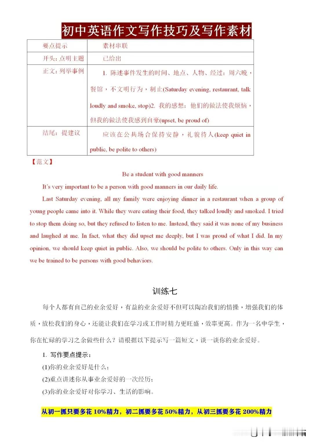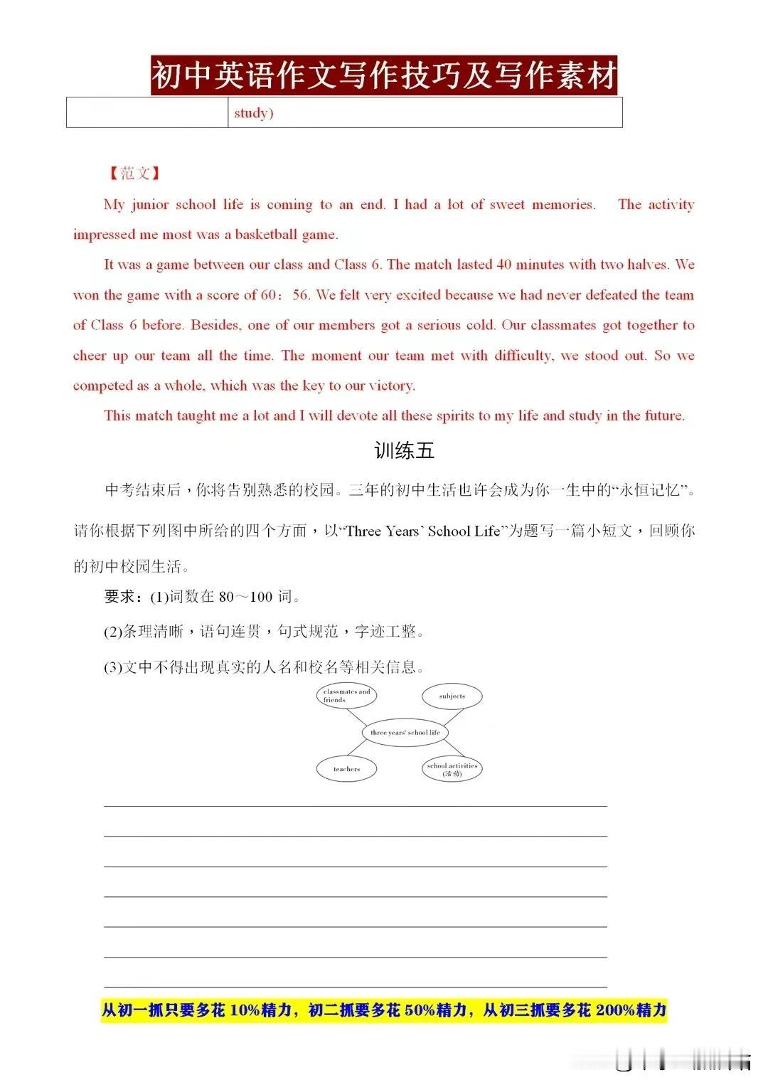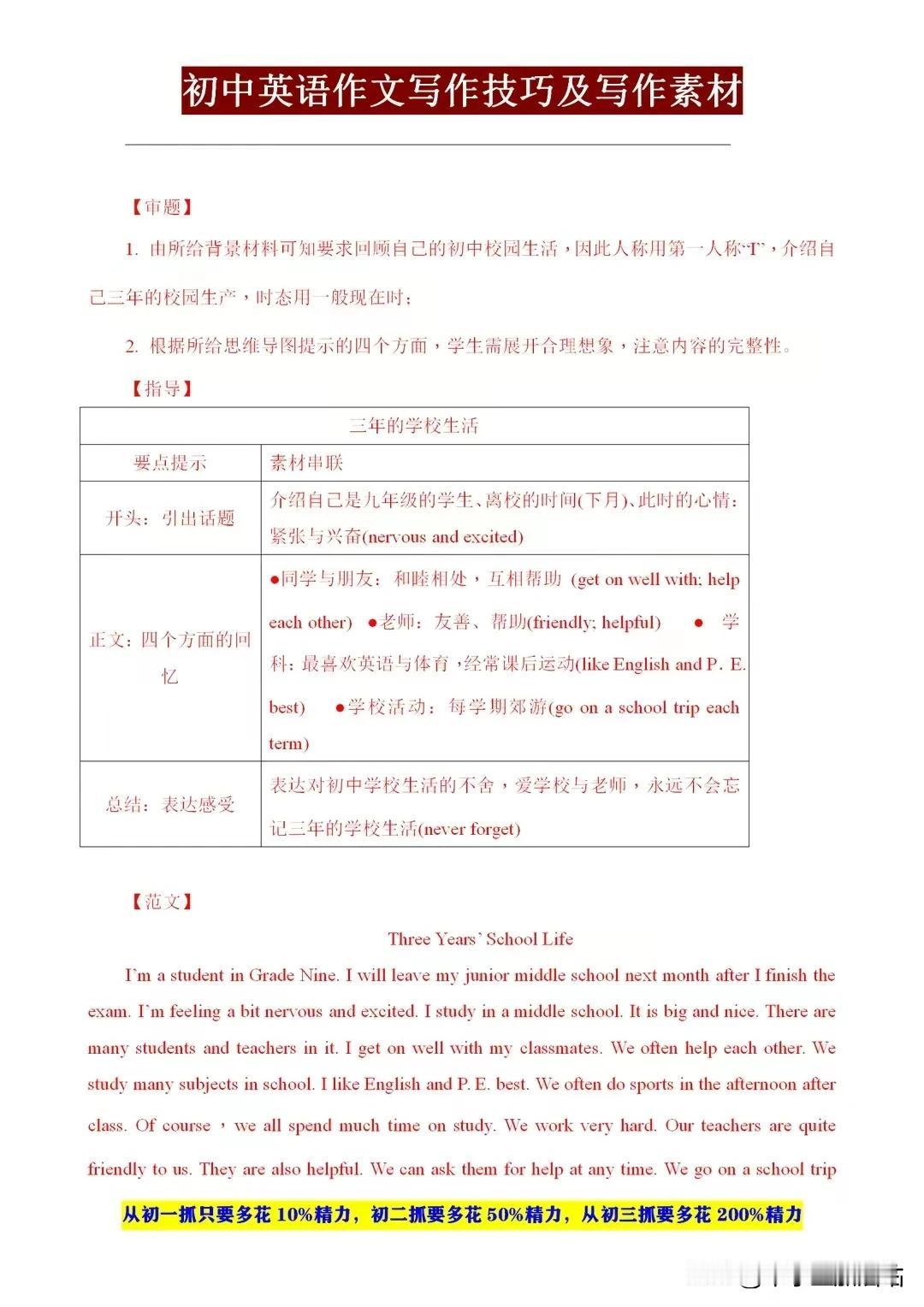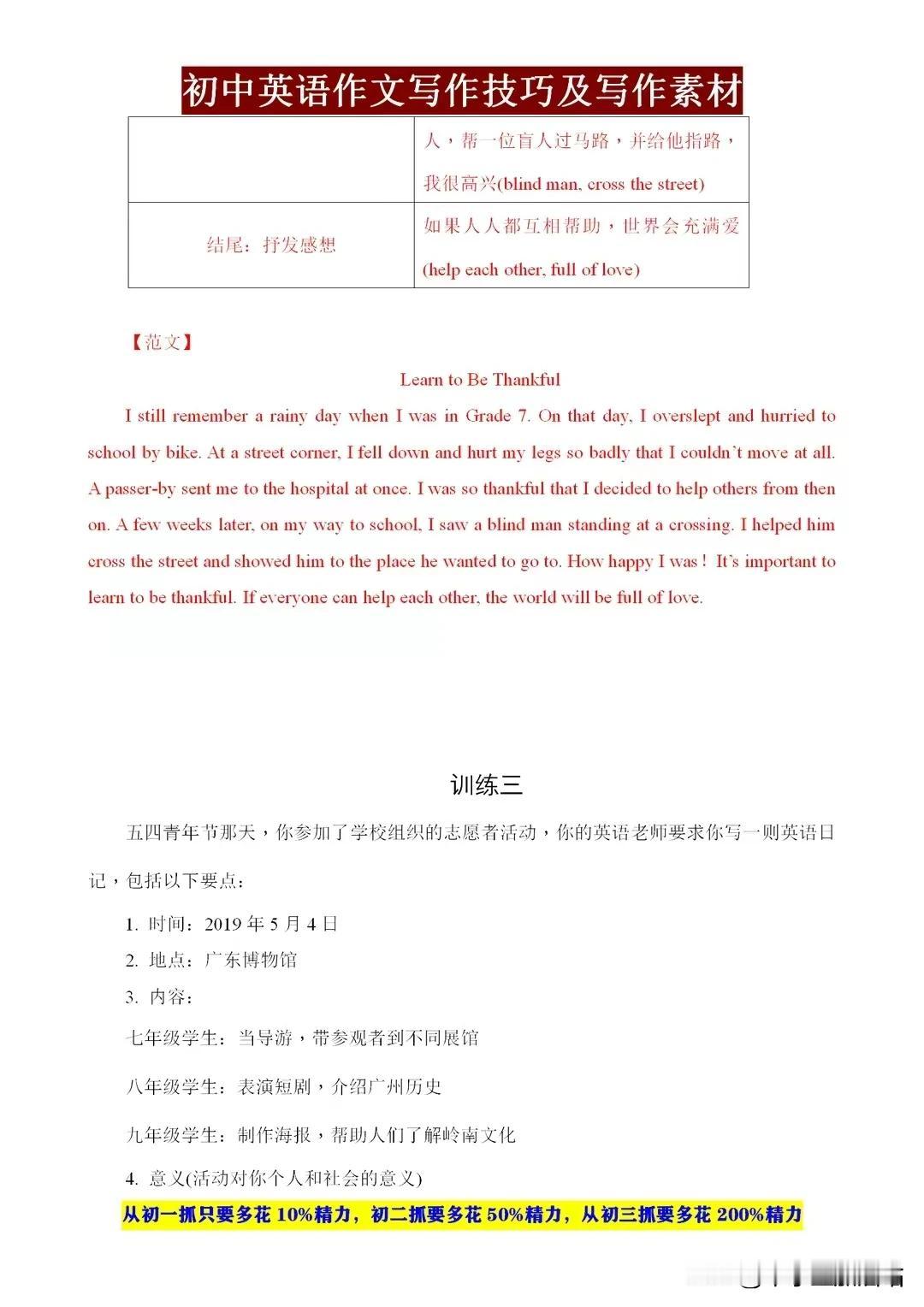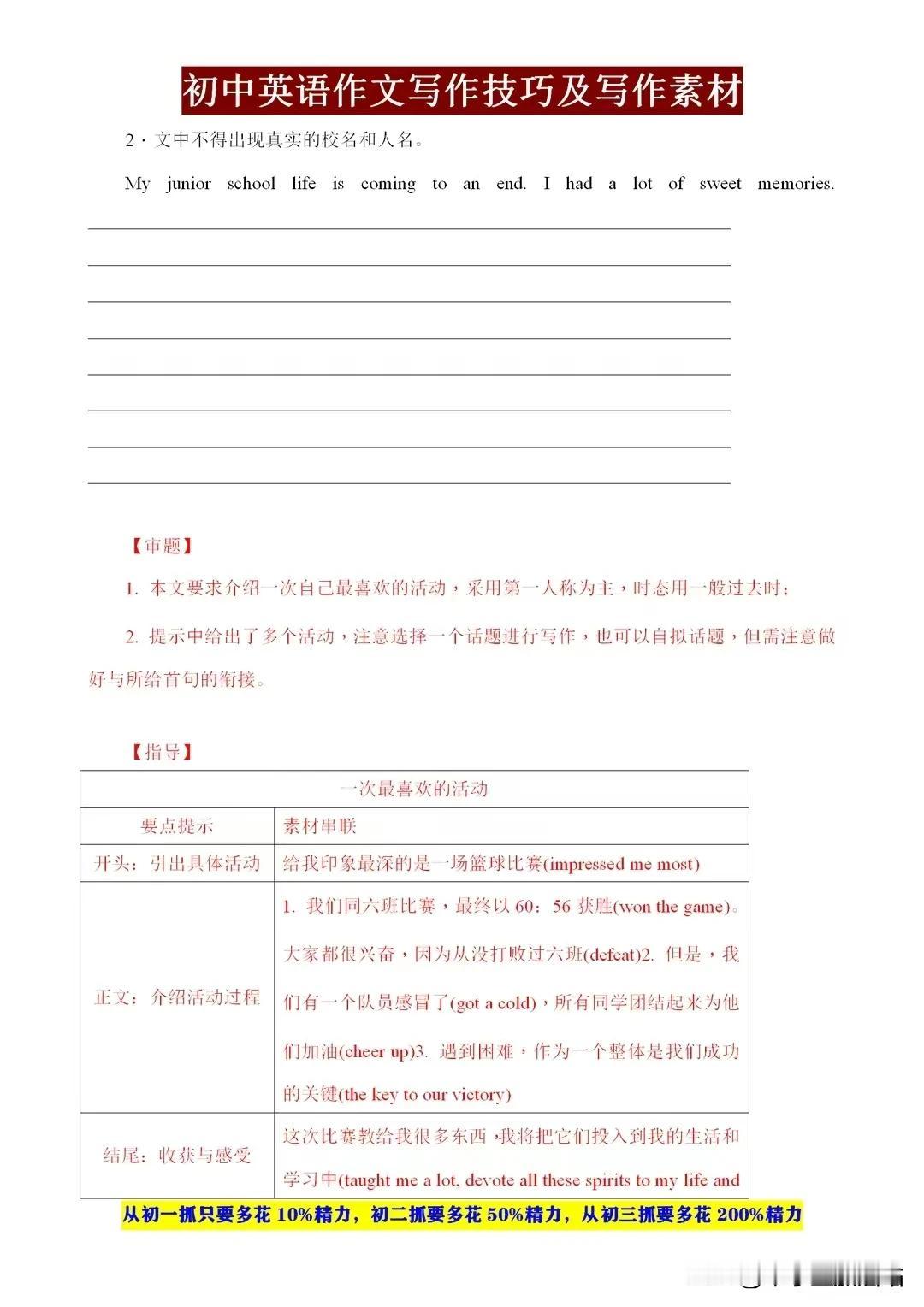 初中英语作文写作技巧与写作素材,写好作文,这些积累必不可少! 初中英语作文,技巧与素材并重。首先,掌握基本句型,学会运用复杂句式,让文章更富层次。其次,注意段落安排,开头引人入胜,中间论证充分,结尾简洁明了。此外,积累常用词汇和短语,丰富语言表达。在素材方面,关注生活点滴,留心身边人和事,这些都是写作的灵感源泉。同时,阅读优秀范文,学习其写作风格和表达方式,提升自己的写作水平。记住,多写多练,才能写出优秀的英语作文!