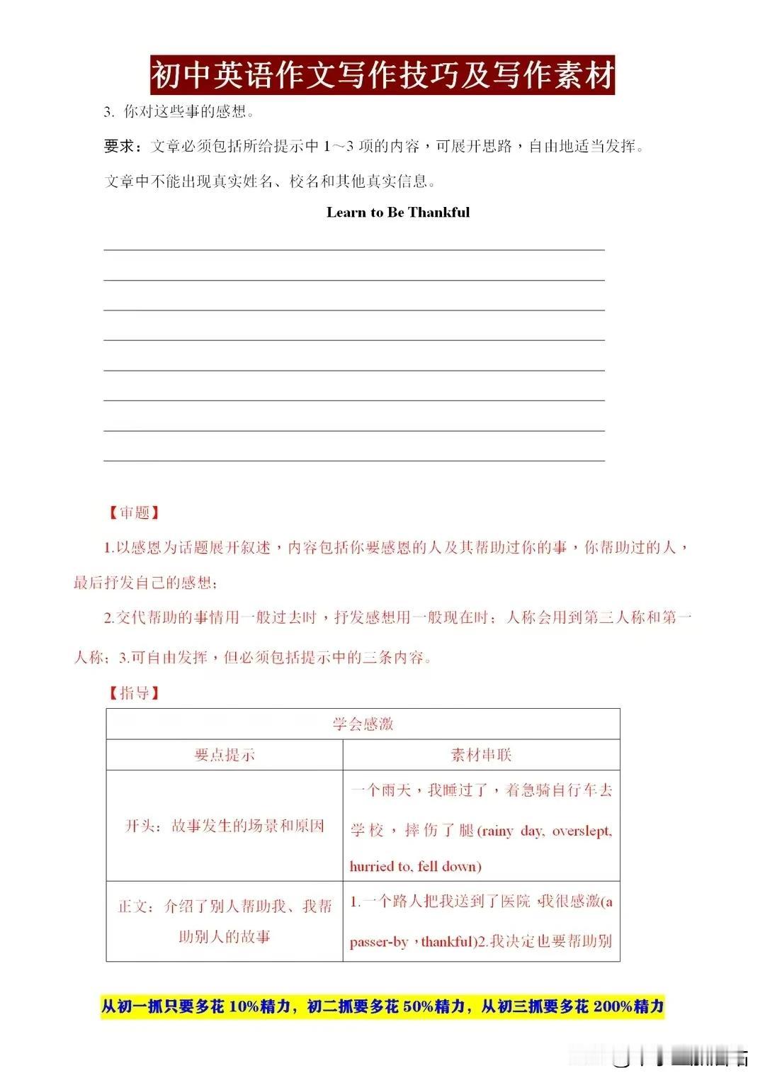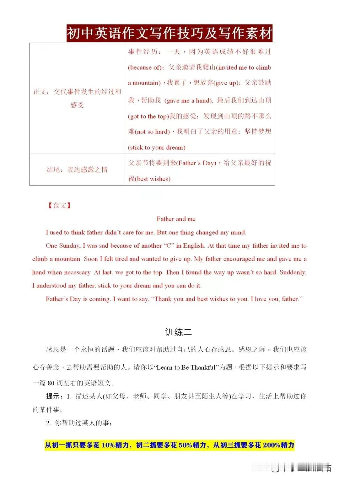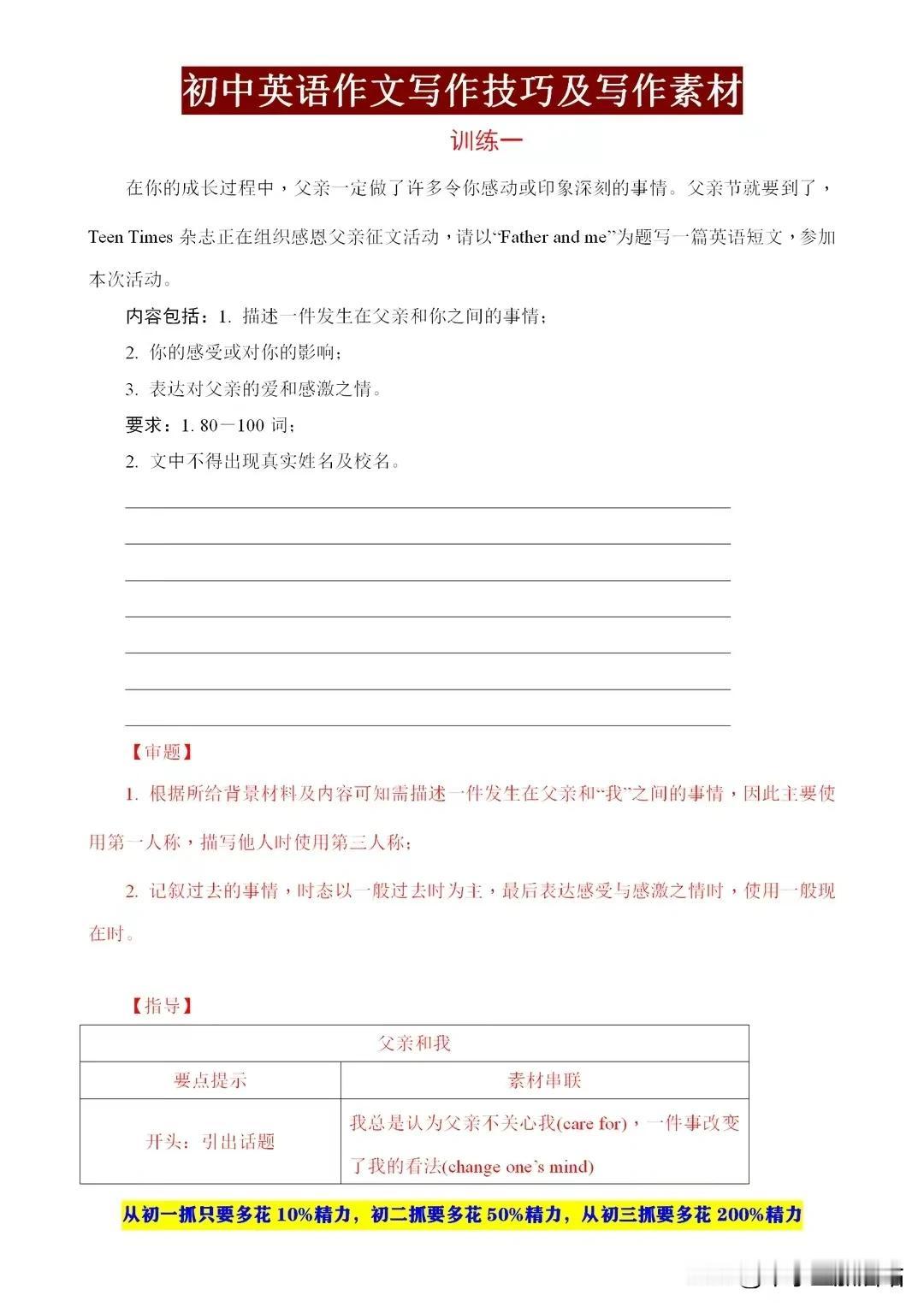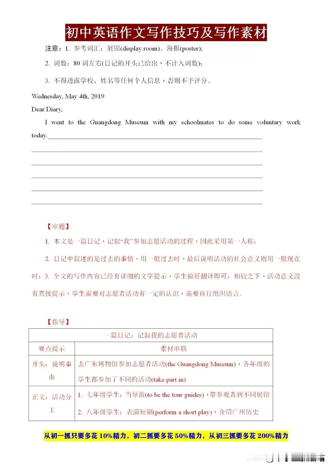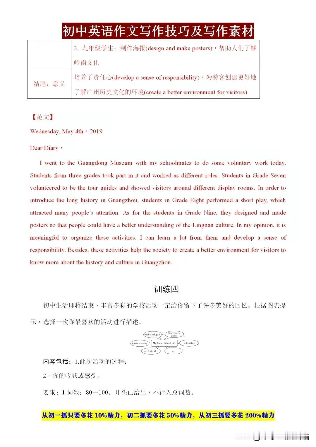初中英语作文写作技巧与写作素材,写好作文,这些积累必不可少! 初中英语作文,技巧与素材并重。首先,掌握基本句型,学会运用复杂句式,让文章更富层次。其次,注意段落安排,开头引人入胜,中间论证充分,结尾简洁明了。此外,积累常用词汇和短语,丰富语言表达。在素材方面,关注生活点滴,留心身边人和事,这些都是写作的灵感源泉。同时,阅读优秀范文,学习其写作风格和表达方式,提升自己的写作水平。记住,多写多练,才能写出优秀的英语作文!
