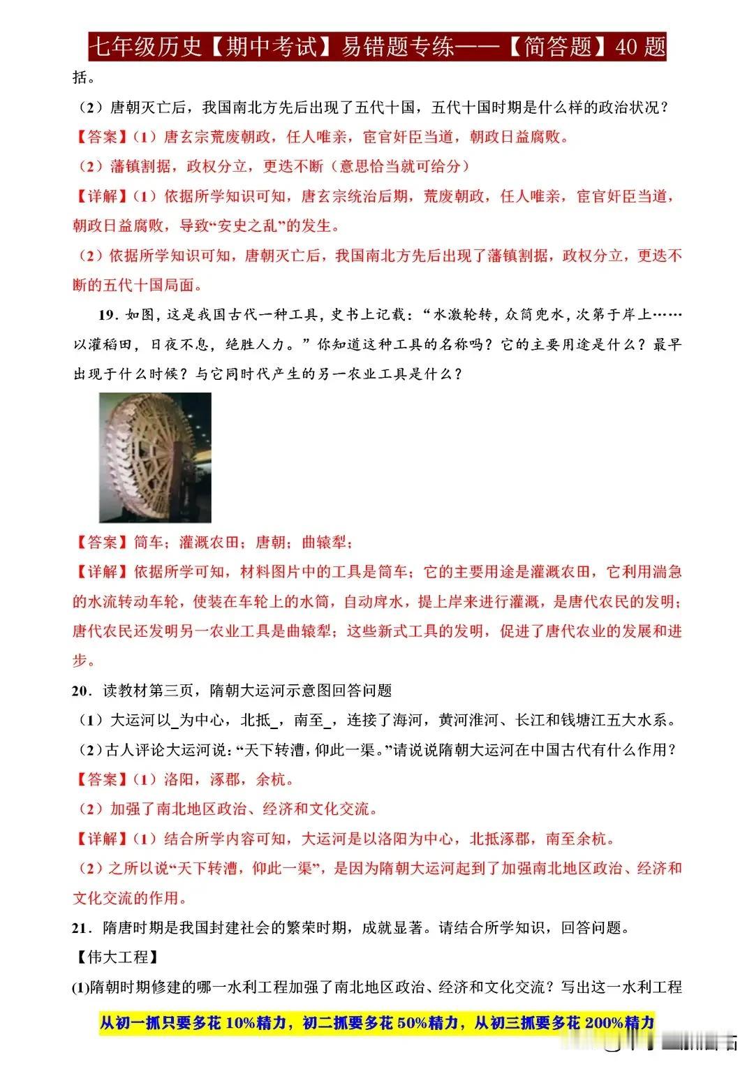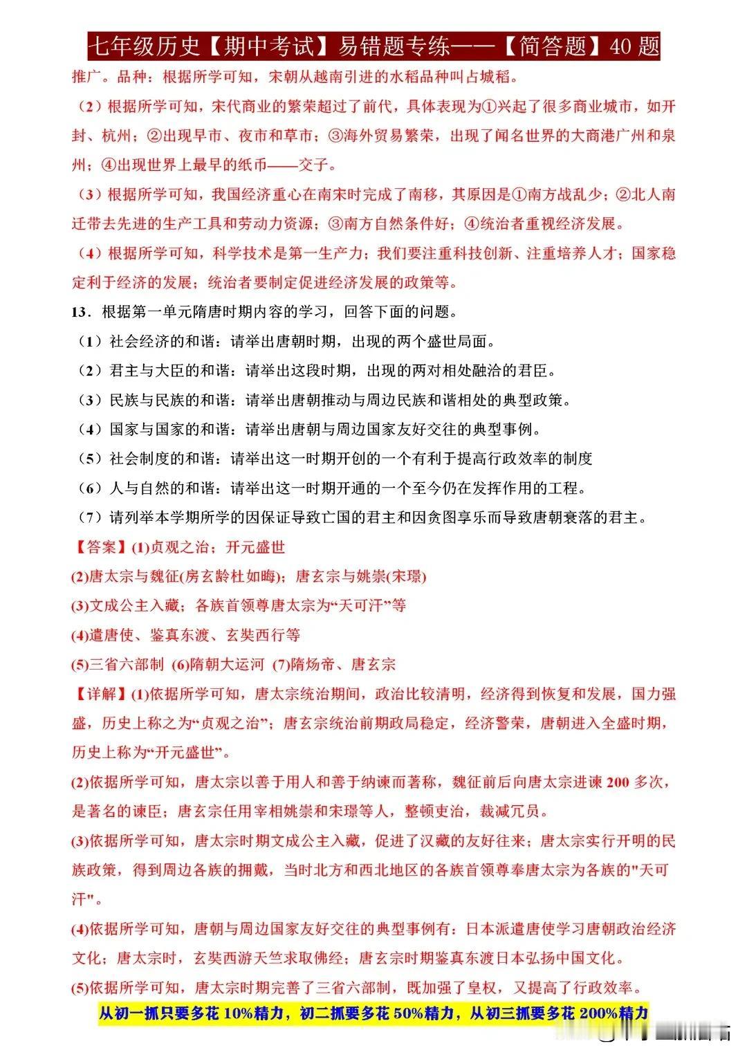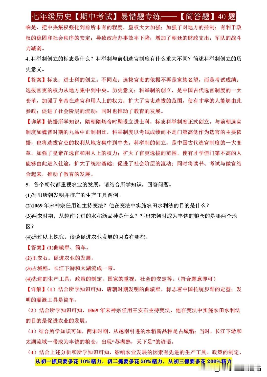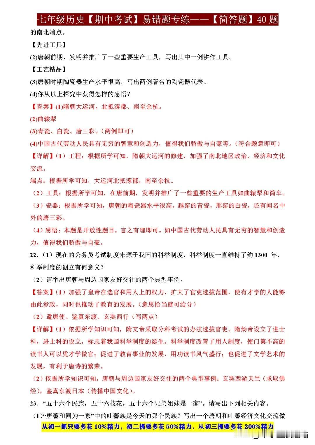 七年级历史期中考试易错题专练,历年考试扣分多的题,别再犯错了 七年级历史期中考试,易错题是复习的关键。历年考试中,学生们常常在一些细节和知识点上失分。为了避免重蹈覆辙,我们要针对这些易错题进行专项练习。通过反复做题、总结规律,加深对知识点的理解和记忆。 同时,要注重历史事件的关联性和整体性,避免孤立地记忆。在复习过程中,还可以借助图表、时间轴等工具,帮助梳理历史脉络。记住,历史不是孤立的,要将其与现实相联系,理解历史对我们今天的启示。只有这样,才能在考试中游刃有余,取得好成绩。