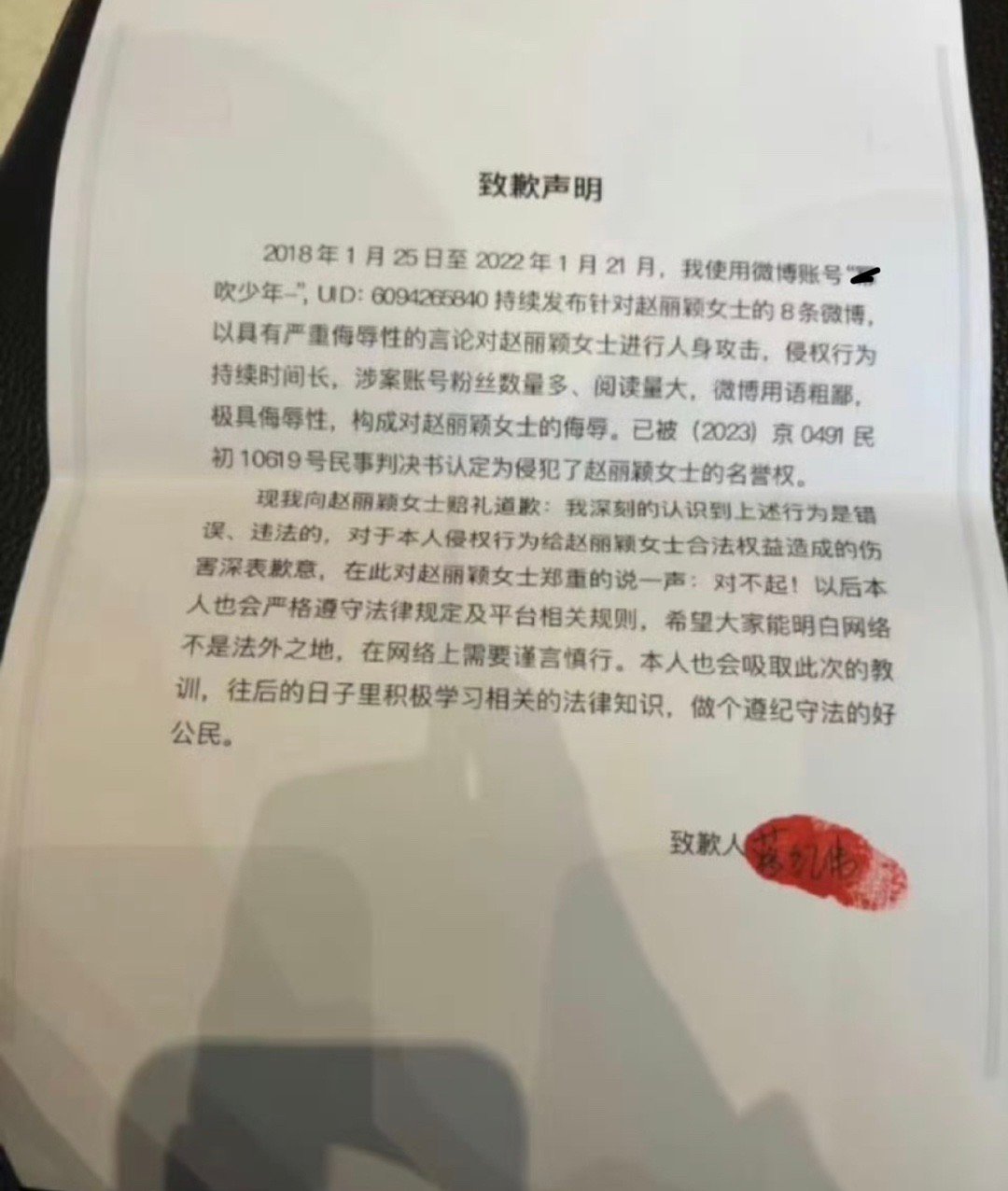 赵丽颖黑粉手写道歉信想赵丽颖道歉,置底一周