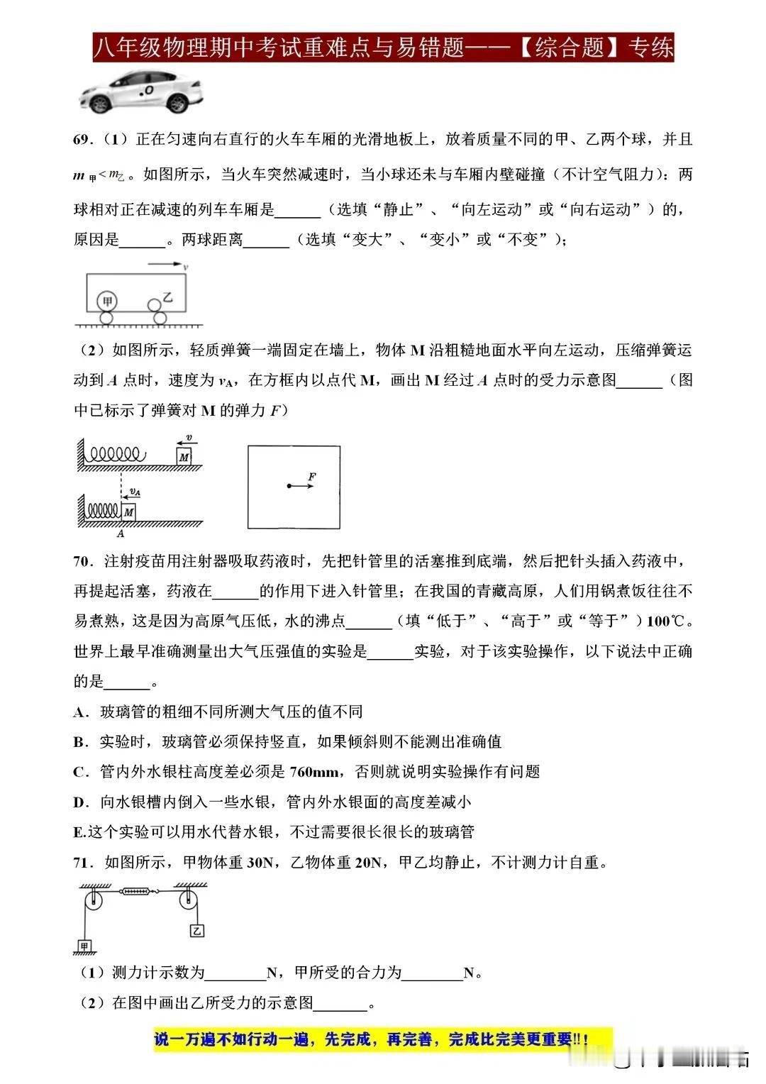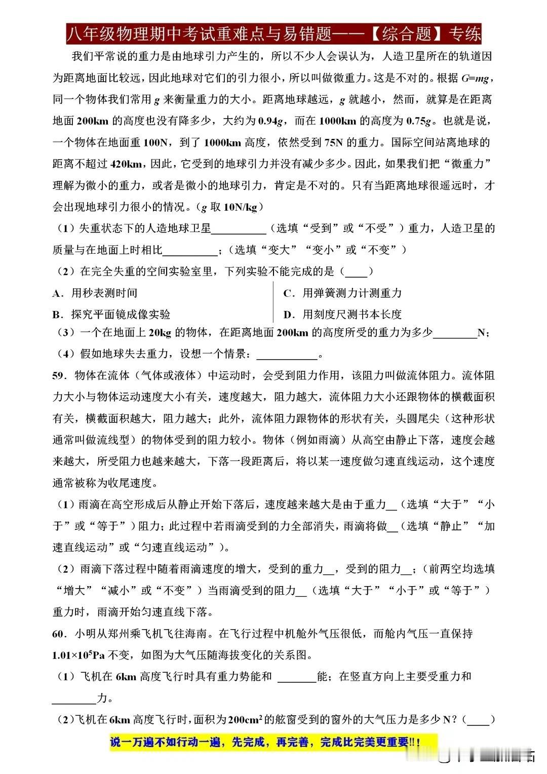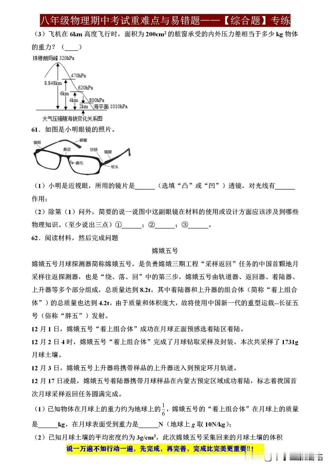 八年级物理期中考试重难点与易错题,这些才是拉开差距的关键! 八年级物理期中考试,重难点与易错题是拉开差距的关键。重力、浮力、压强等概念需深入理解,电路分析、光学原理应用也不容忽视。易错题往往藏在细节之中,如单位换算、公式应用等,需细心审题,避免失误。 要想在考试中脱颖而出,除了掌握基础知识,还需多做练习,尤其针对重难点和易错题进行强化训练。只有扎实基础,才能应对各种题型,取得优异成绩。 【左上角,点击我的“头像”,进入主页,有电子版获取方式】