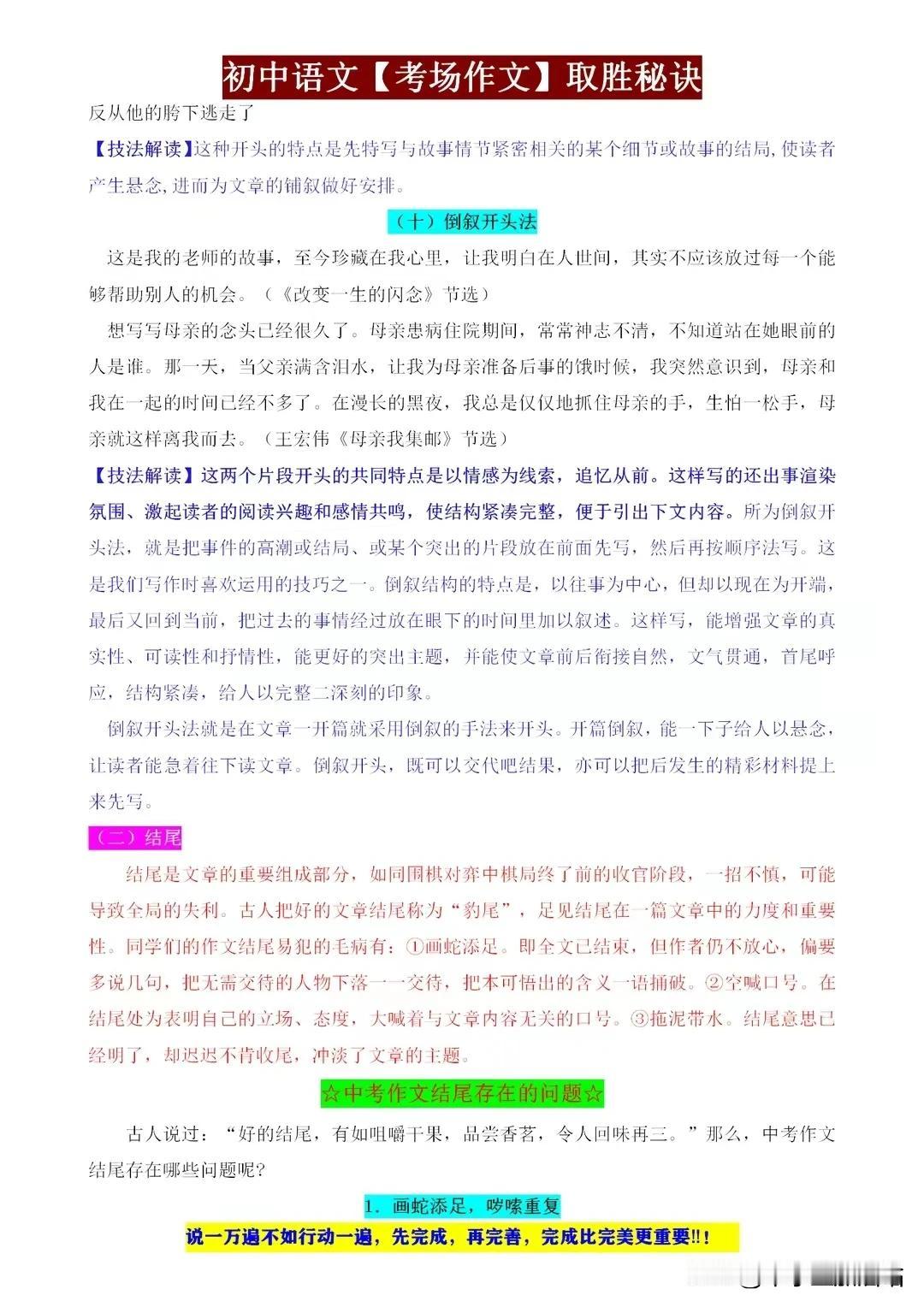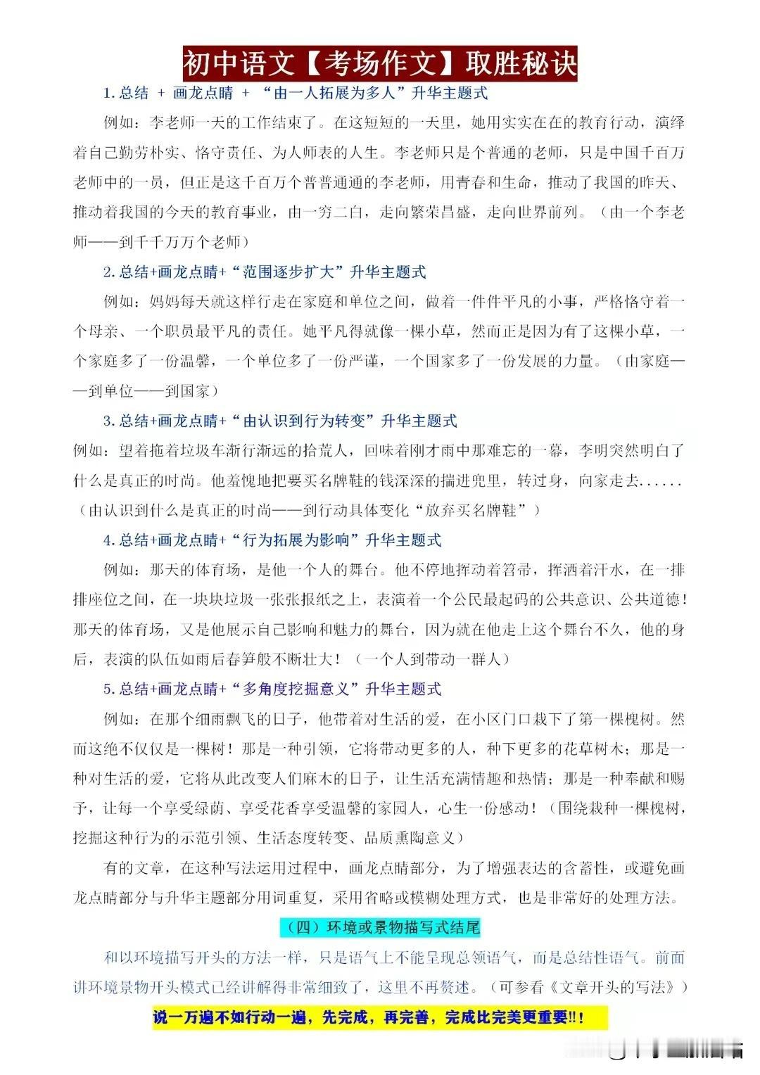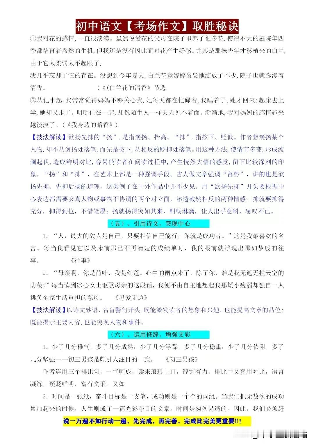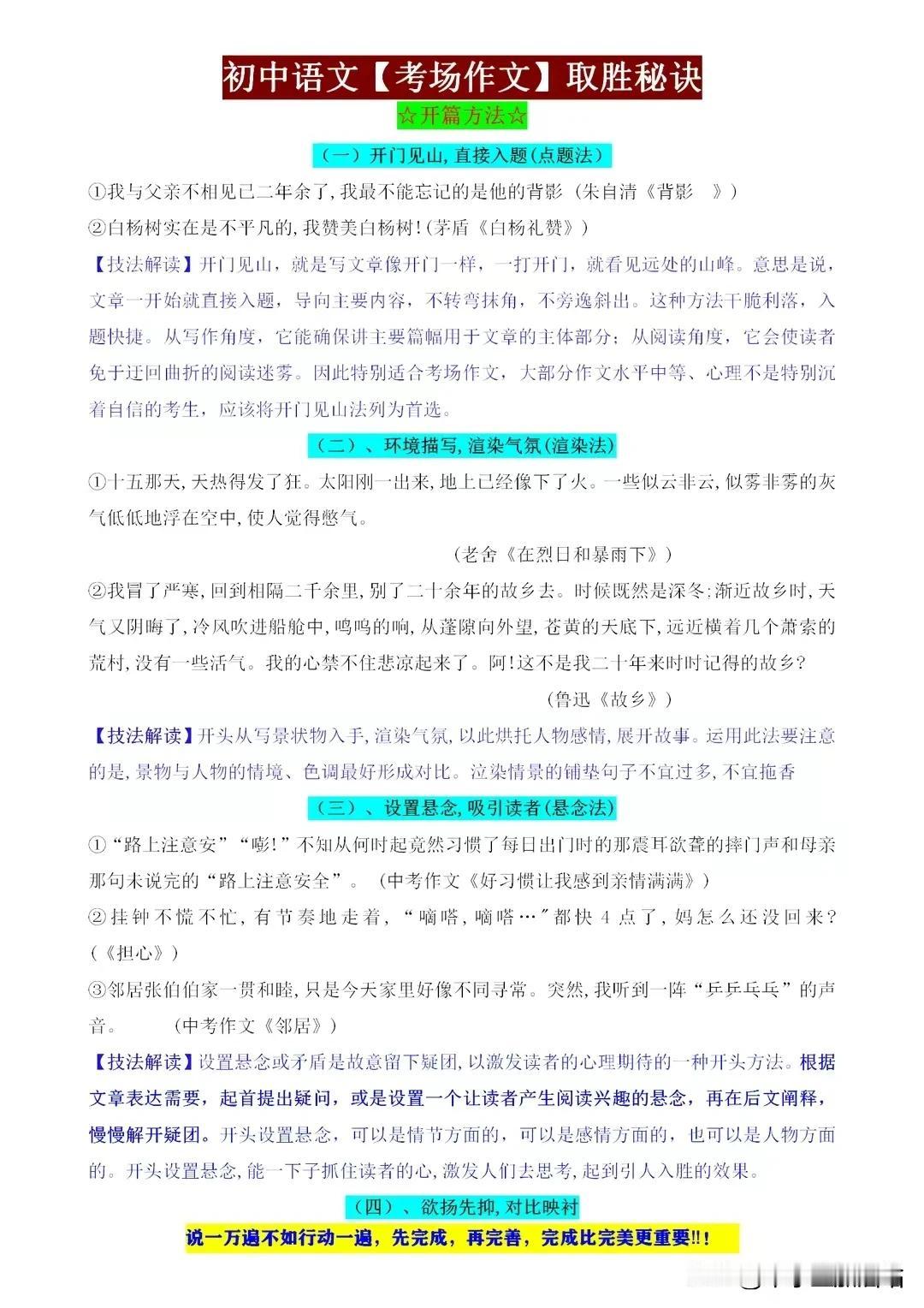 初中语文考场作文取胜秘籍,这些“细节”都是打动老师的得分点! 初中语文考场作文,取胜之道在于细节。开篇新颖,吸引眼球;结尾点睛,回味无穷。段落分明,逻辑清晰;词句优美,文采斐然。善用比喻、拟人,增强表达力;注重情感投入,真挚感人。 同时,紧扣主题,避免跑题;引用名句,彰显积累。字迹工整,卷面整洁,更是加分项。记住,细节决定成败,作文亦如此。用心打磨每一个细节,定能让你的作文脱颖而出,打动老师,赢得高分! 【左上角,点击我的“头像”,进入主页,有电子版获取方式】