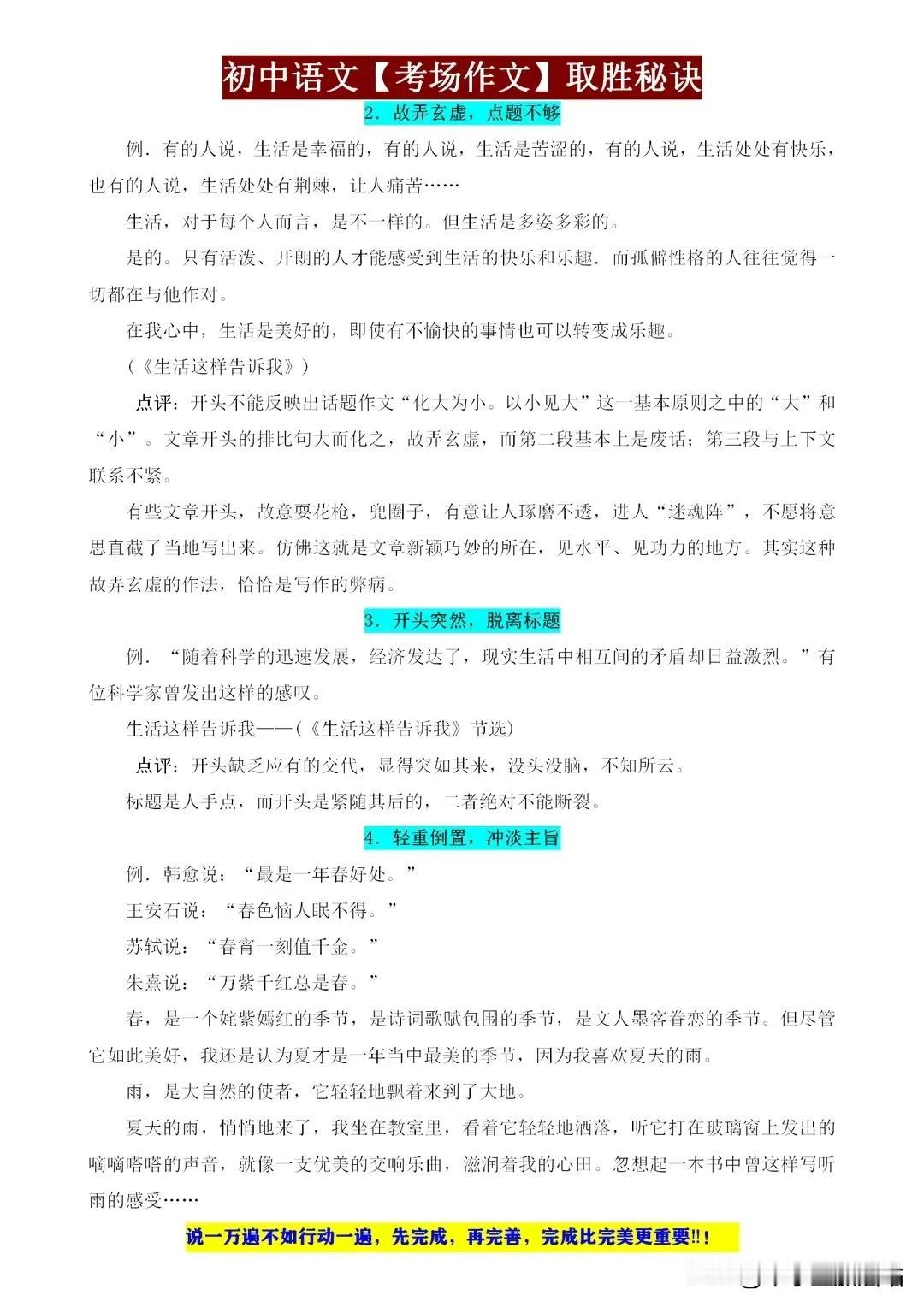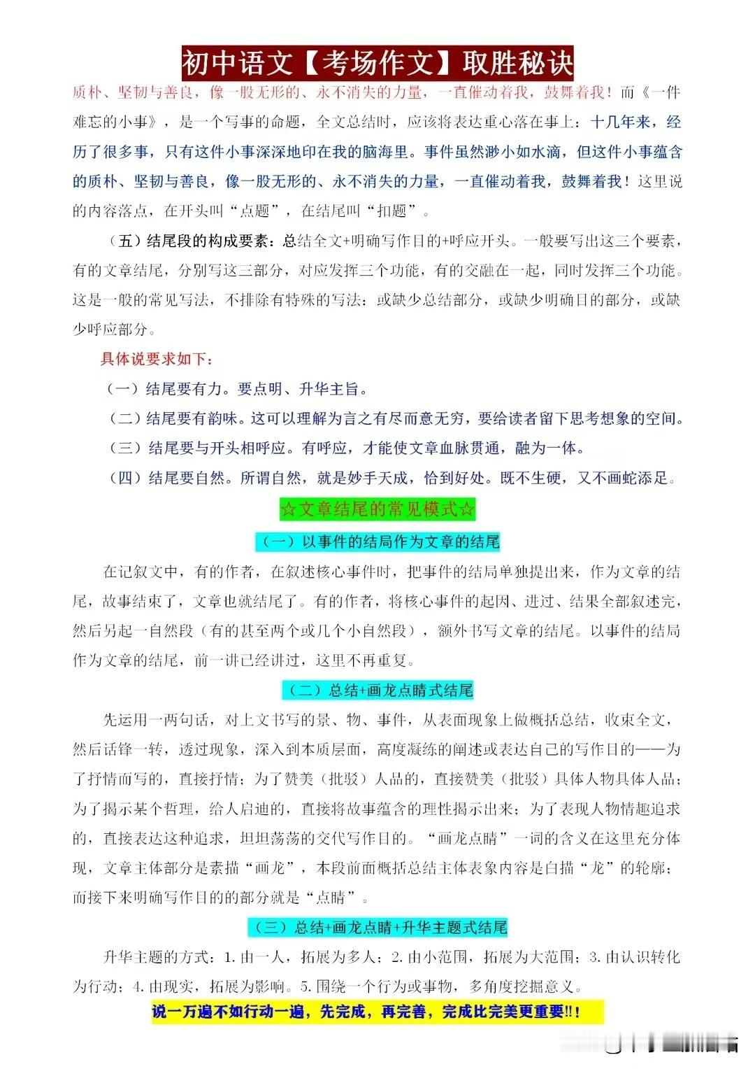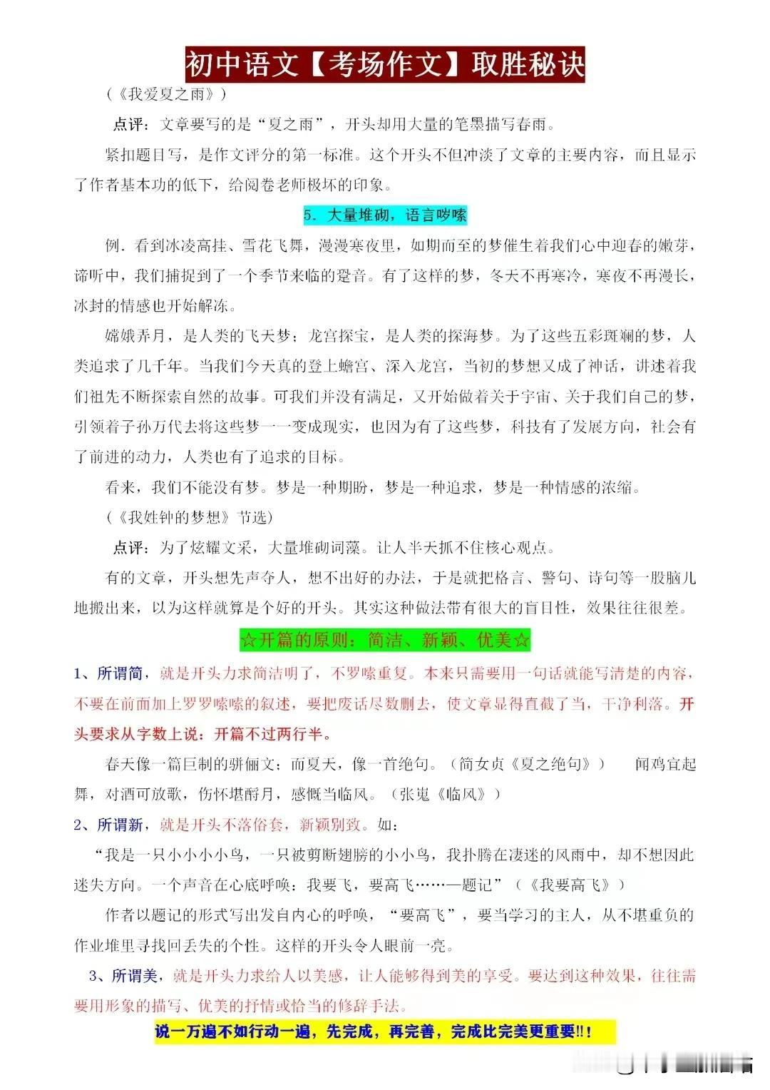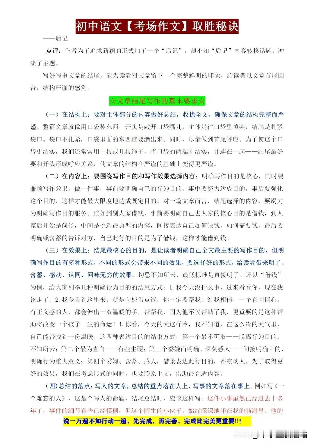 初中语文考场作文取胜秘籍,这些“细节”都是打动老师的得分点! 初中语文考场作文,取胜之道在于细节。开篇新颖,吸引眼球;结尾点睛,回味无穷。段落分明,逻辑清晰;词句优美,文采斐然。善用比喻、拟人,增强表达力;注重情感投入,真挚感人。 同时,紧扣主题,避免跑题;引用名句,彰显积累。字迹工整,卷面整洁,更是加分项。记住,细节决定成败,作文亦如此。用心打磨每一个细节,定能让你的作文脱颖而出,打动老师,赢得高分! 【左上角,点击我的“头像”,进入主页,有电子版获取方式】