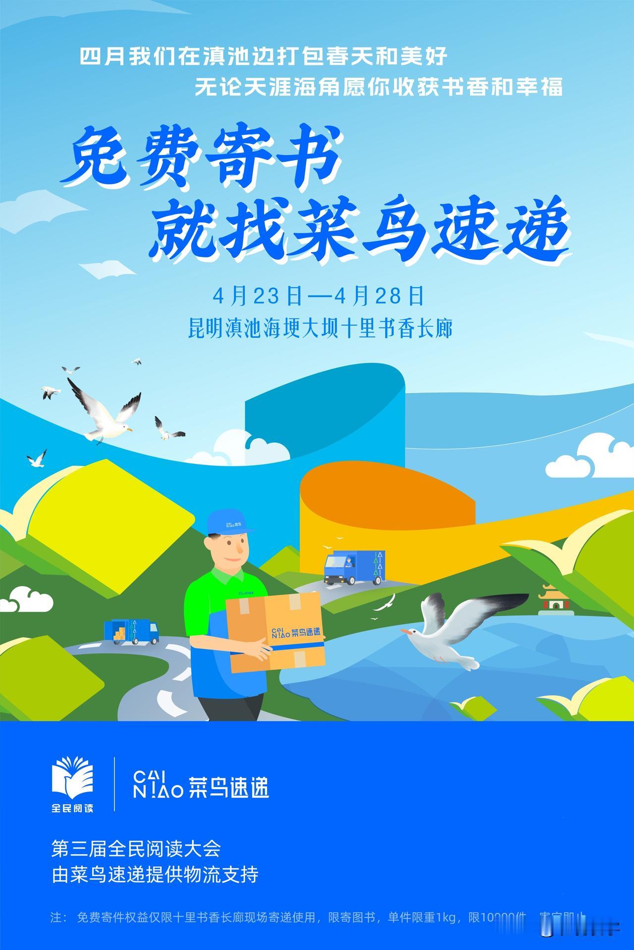 一年一度的世界读书日即将来临,与此同时,第三届全民阅读大会也将在云南昆明热烈开启。菜鸟速递作为物流支持,为现场购书的游客和市民提供了一个前所未有的服务——免费寄书!