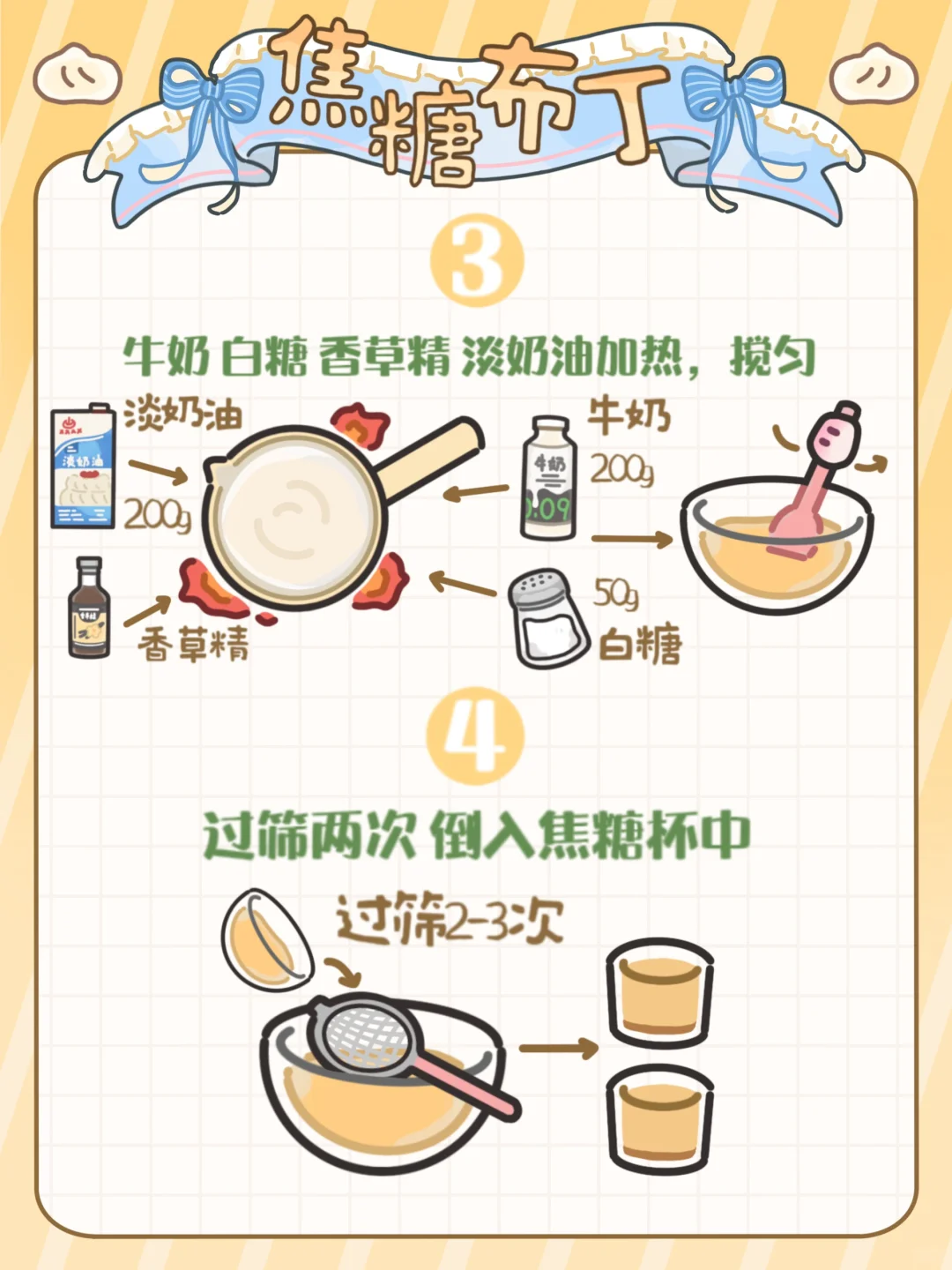 3️⃣200g淡奶油 200g牛奶🥛 50g白砂糖 一点香草精🌿加入锅中 加热,加入蛋液中边加边搅拌