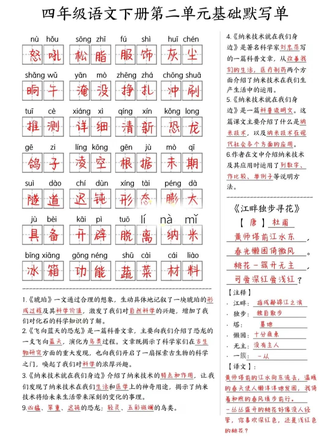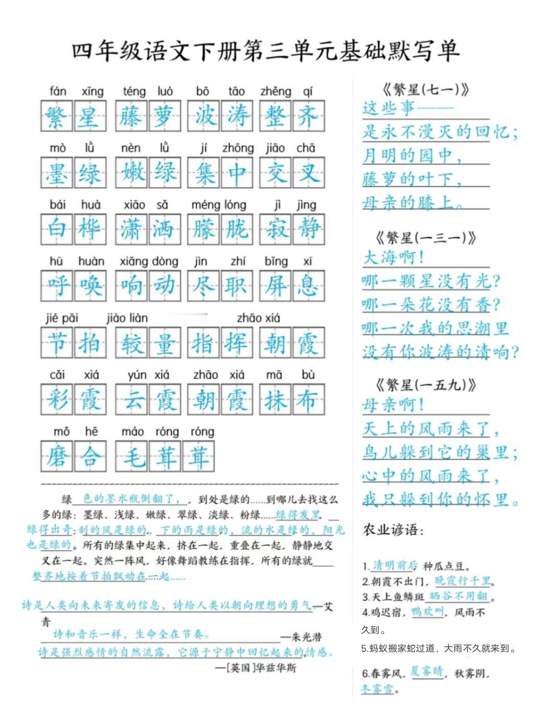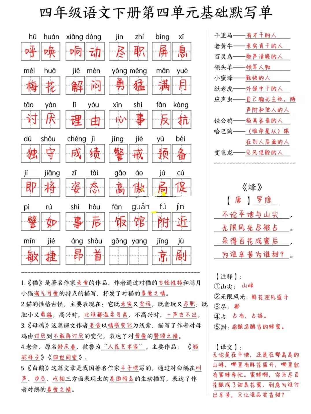 #期中复习# #小学四年级# 四年级下学期1~4单元默写知识卡(含答案) 前四张练习,后四张答案查漏补缺 家长们赶紧收藏打印哦~