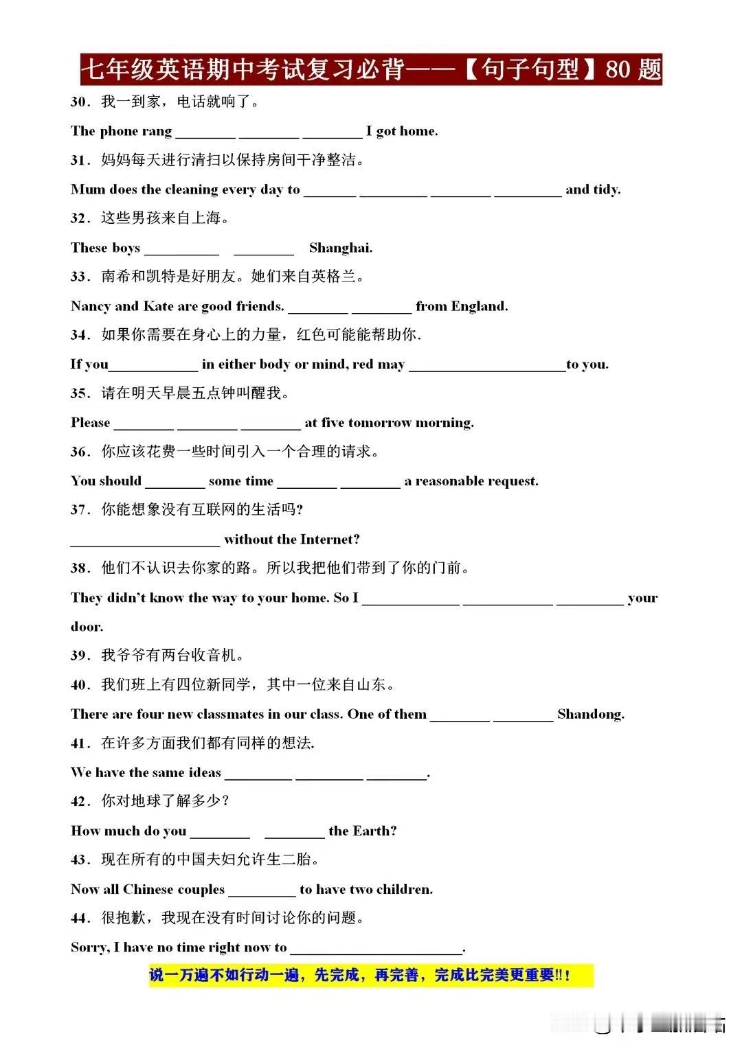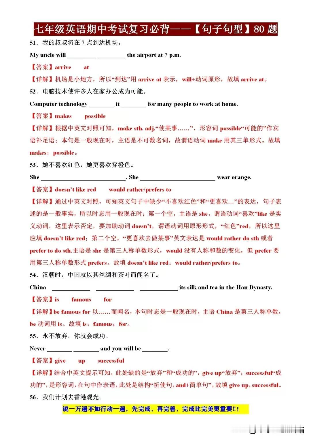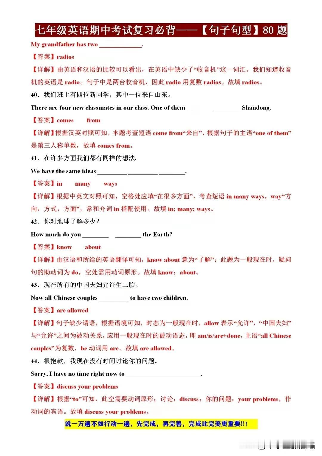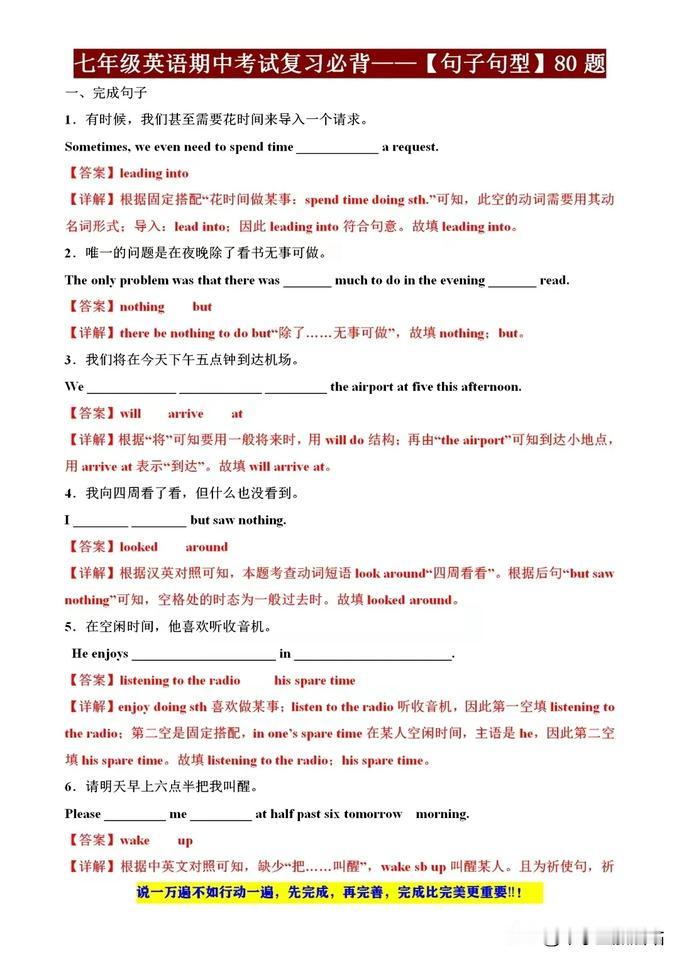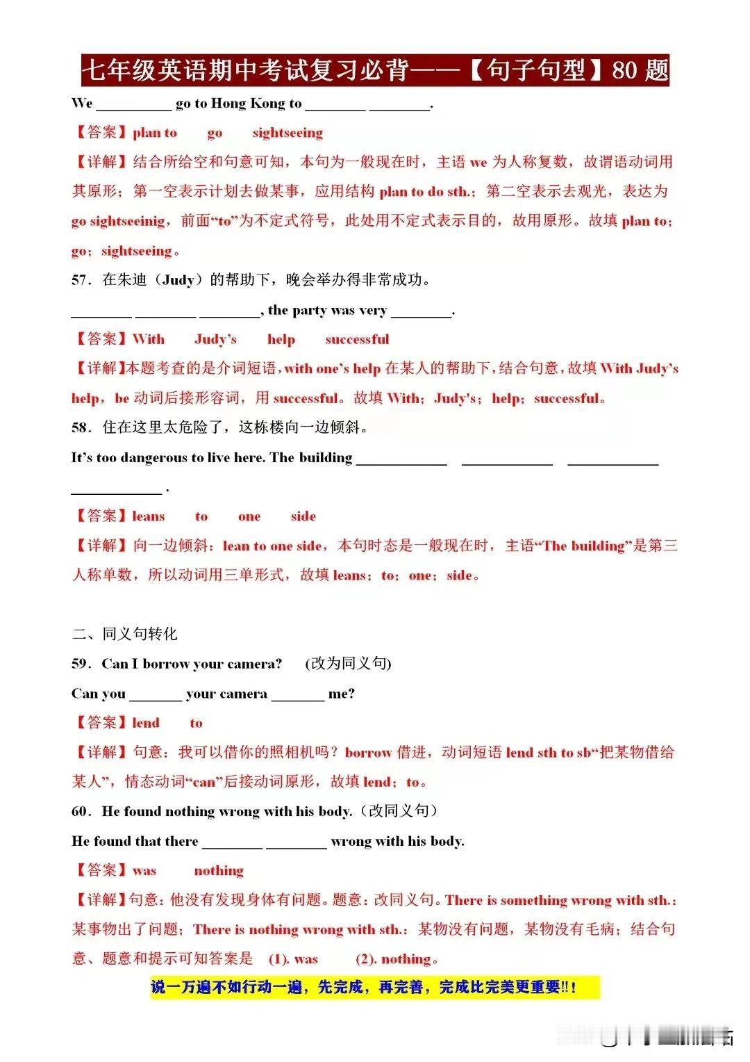 七年级英语期中考试复习必背——80个句子句型,涵盖全部词汇语法 七年级英语期中考试在即,掌握核心句型至关重要!我们精选80个句子句型,全面覆盖词汇语法,助你轻松复习,提升应试能力。这些句型既包含基础表达,又涵盖实用对话,让你在考试中游刃有余。 反复背诵,不仅加深记忆,更能培养语感,提升英语综合运用能力。别再为英语考试犯愁,用这80个句子句型武装自己,迎接期中考试的挑战吧!相信只要你用心记忆,定能取得优异成绩,让英语成为你的优势学科! 【左上角,点击我的“头像”,进入主页,有电子版获取方式】