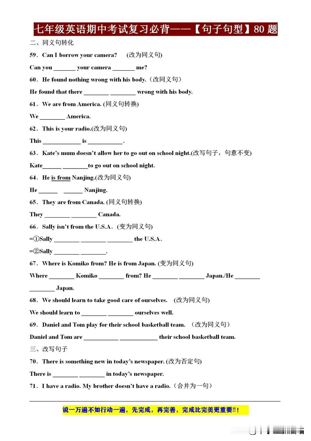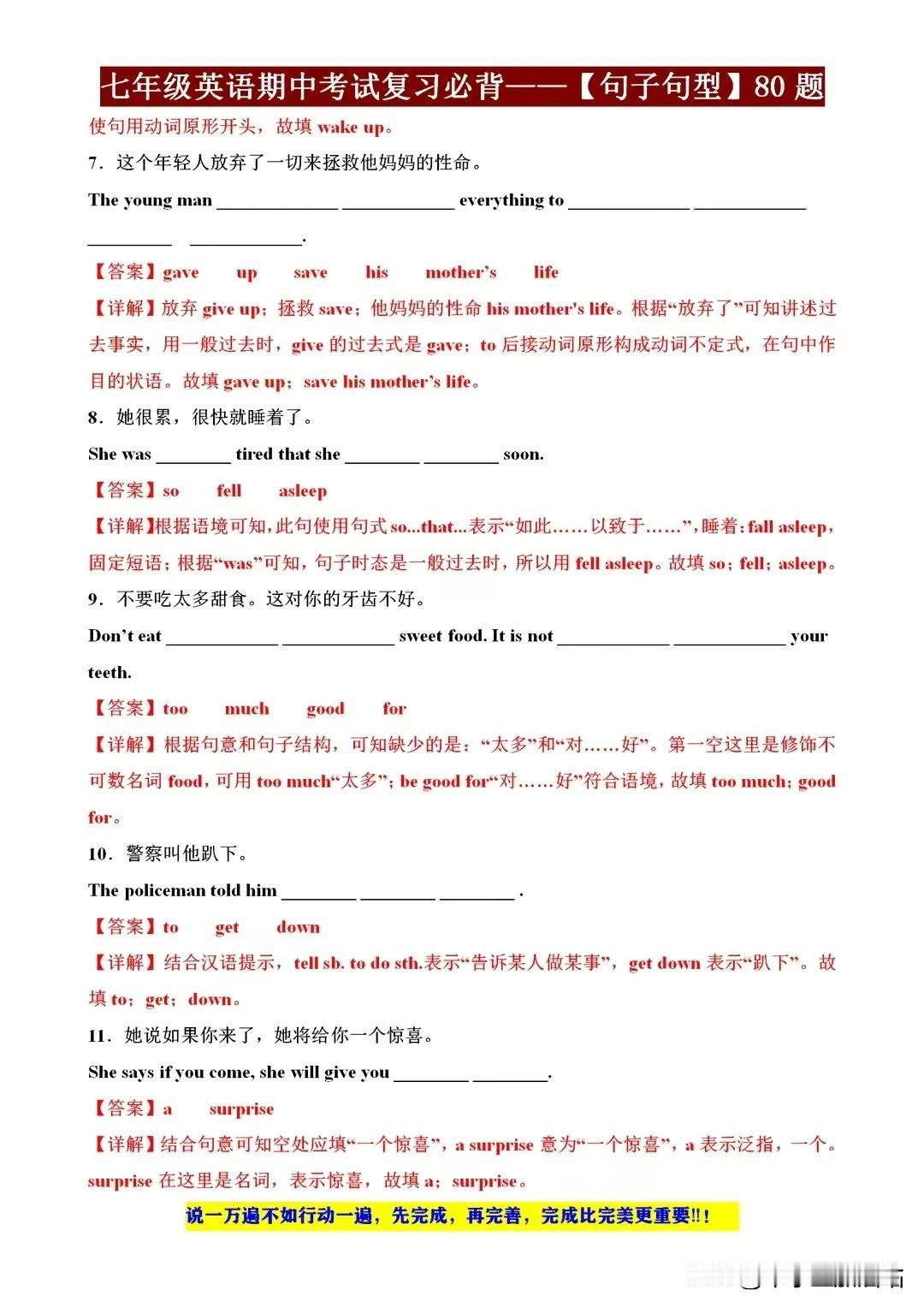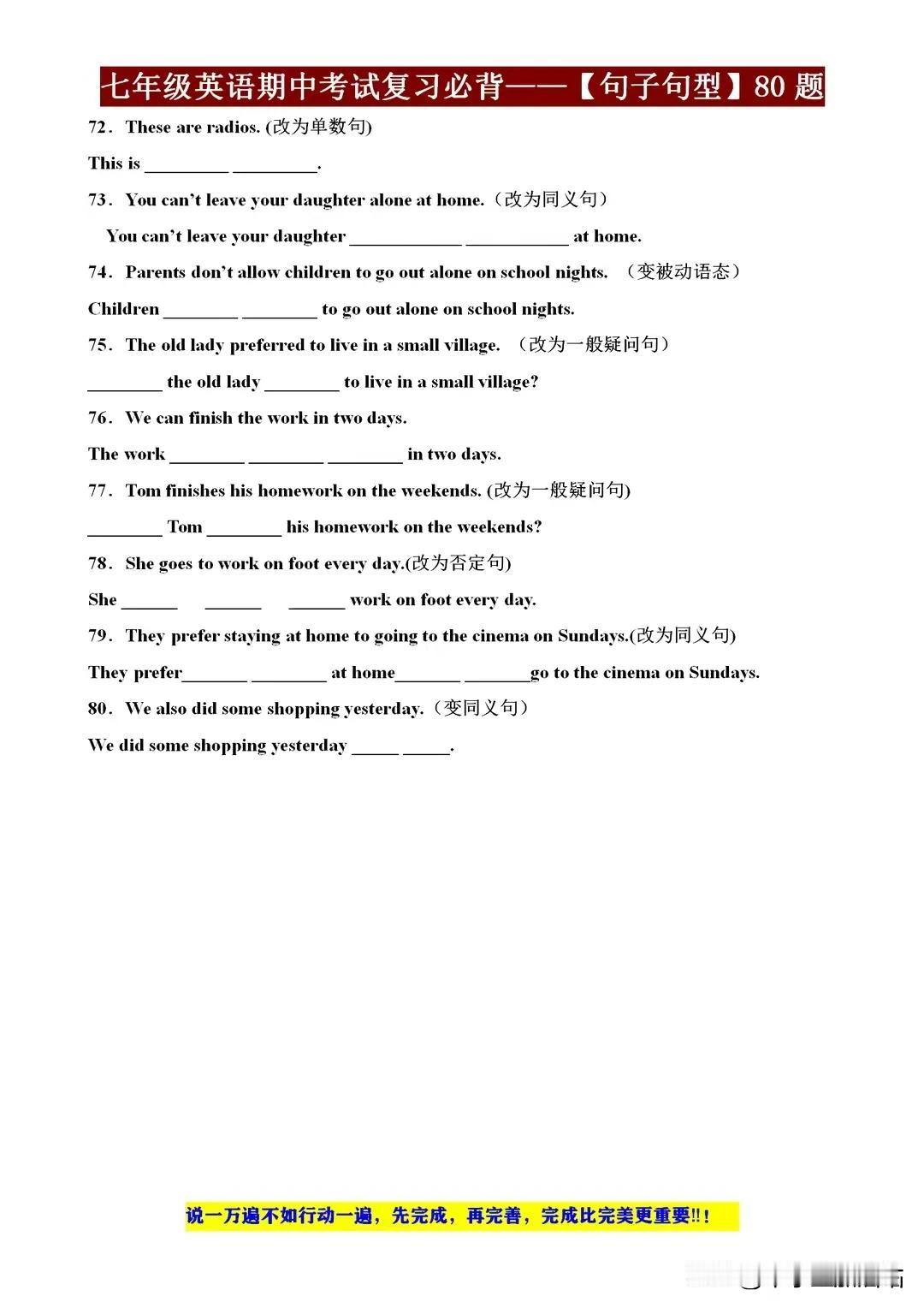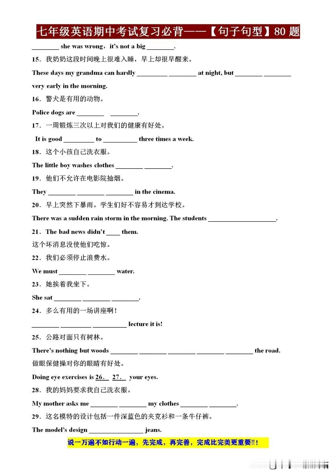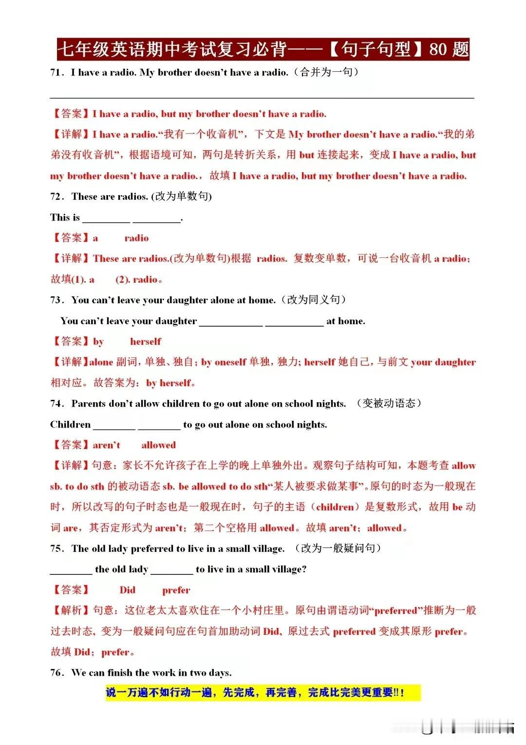 七年级英语期中考试复习必背——80个句子句型,涵盖全部词汇语法 七年级英语期中考试在即,掌握核心句型至关重要!我们精选80个句子句型,全面覆盖词汇语法,助你轻松复习,提升应试能力。这些句型既包含基础表达,又涵盖实用对话,让你在考试中游刃有余。 反复背诵,不仅加深记忆,更能培养语感,提升英语综合运用能力。别再为英语考试犯愁,用这80个句子句型武装自己,迎接期中考试的挑战吧!相信只要你用心记忆,定能取得优异成绩,让英语成为你的优势学科! 【左上角,点击我的“头像”,进入主页,有电子版获取方式】
