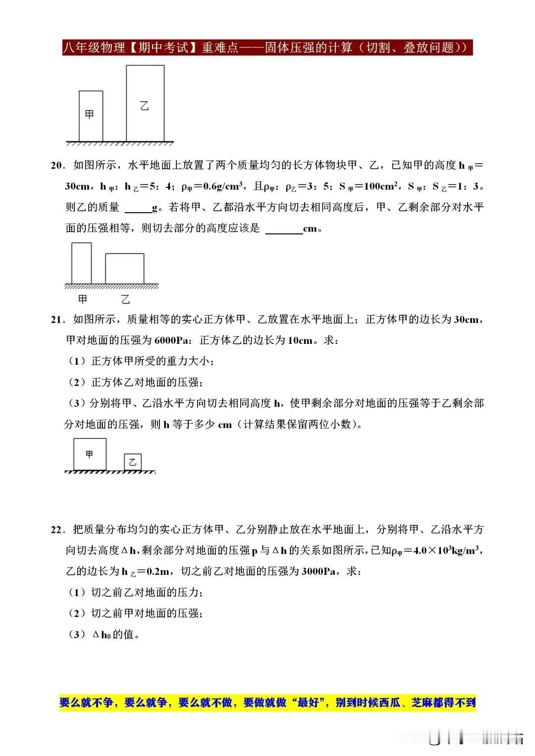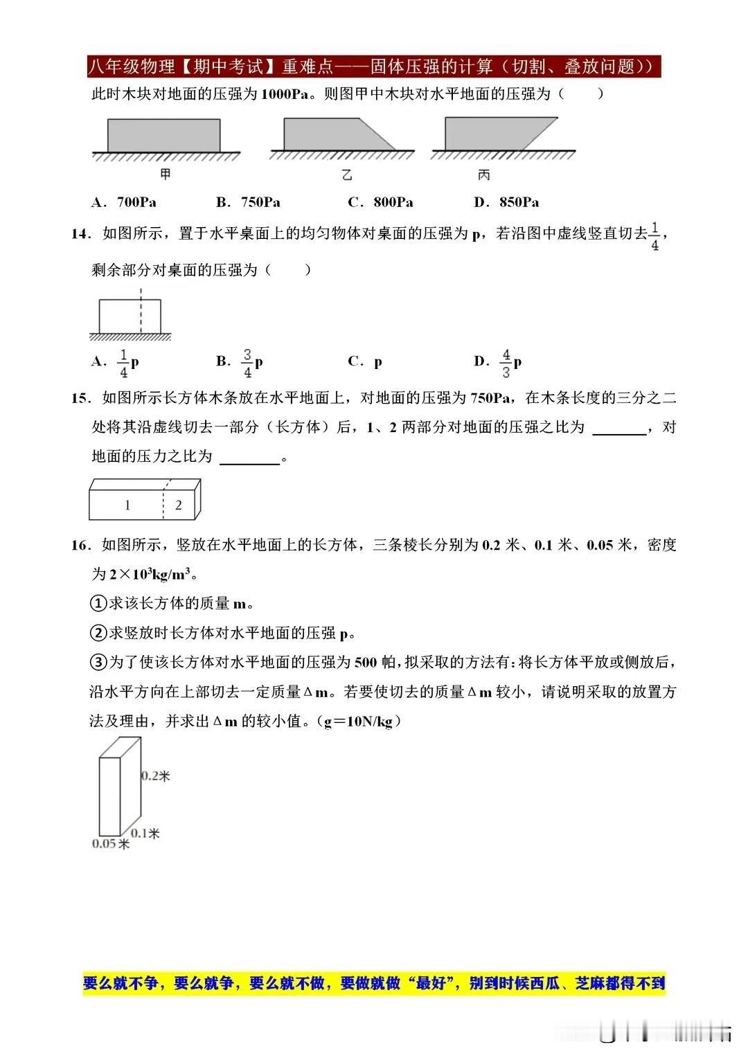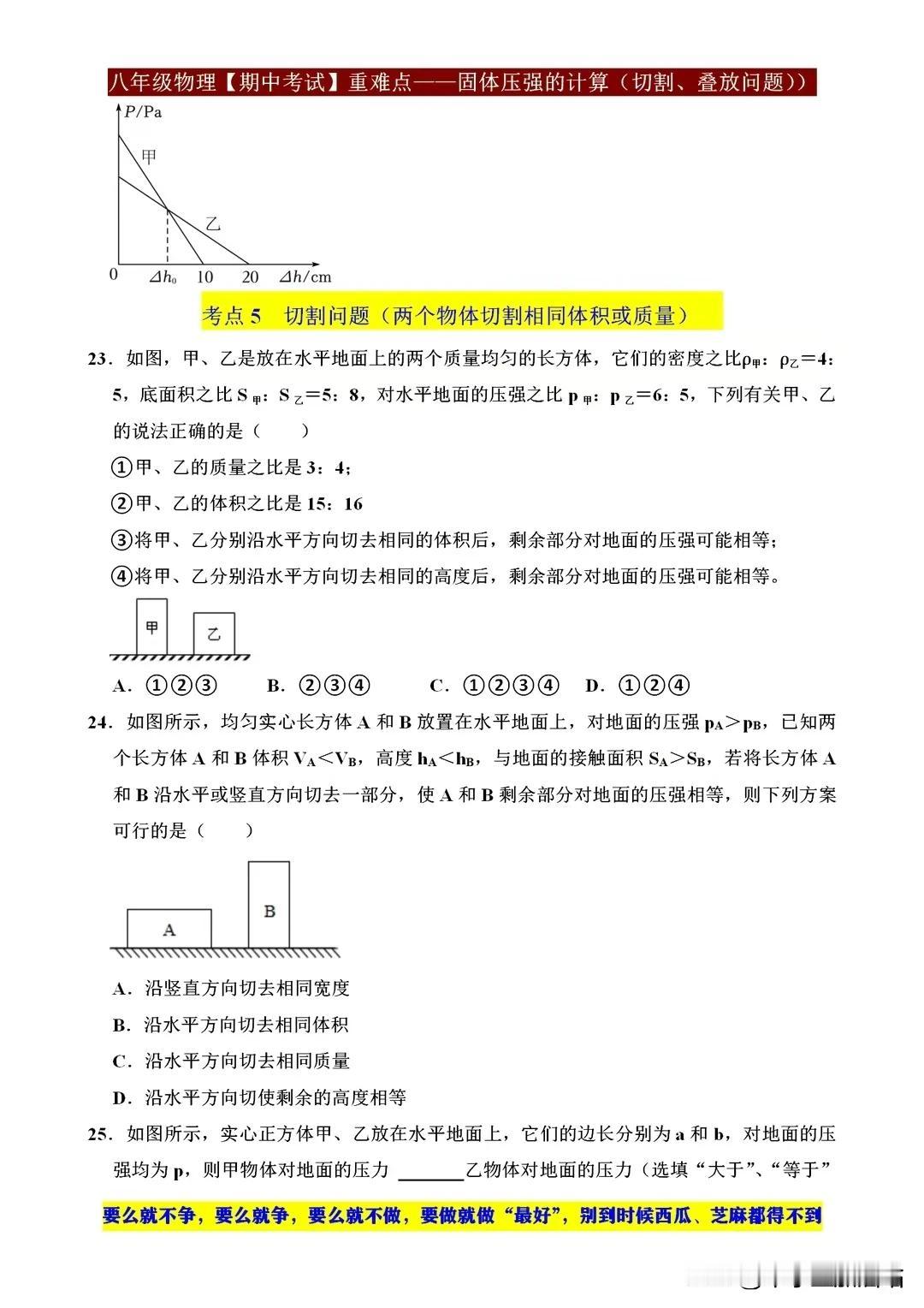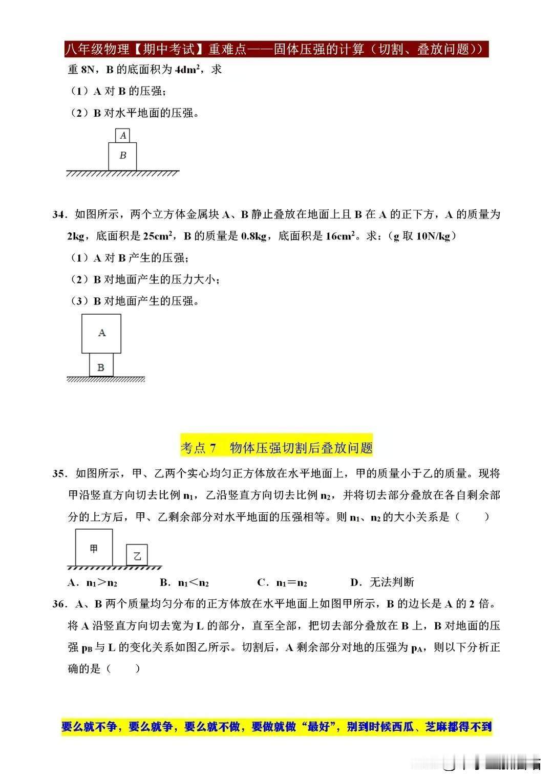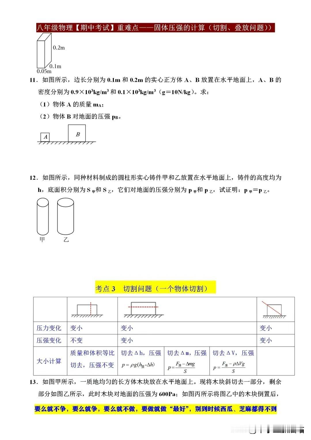 八年级物理期中考试重难点——固体压强计算(切割、叠放问题)! 八年级物理期中考试中的固体压强计算,特别是涉及切割与叠放的问题,是考试的重难点。在解决这类问题时,需要灵活运用压强的计算公式,并结合物体的形状、质量分布等因素进行综合分析。 对于切割问题,关键在于理解切割后物体质量的变化和受力面积的变化如何影响压强。而对于叠放问题,则需要注意不同物体间的相互作用力,以及叠放顺序对整体压强的影响。通过大量练习和深入理解,同学们可以逐步掌握这类问题的解题技巧,从而在考试中取得好成绩。 【左上角,点击我的“头像”,进入主页,有电子版获取方式】