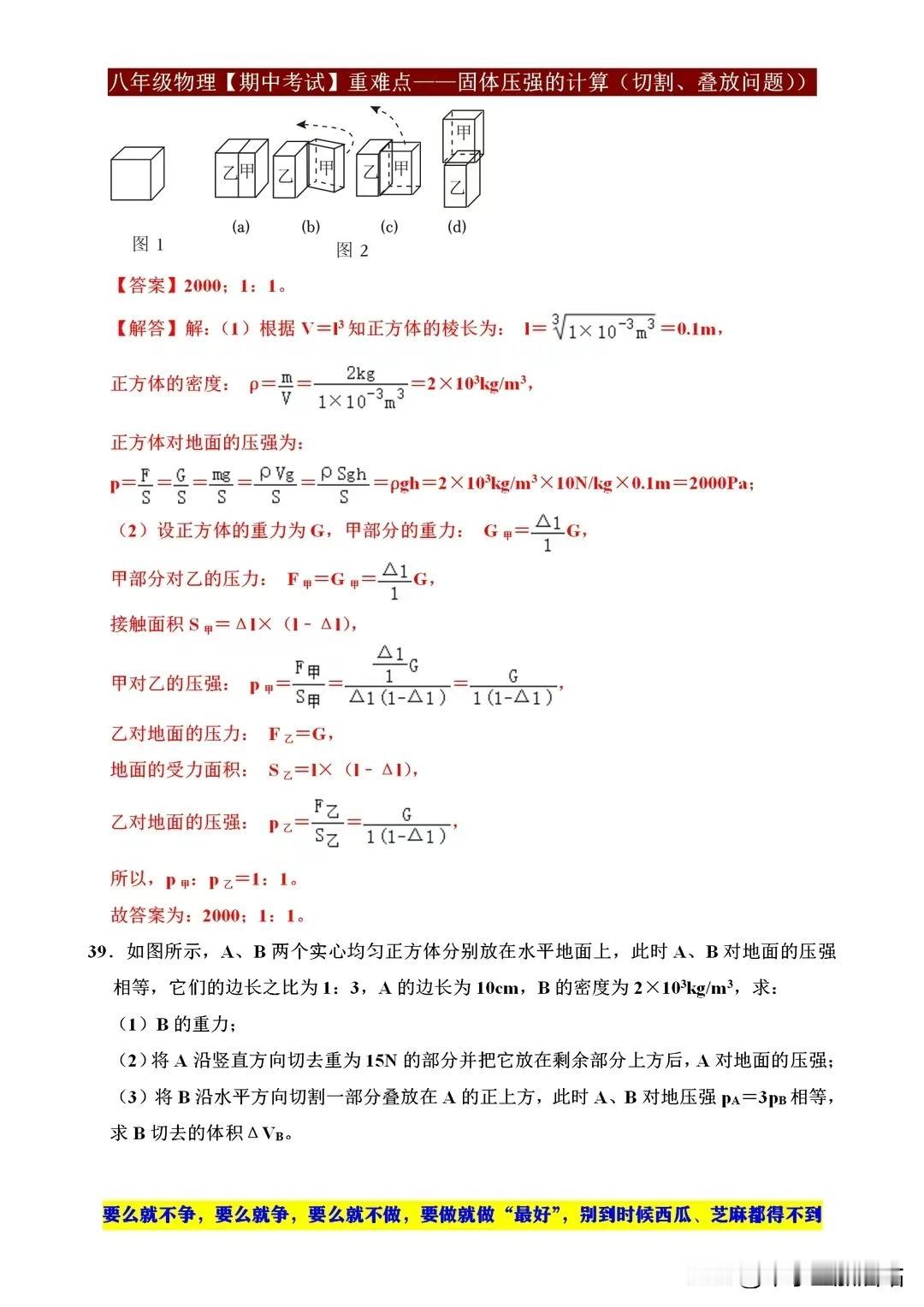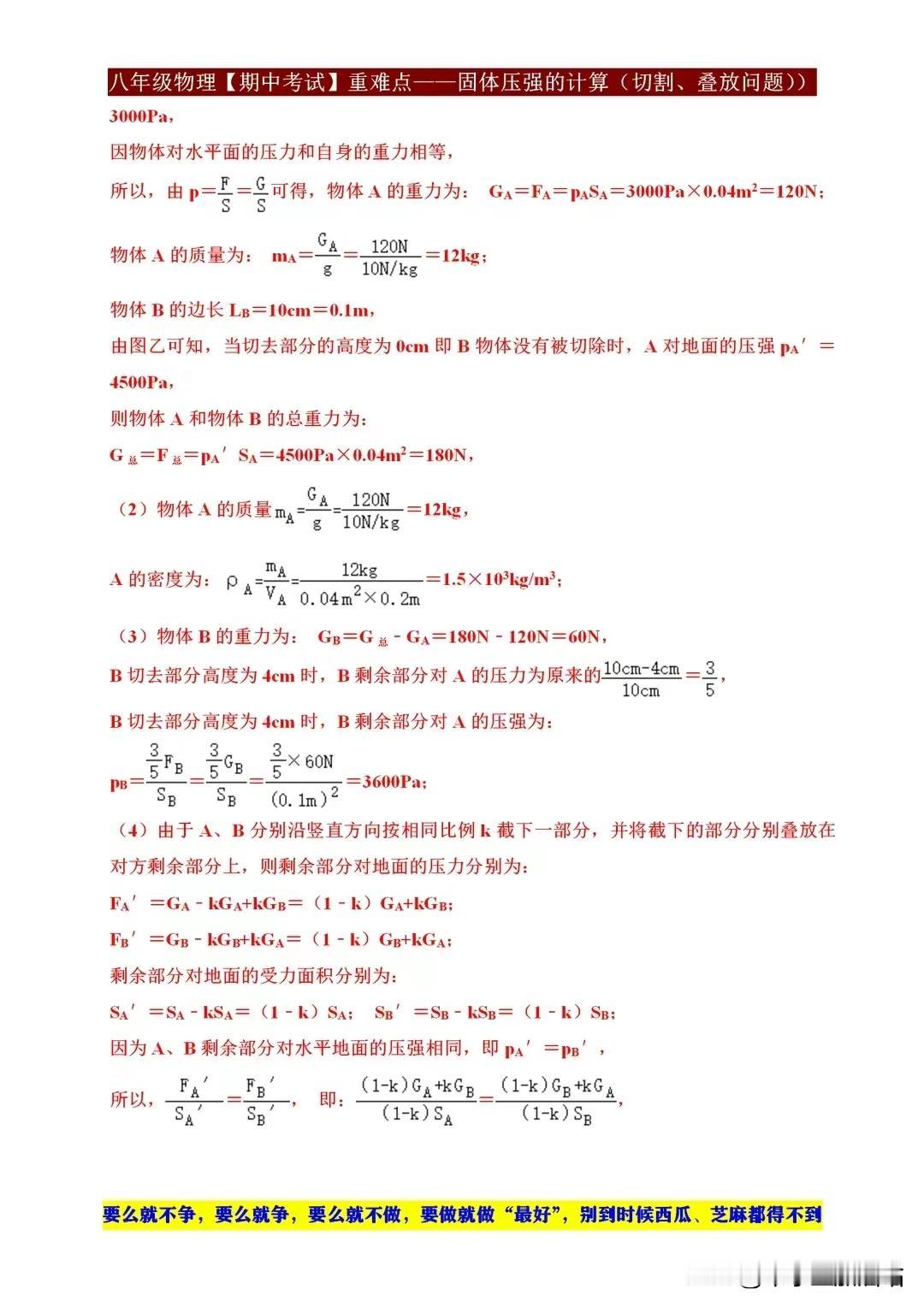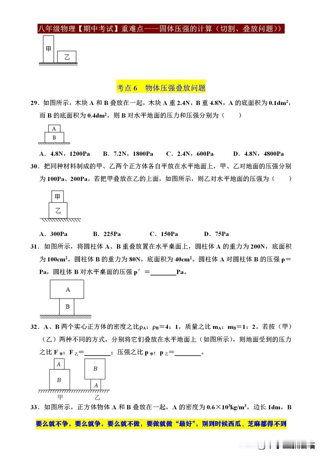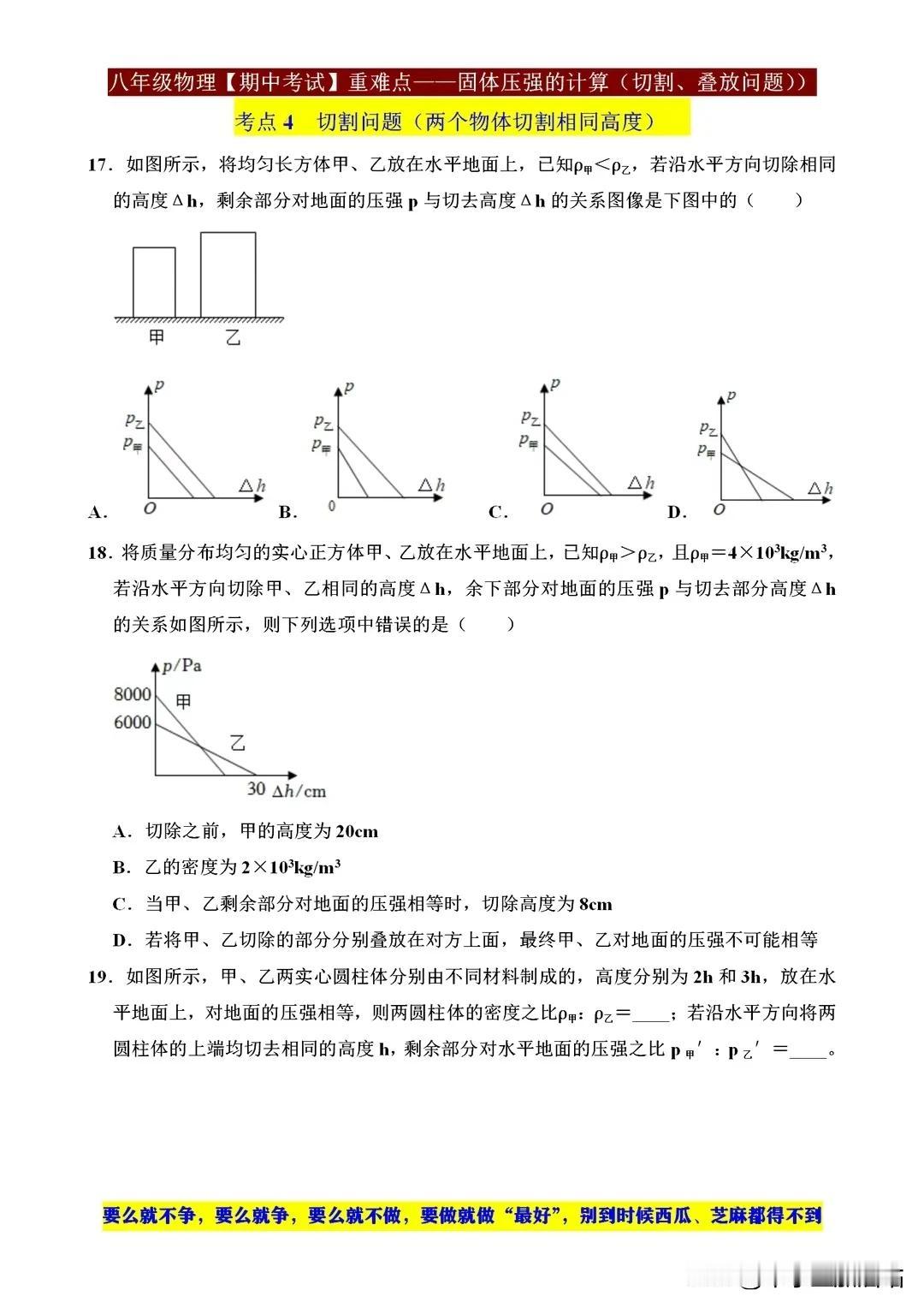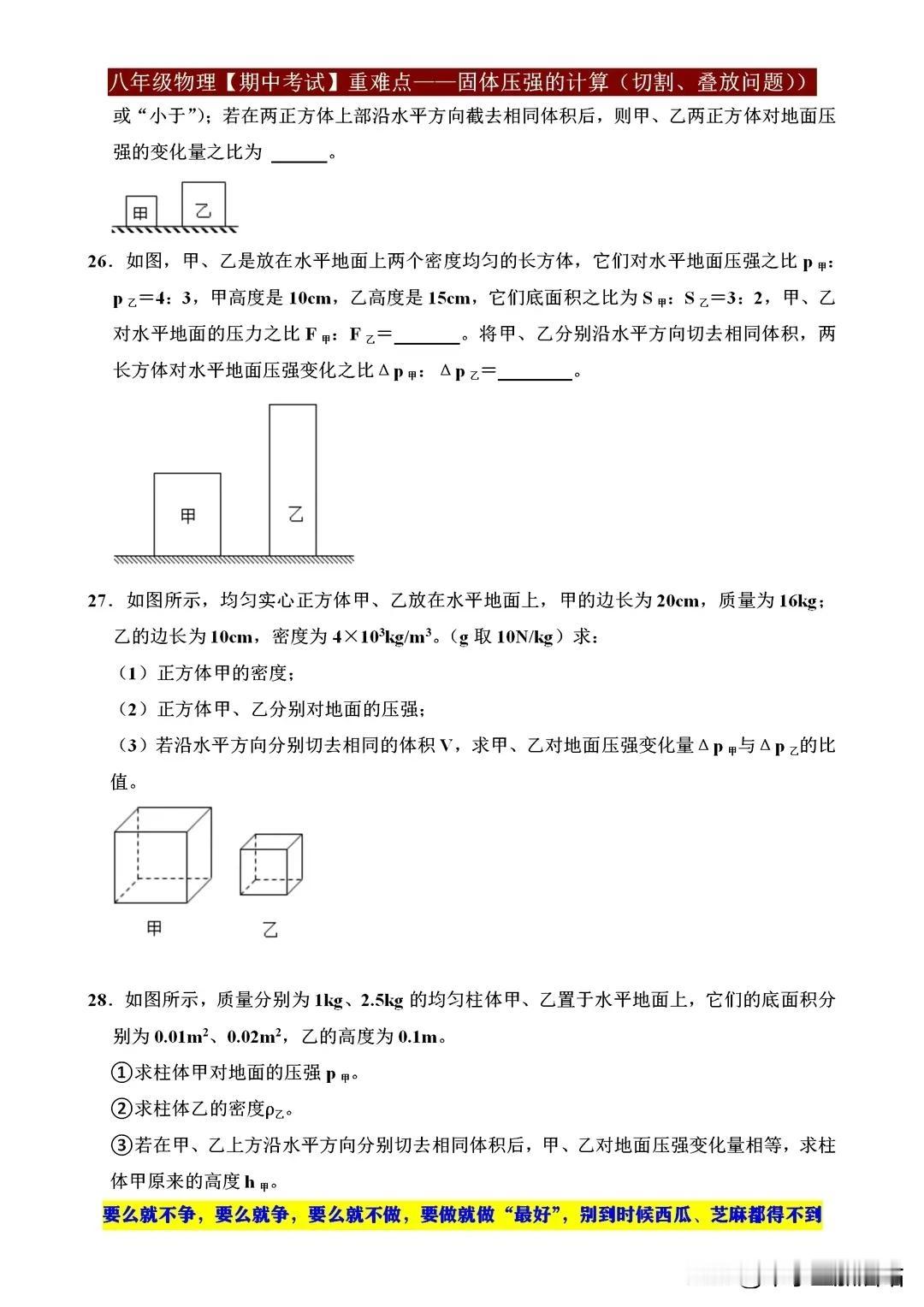 八年级物理期中考试重难点——固体压强计算(切割、叠放问题)! 八年级物理期中考试中的固体压强计算,特别是涉及切割与叠放的问题,是考试的重难点。在解决这类问题时,需要灵活运用压强的计算公式,并结合物体的形状、质量分布等因素进行综合分析。 对于切割问题,关键在于理解切割后物体质量的变化和受力面积的变化如何影响压强。而对于叠放问题,则需要注意不同物体间的相互作用力,以及叠放顺序对整体压强的影响。通过大量练习和深入理解,同学们可以逐步掌握这类问题的解题技巧,从而在考试中取得好成绩。 【左上角,点击我的“头像”,进入主页,有电子版获取方式】