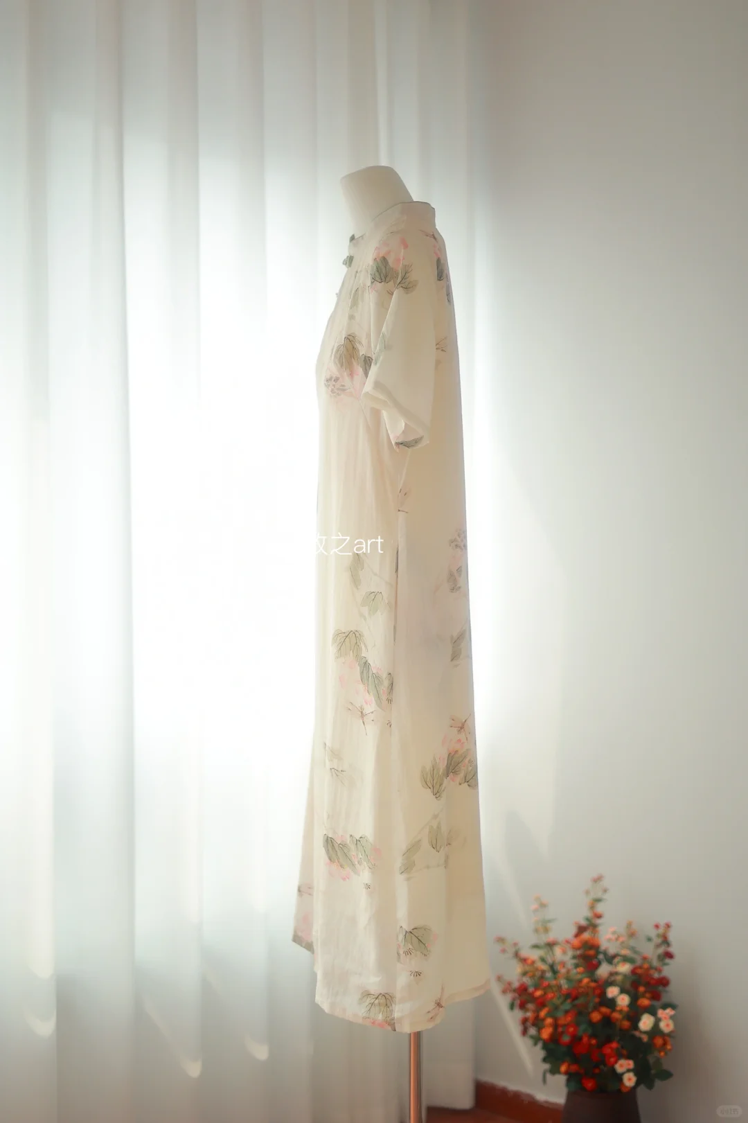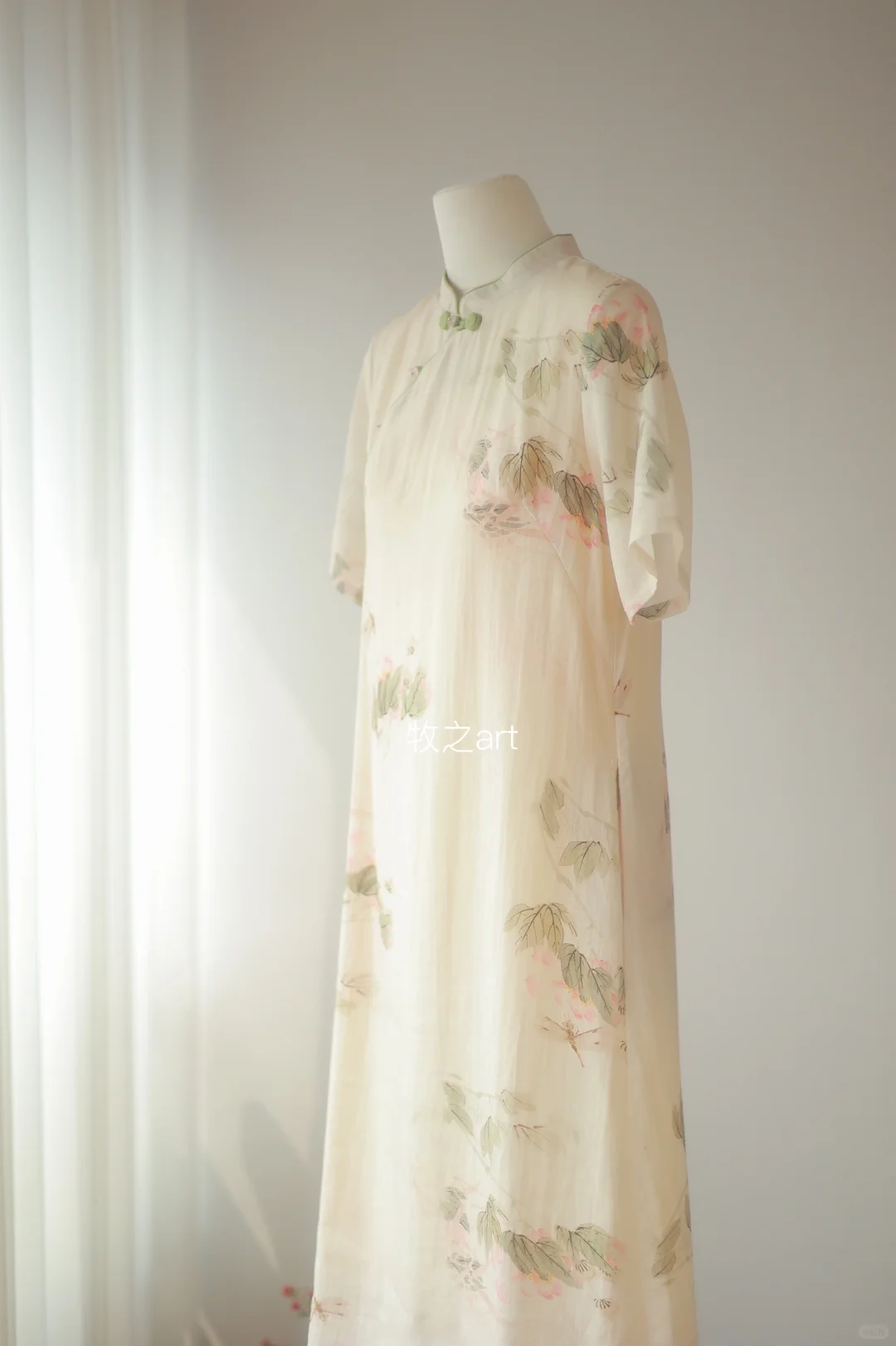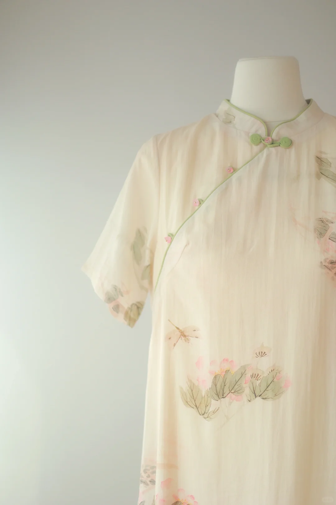 小荷才露尖尖角,早有蜻蜓立上头~ 领口做的稍低些,小立领包容性更强些,日常舒适 斜襟是可以解开的,宽松的A摆版型,有一种闲适安稳的感觉 面料为苎麻面料,天然苎麻纤维穿起来透气舒适,可以说是夏天必备轻松款 -