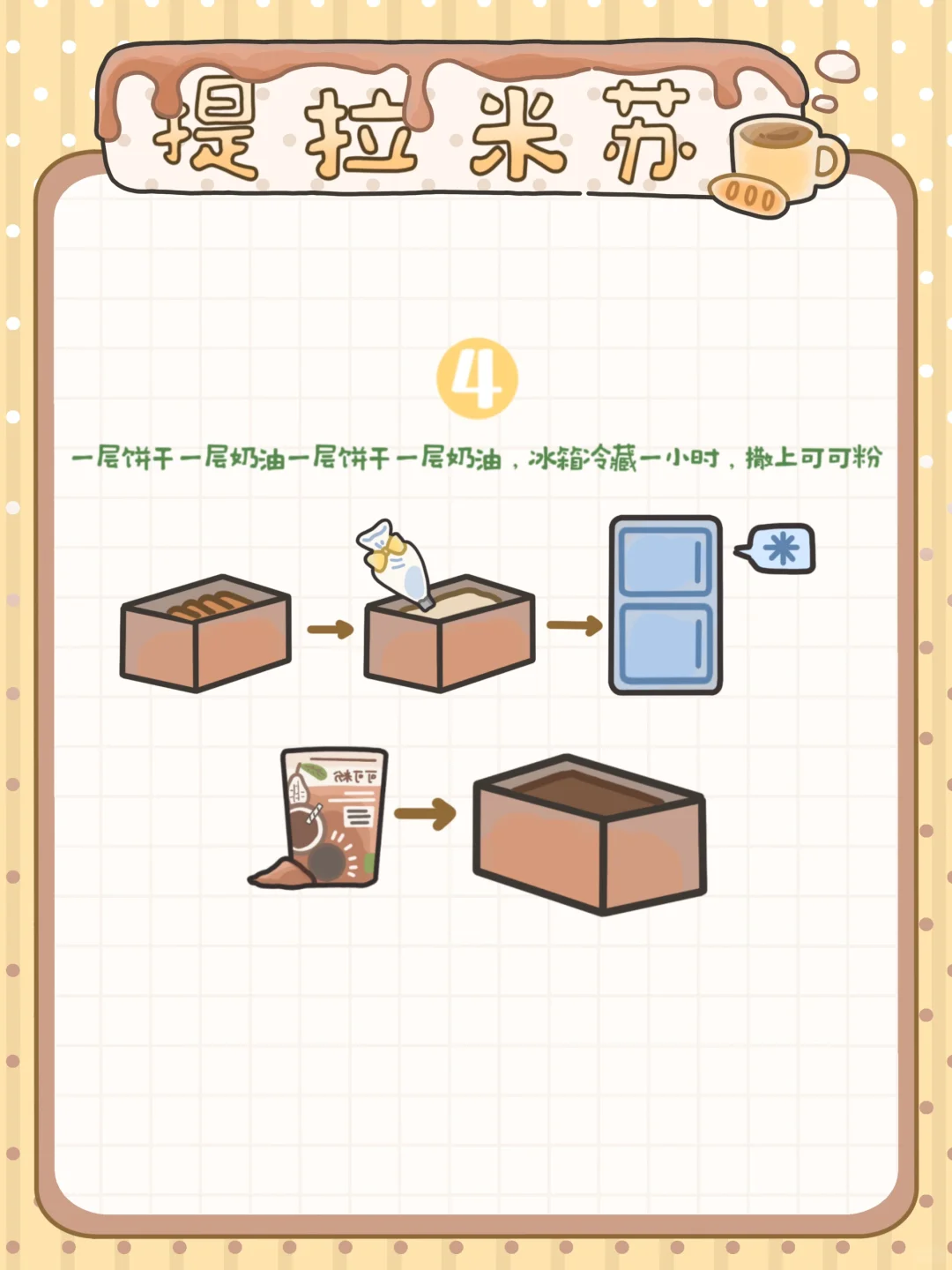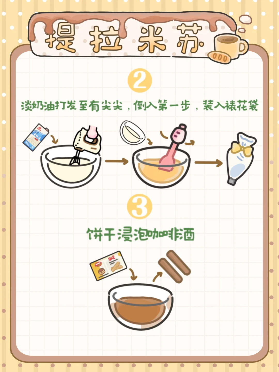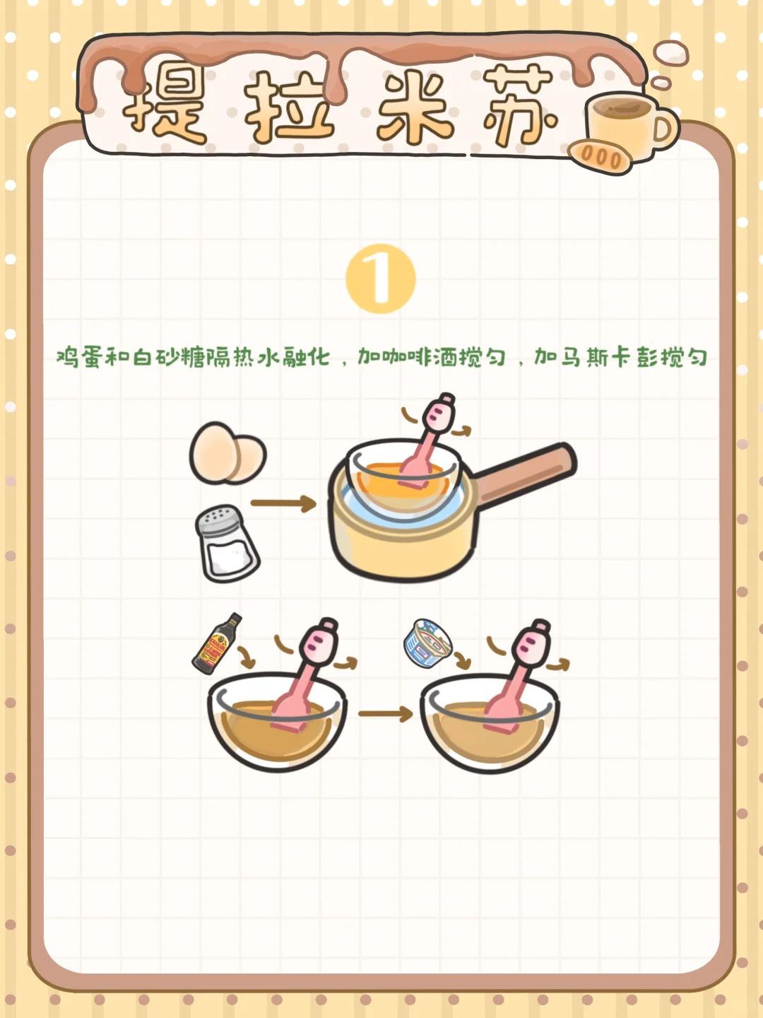 Hi!这里是小羊柚柚~ 今日份丝滑浓郁的提拉米苏🍰来喽!不知道为什么😭最近流量超级不好,是换了新风格大家不喜欢了嘛😭感觉更新越来越没有动力了,听说是推流机制变了 搞得好焦虑啊😖但是我自己好喜欢现在的新风格,打算再坚持一段时间看看💪希望可以越来越好,感谢大家一直的陪伴🙏 提拉米苏真的是一个一段时间不吃就会想念的甜品👍每次吃一口都会有满满的幸福感🥰一整个满血复活‼️ - 🥣食材准备 鸡蛋🥚|手指饼干🍪|咖啡酒☕️|淡奶油🧁|马斯卡彭|可可粉|白砂糖🍬 - 👉制作步骤 1️⃣鸡蛋🥚和白砂糖隔热水♨️融化🫠,加入咖啡酒☕️搅拌均匀(其实也可以用咖啡液),加入马斯卡彭搅拌均匀 2️⃣淡奶油打发至提起来有尖尖,倒入第一步搅拌好的蛋液中搅拌均匀,加入裱花袋 3️⃣用咖啡酒浸泡手指饼干🍪(不要泡太久 整个浸湿就可以了 喜欢软一点也可以泡一下) 4️⃣一层饼干🍪一层奶油🧁一层饼干🍪一层奶油🧁,放入冰箱🧊冷藏一小时,取出撒上可可粉 - 🌟小tips 这里的鸡蛋🥚最好使用无菌蛋哦~不过也有免鸡蛋版,也可以直接不放鸡蛋,咖啡酒☕️没有的也可以用咖啡液来代替,味道都很不错👍 提拉米苏真是一个简单又美味🤤的小甜品,并且很适合大众的口味,大部分人应该都很喜欢吃提拉米苏吧‼️反正我一段时间不吃就很想念,现在不管甜品店还是摆摊,提拉米苏都是最常见的小甜品之一👍百吃不腻 - 感谢喜欢💕我们下期见喽~ 欢迎👏点菜