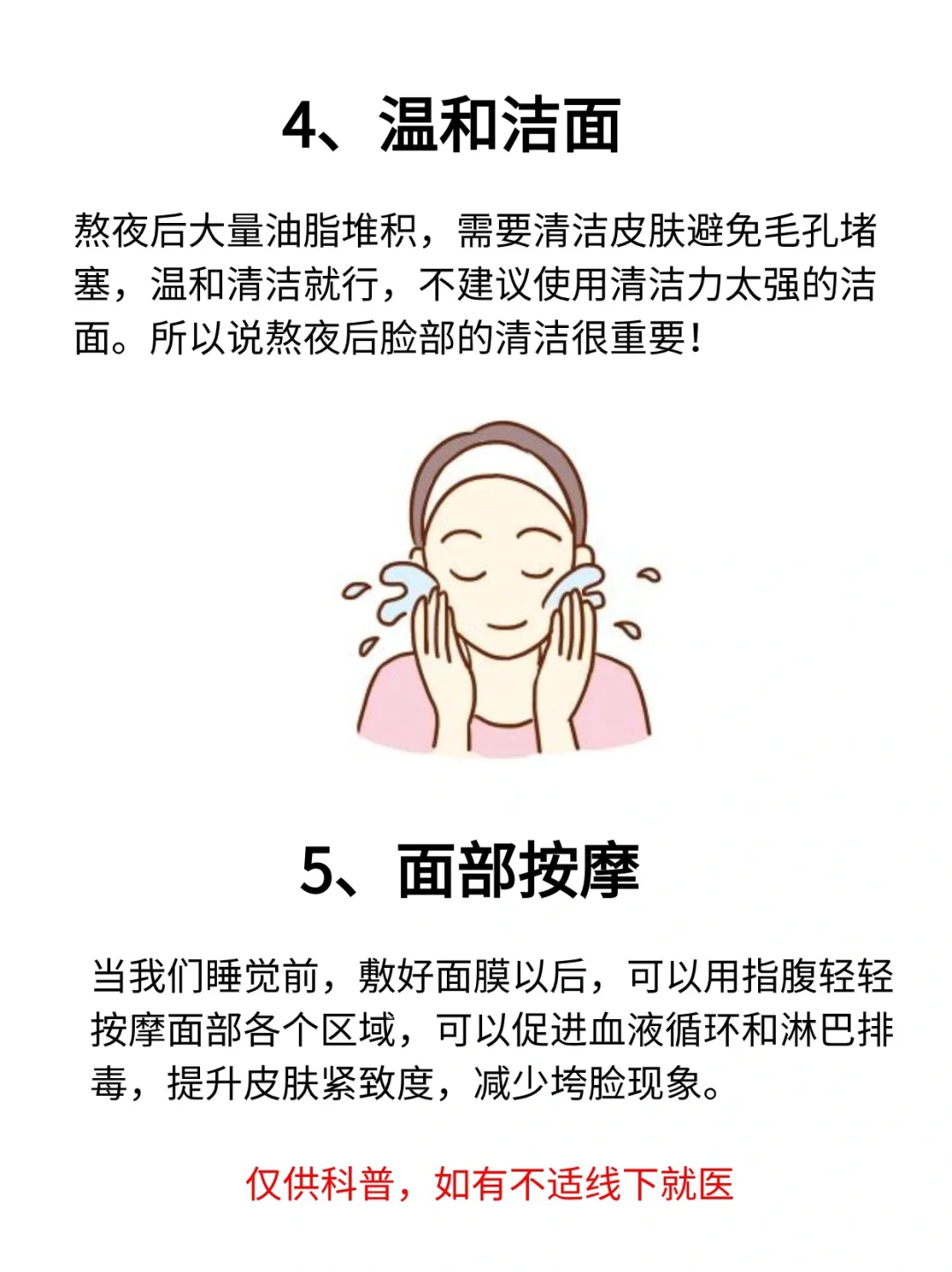1.整点养甘茶喝 2.给自己狠狠补觉 3.运动出汗提代谢 4.温和洁面洗脸 5.给脸部按摩 6.涂抹天然维生素e 7.做好饮食调整
