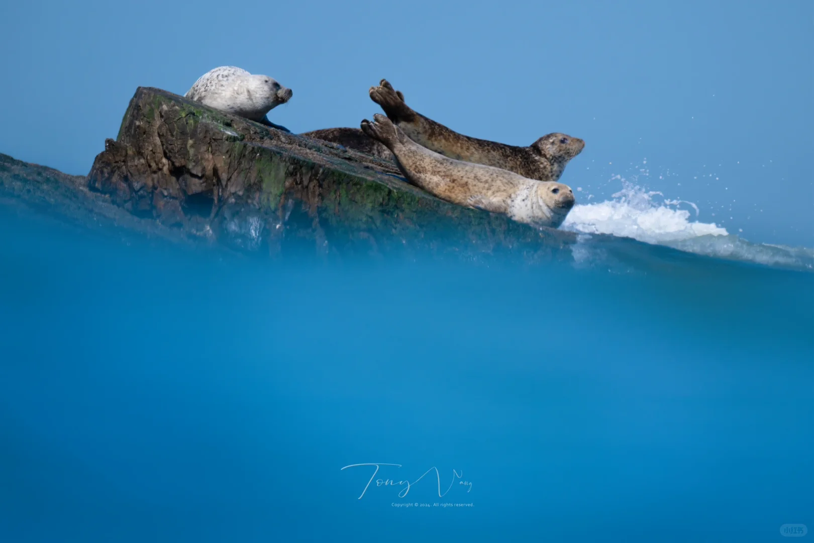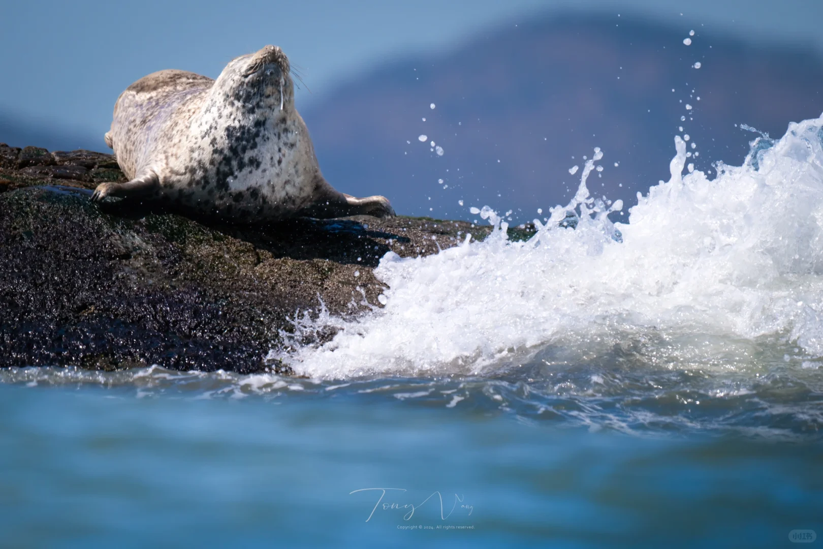 斑海豹/西太平洋斑海豹 Spotted seal 低机位的极限是比浪头更低,后果就是镜头真的给海浪🌊打了,不过尼康无所畏惧[doge] 阳光下涌起的浪头成为碧蓝的前景,又随即拍打在礁石上化为纷飞的泡沫,在颠簸的小船上我将180-600吊出船舷,记录下了这个画面。虽然不是真正的半水照,但是也很喜欢这两张!