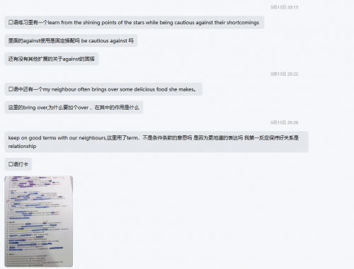 转眼间我跟学员小婷相识已有一个月的时间了,这一个月中,我们一直在互相进步,共同成长。一开始,我们还有点腼腆,保持一定的距离感。随着沟通愈发频繁,我们的关系逐渐变得熟络了起来。在日常的学习交流过程中,我发觉她是一个很认真学习的好孩子,我给她布置的所有打卡任务,她都会认真对待,并且把细节推敲清楚,认真仔细。