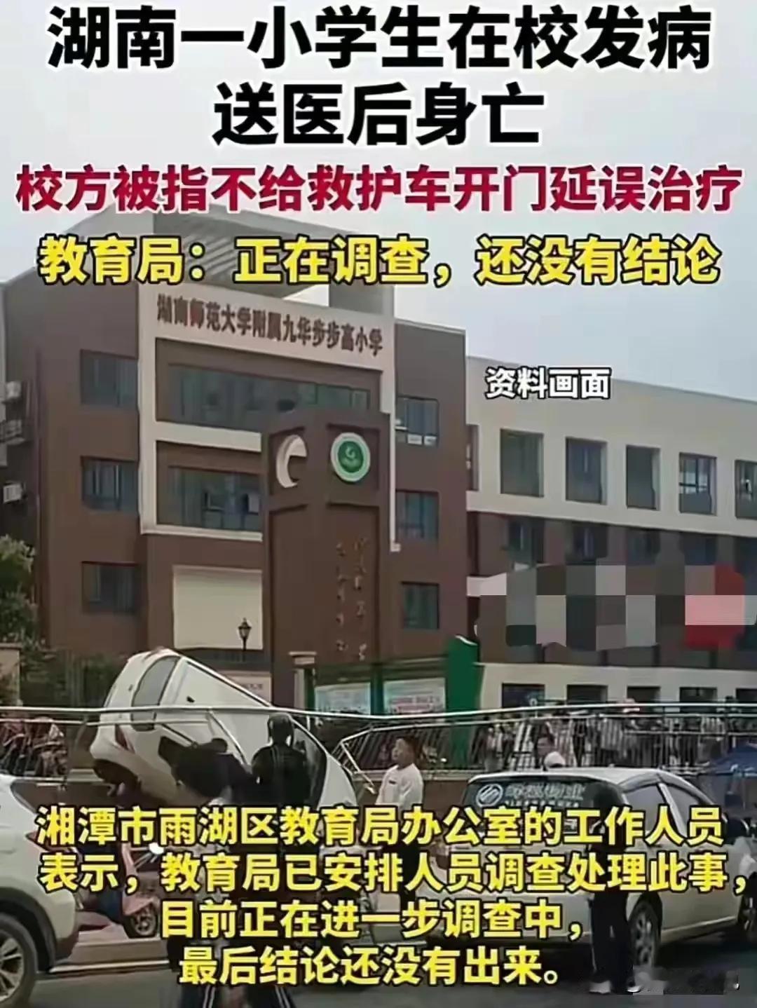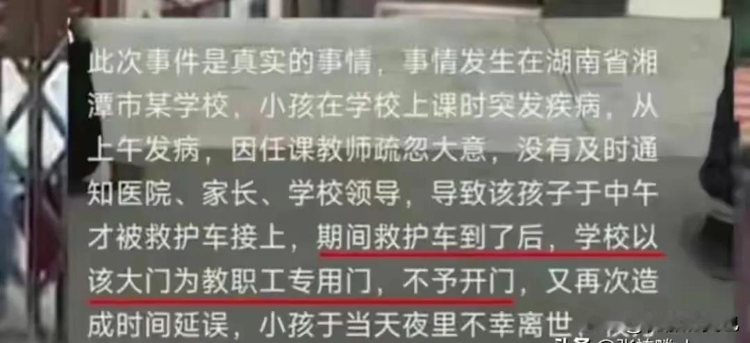 两方的不作为,导致小学生身亡,实在痛惜! 近日在湖南一小学发生了一起令人痛惜的事情,本该可以完全避免的,结果因为两方的不作为,一名小学生白白丢掉了性命! 事情这是这样的: 一小学生上午开始感觉不适,老师并未察觉。一直到中午时分才发现,并且通知家长。家长赶到学校之后,即刻拨打了120。令人气愤的事情发生了,120救护车到了之后,门卫竟然不让进!理由十分的荒唐,这是教职工专门门,不让进!最终耽误了宝贵的救治时间。孩子到医院之后抢救无效,死于脑溢血。不用多说吧,脑溢血病人每一秒的抢救时间都是十分珍贵的。 事后,医院工作人员也提到了,孩子本身有先天性疾病。 两方的不作为,导致耽误孩子抢救时间:一是老师对孩子的不舒服没有及时发现,当然这可能跟家长没跟老师交代孩子的先天疾病有关,老师没有过多关注。但发现孩子不舒服之后,先通知家长,没有即刻处理,是不是就有问题了呢?120是家长来了之后拨打的。二是门卫的问题了。什么教职工专用门,救护车是来救命的,生命至上,搞什么官僚主义。我觉得生命危急,就是校长专用门,也得利利索索的打开。 总之,十分痛惜,本该可以及时救治的,白白失去了一个可爱的孩子。