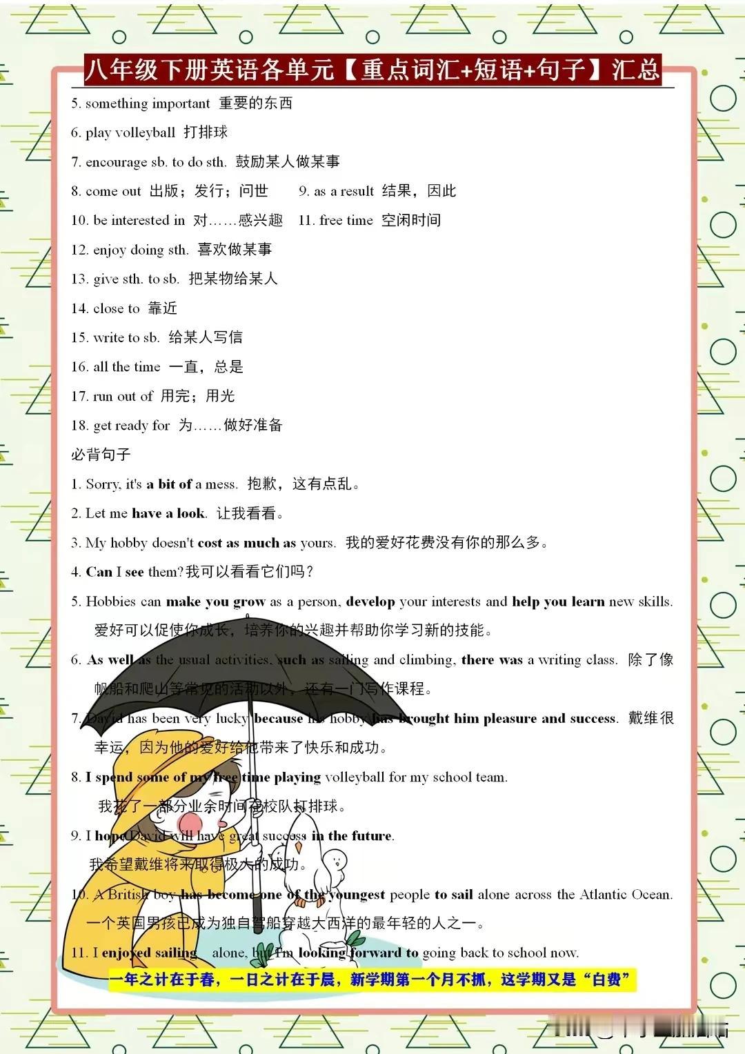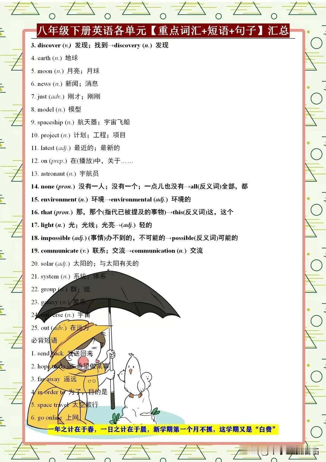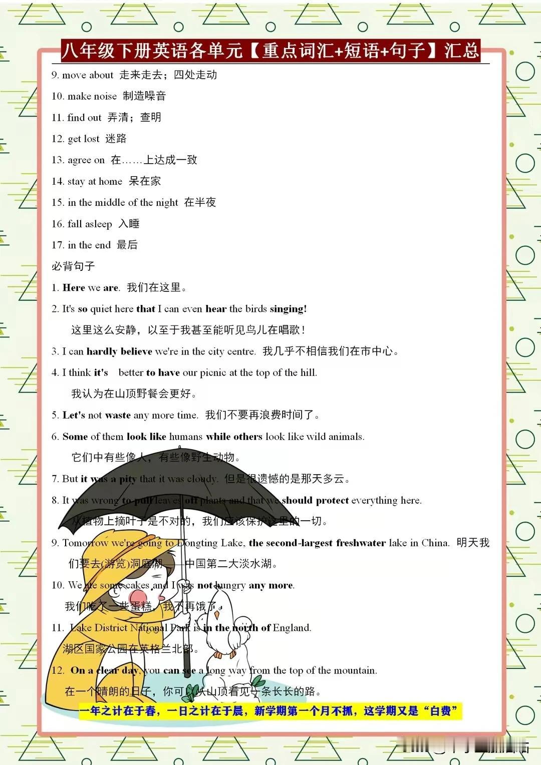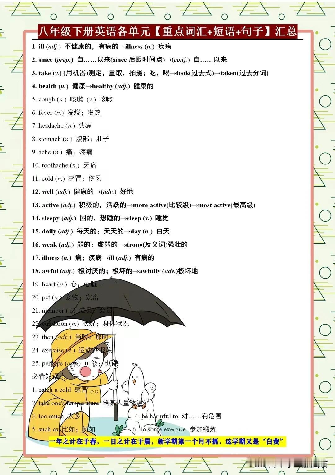 八年级英语各单元重点词汇、短语及句子,这才是英语的核心! 八年级英语,各单元汇聚了丰富的词汇、短语与句子,它们构成了英语学习的坚实基石。从生动的动词到精准的形容词,从实用的短语到地道的句子,每一单元都蕴藏着语言的魅力与智慧。 掌握这些核心词汇,不仅能提升我们的表达能力,更能深化对英语文化的理解。因此,同学们应珍视每一次学习机会,努力积累、灵活运用,让英语成为我们探索世界的得力助手。只有扎实打好语言基础,我们才能在英语学习的道路上越走越远,收获满满的知识与自信。 【左上角,点击我的“头像”,进入主页,有电子版获取方式】