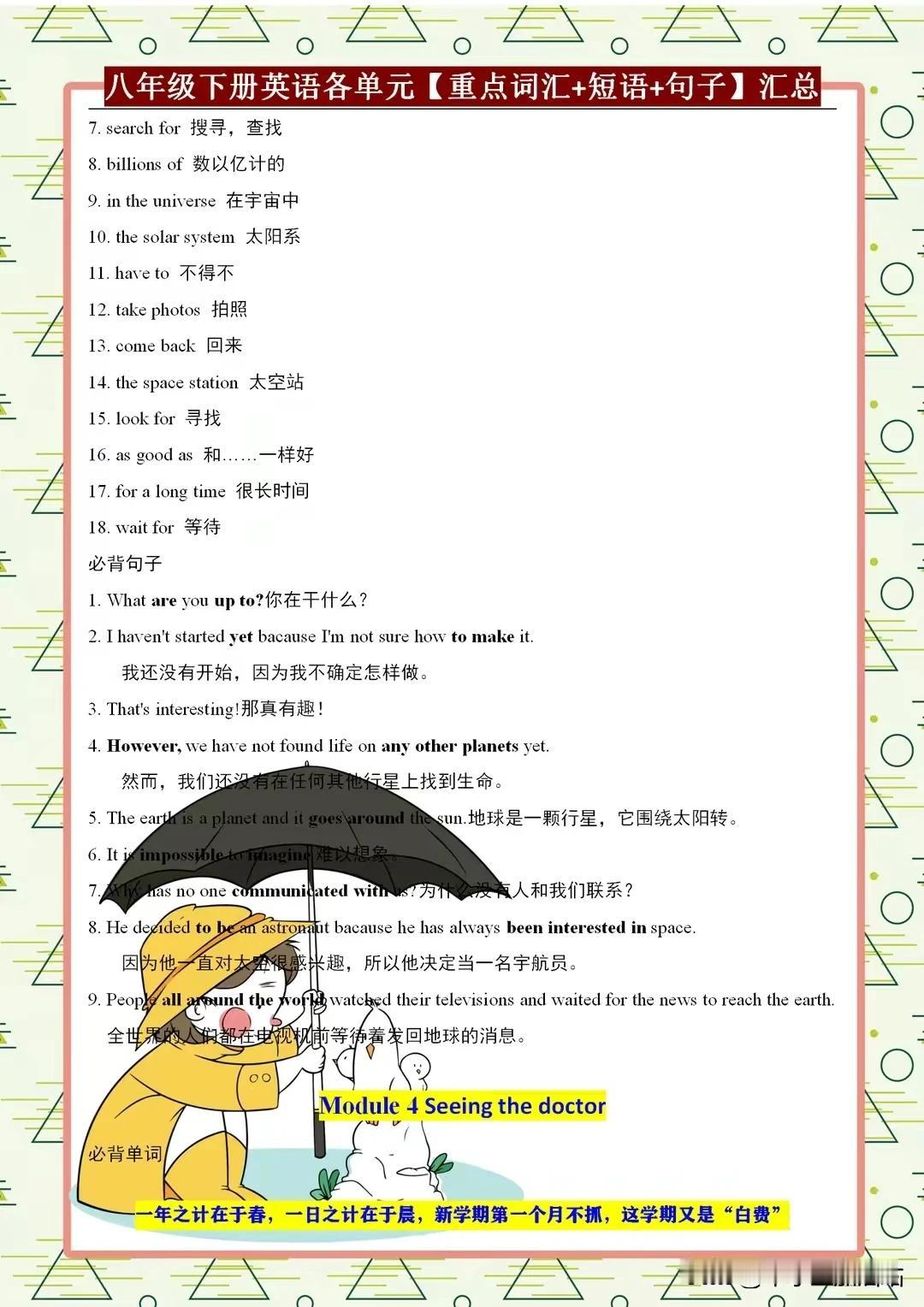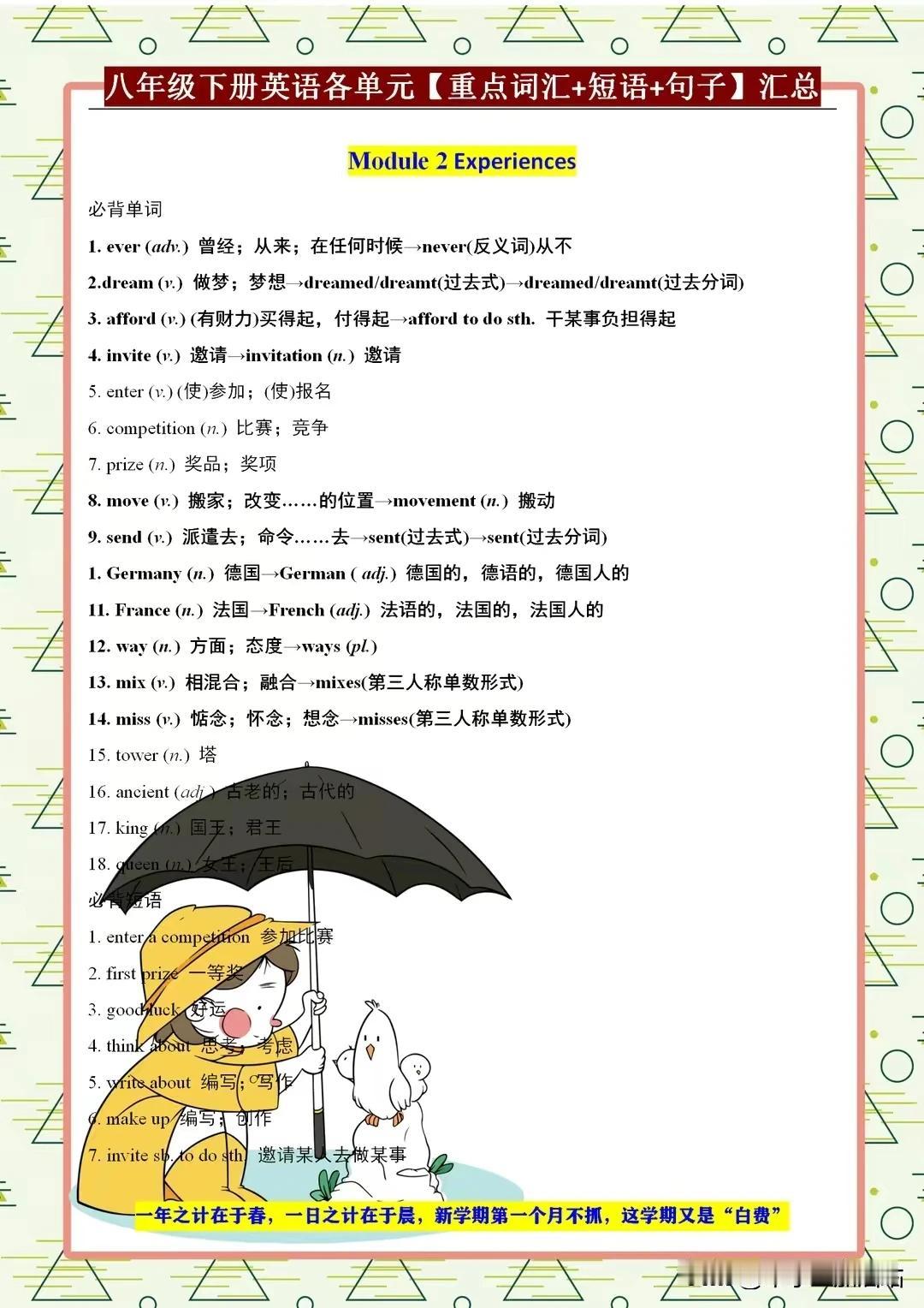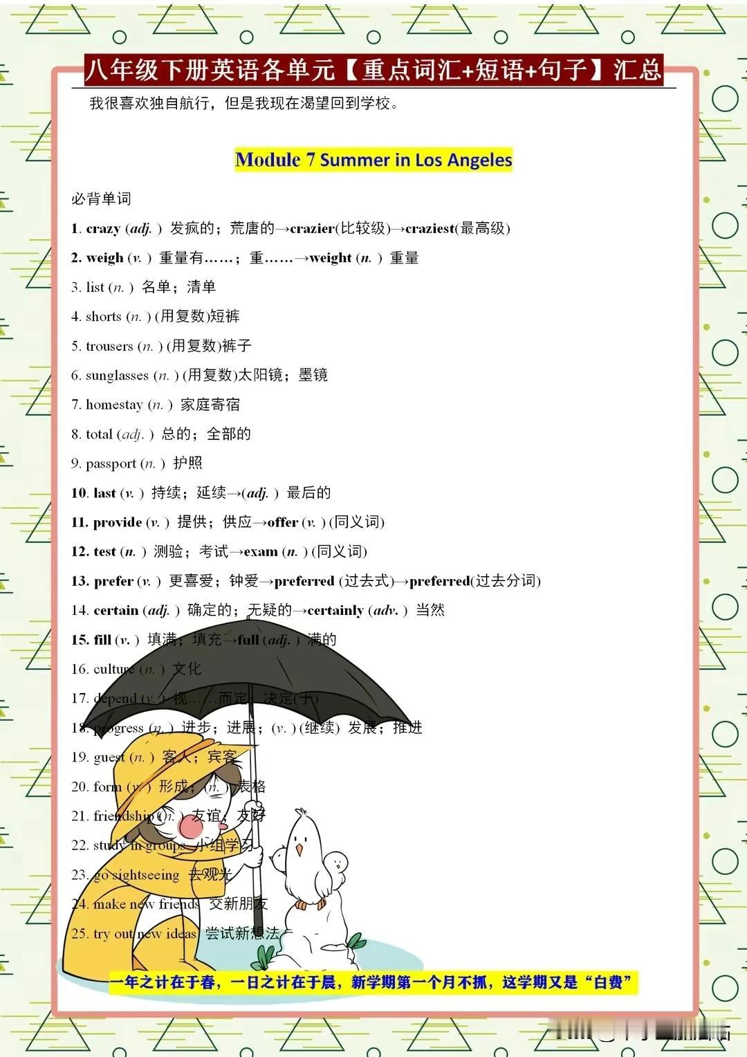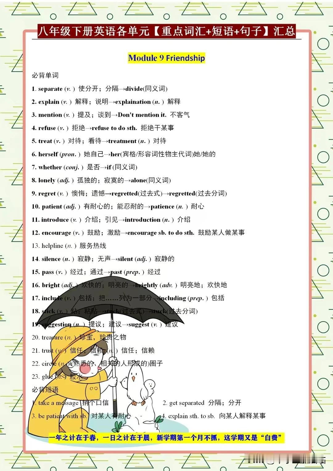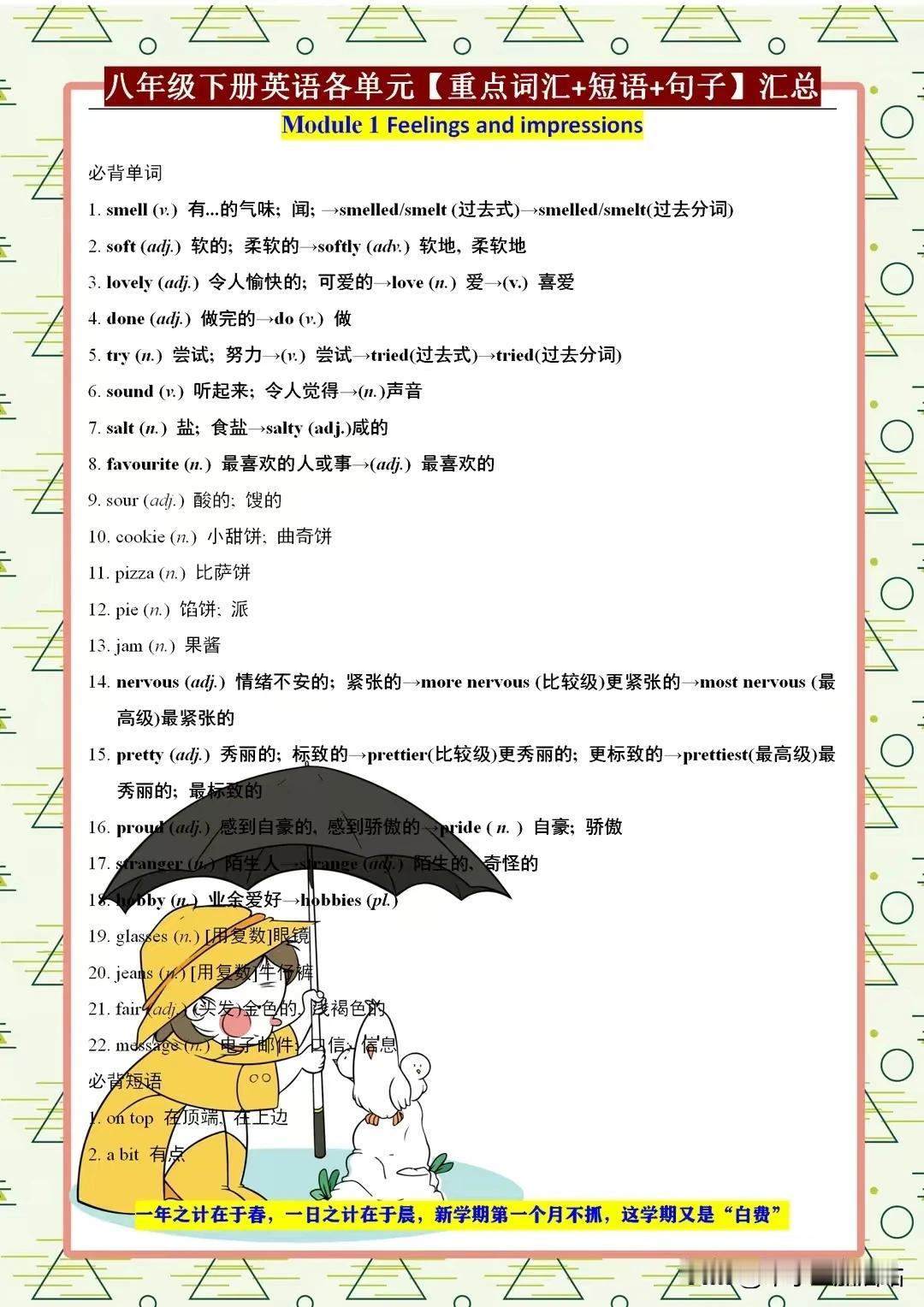 八年级英语各单元重点词汇、短语及句子,这才是英语的核心! 八年级英语,各单元汇聚了丰富的词汇、短语与句子,它们构成了英语学习的坚实基石。从生动的动词到精准的形容词,从实用的短语到地道的句子,每一单元都蕴藏着语言的魅力与智慧。 掌握这些核心词汇,不仅能提升我们的表达能力,更能深化对英语文化的理解。因此,同学们应珍视每一次学习机会,努力积累、灵活运用,让英语成为我们探索世界的得力助手。只有扎实打好语言基础,我们才能在英语学习的道路上越走越远,收获满满的知识与自信。 【左上角,点击我的“头像”,进入主页,有电子版获取方式】