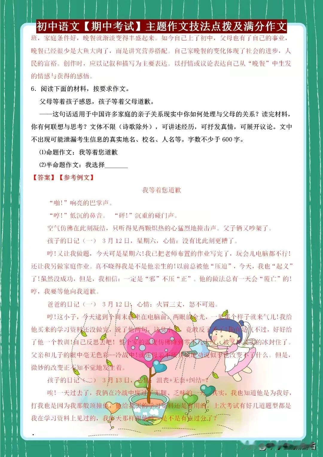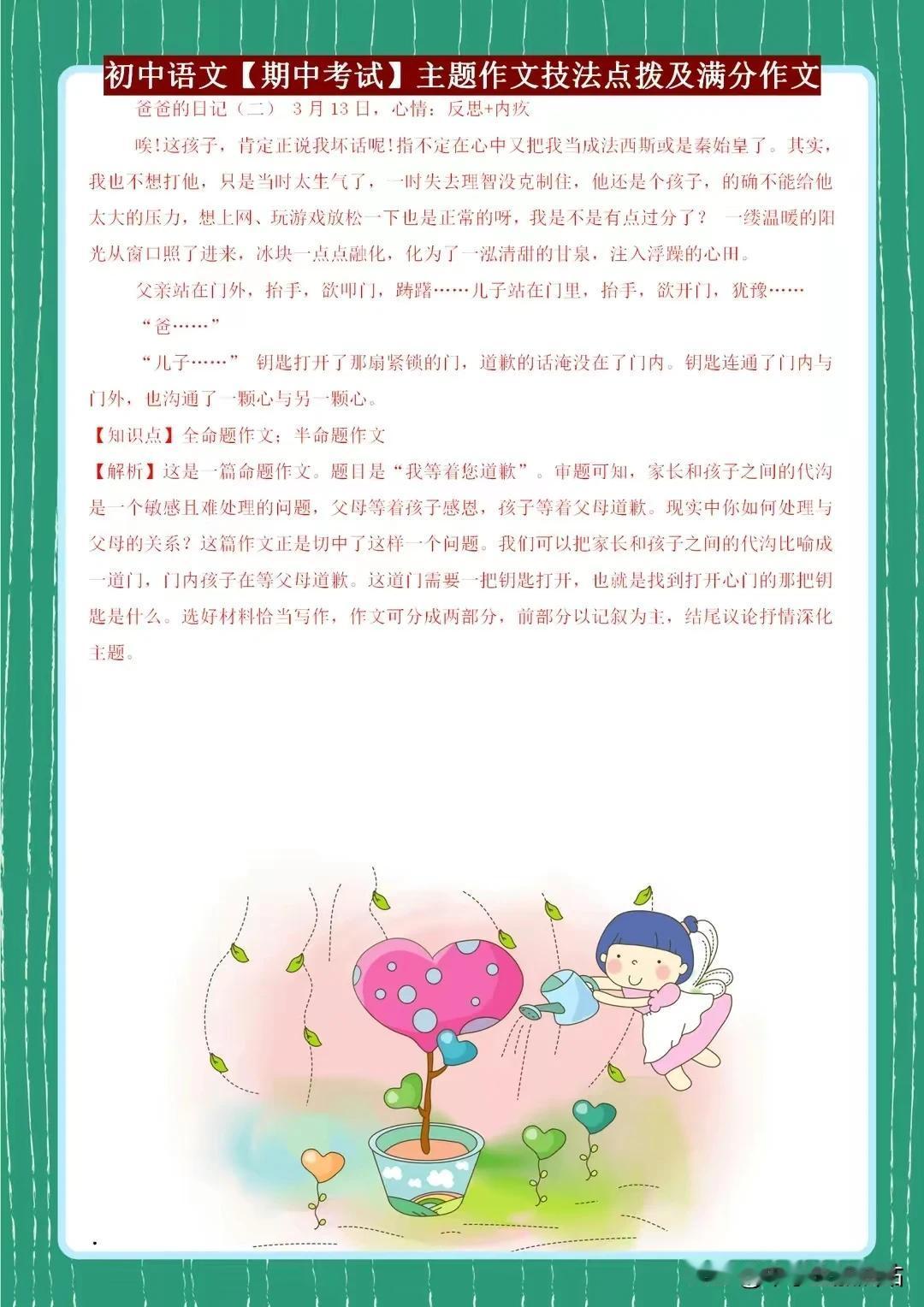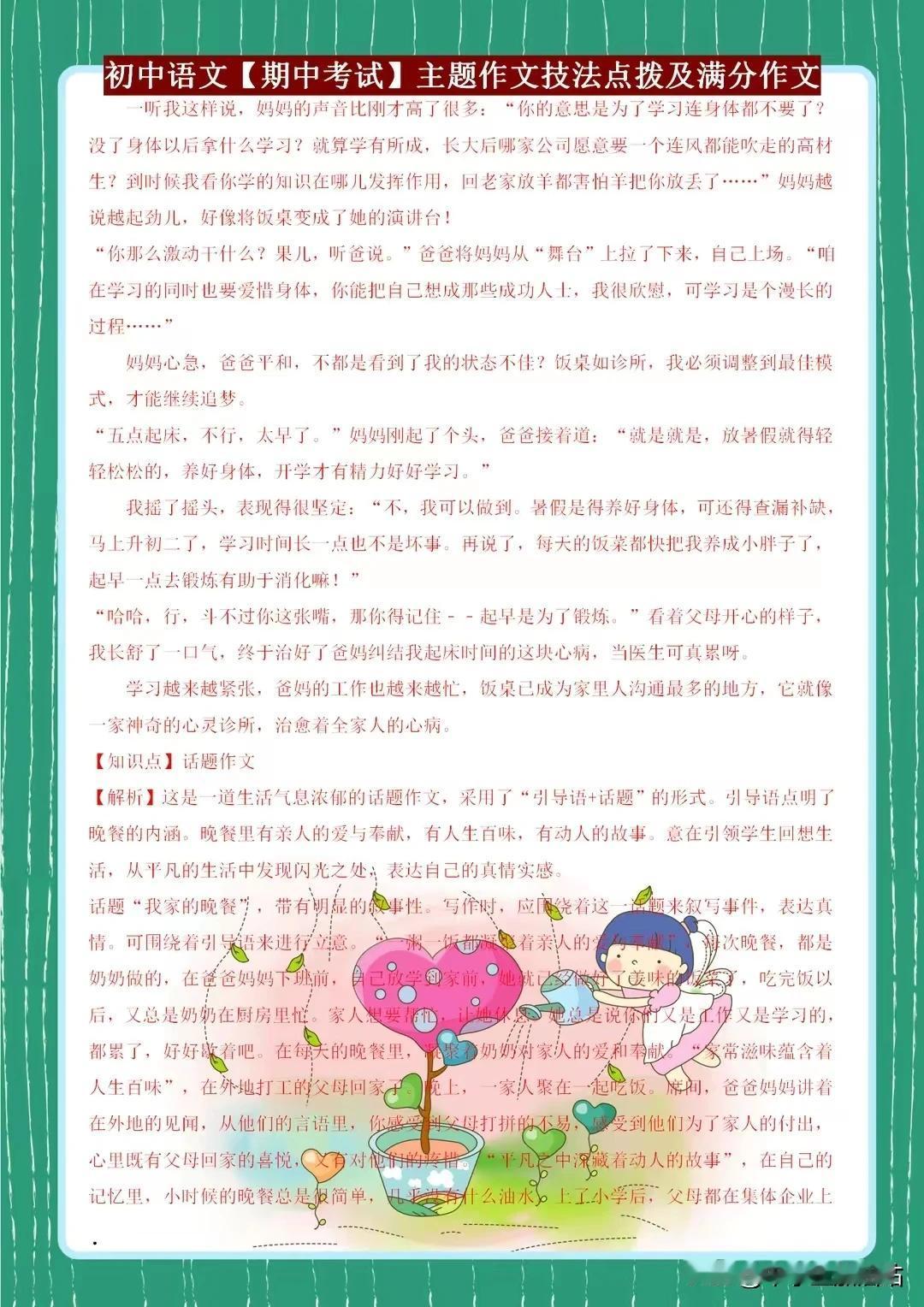 初中语文【期中考试】高频作文——主题作文的写作方法及经典范文 初中语文期中考试,作文是重头戏。高频主题作文需注重写作方法:明确主题,紧扣题意;构思巧妙,条理清晰;语言生动,情感真挚。经典范文是学习的宝库,通过研读范文,可汲取其精华,提升写作水平。 同学们,要勤于积累素材,善于观察生活,用心感受世界。掌握这些方法与技巧,再结合范文的启示,相信你们的作文定能脱颖而出,赢得佳绩! 【左上角,点击我的“头像”,进入主页,有电子版获取方式】