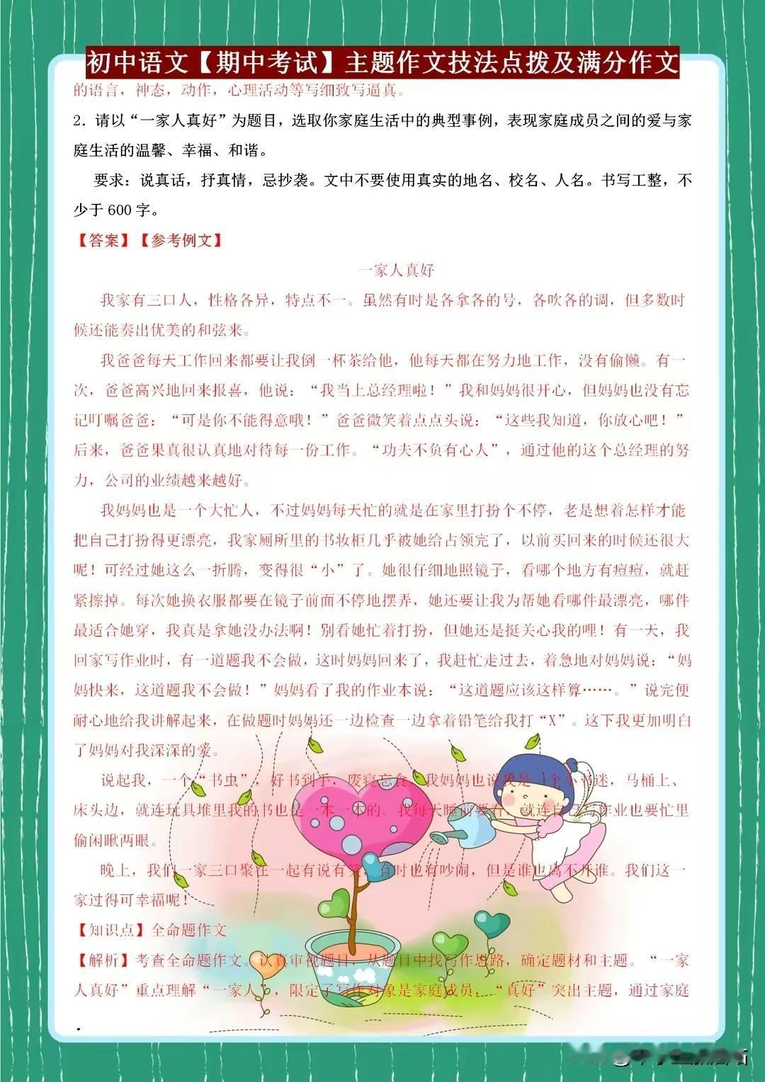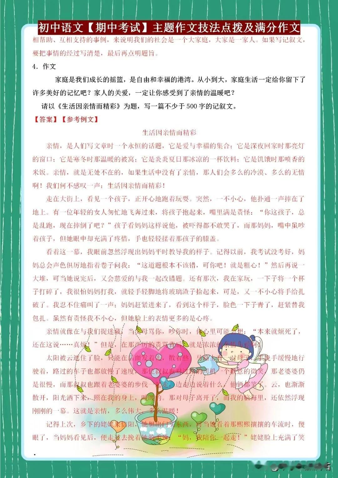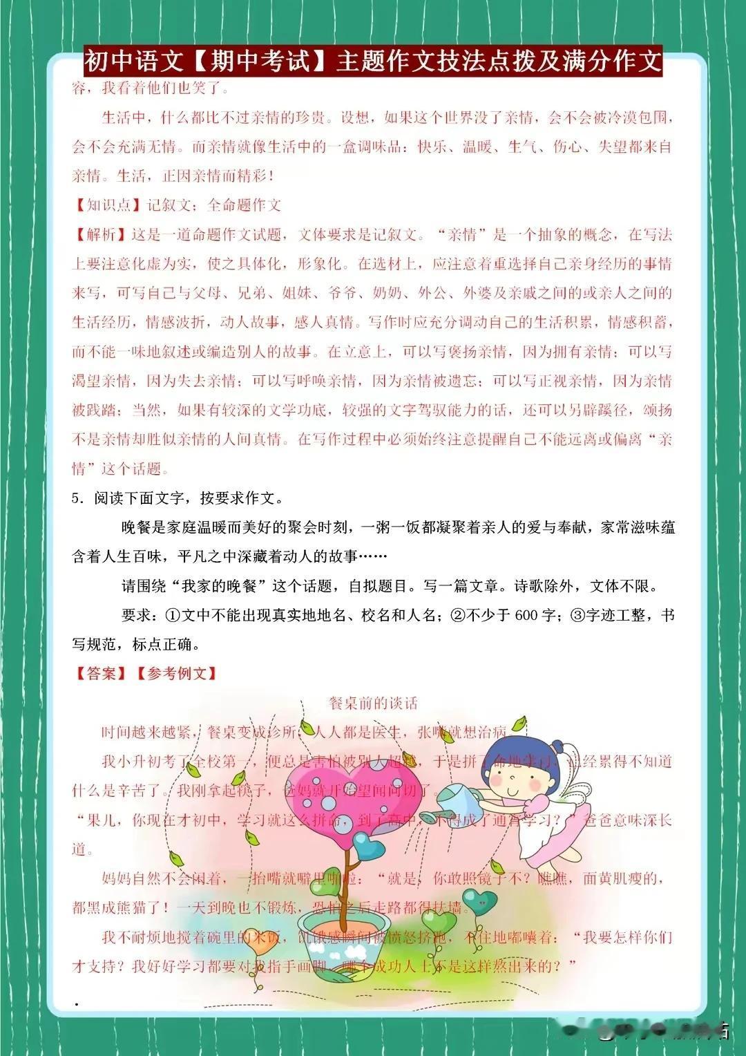初中语文【期中考试】高频作文——主题作文的写作方法及经典范文 初中语文期中考试,作文是重头戏。高频主题作文需注重写作方法:明确主题,紧扣题意;构思巧妙,条理清晰;语言生动,情感真挚。经典范文是学习的宝库,通过研读范文,可汲取其精华,提升写作水平。 同学们,要勤于积累素材,善于观察生活,用心感受世界。掌握这些方法与技巧,再结合范文的启示,相信你们的作文定能脱颖而出,赢得佳绩! 【左上角,点击我的“头像”,进入主页,有电子版获取方式】