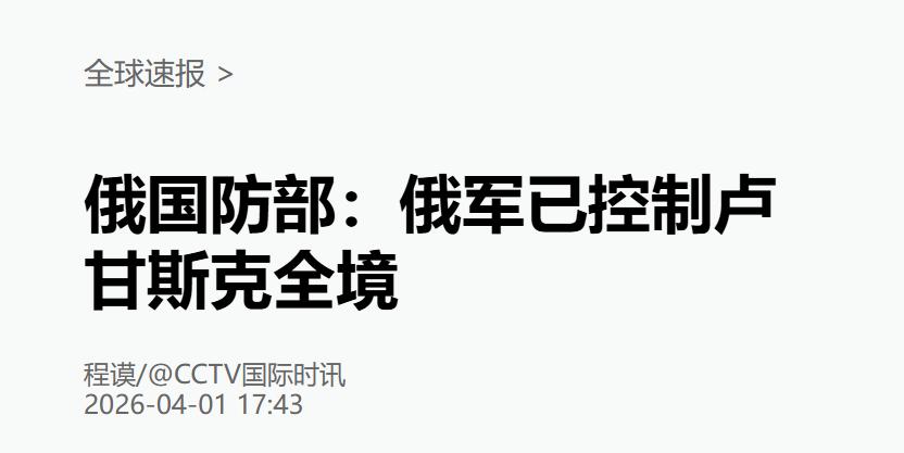 当地时间4月1日,俄罗斯卫星通讯社援引俄国防部的官方消息,明确表示俄“西部”集团军部队已经完成了卢甘斯克人民共和国的收复任务。