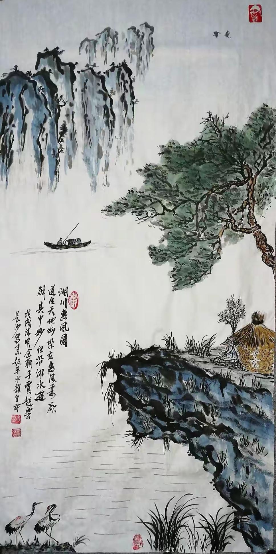 贾越云的稻垛画作品像他的山水画、兰花画一样,也是“诗画融合”的典范。他常在稻垛画面上题写平水韵自撰格律诗,如画故乡扶夷江川的《三学子夷江望月图》、画湘江河川的《静夜听涛图》、画北京永定河川的《江上静观图》、画台湾淡水河川的《淡川逢读史记农夫图》等一批稻垛画上的题诗,都极大地增强了画面的哲理性和文学意境。这种古老的传统在他的笔下被激活,展现出了强大的当代表现力。
