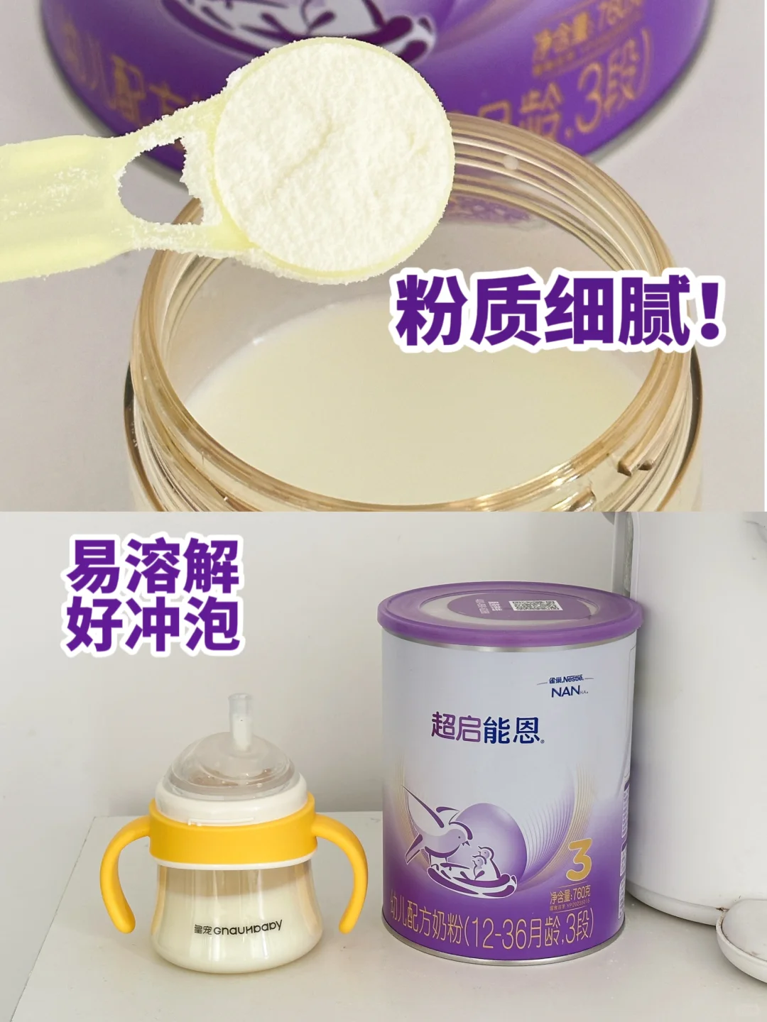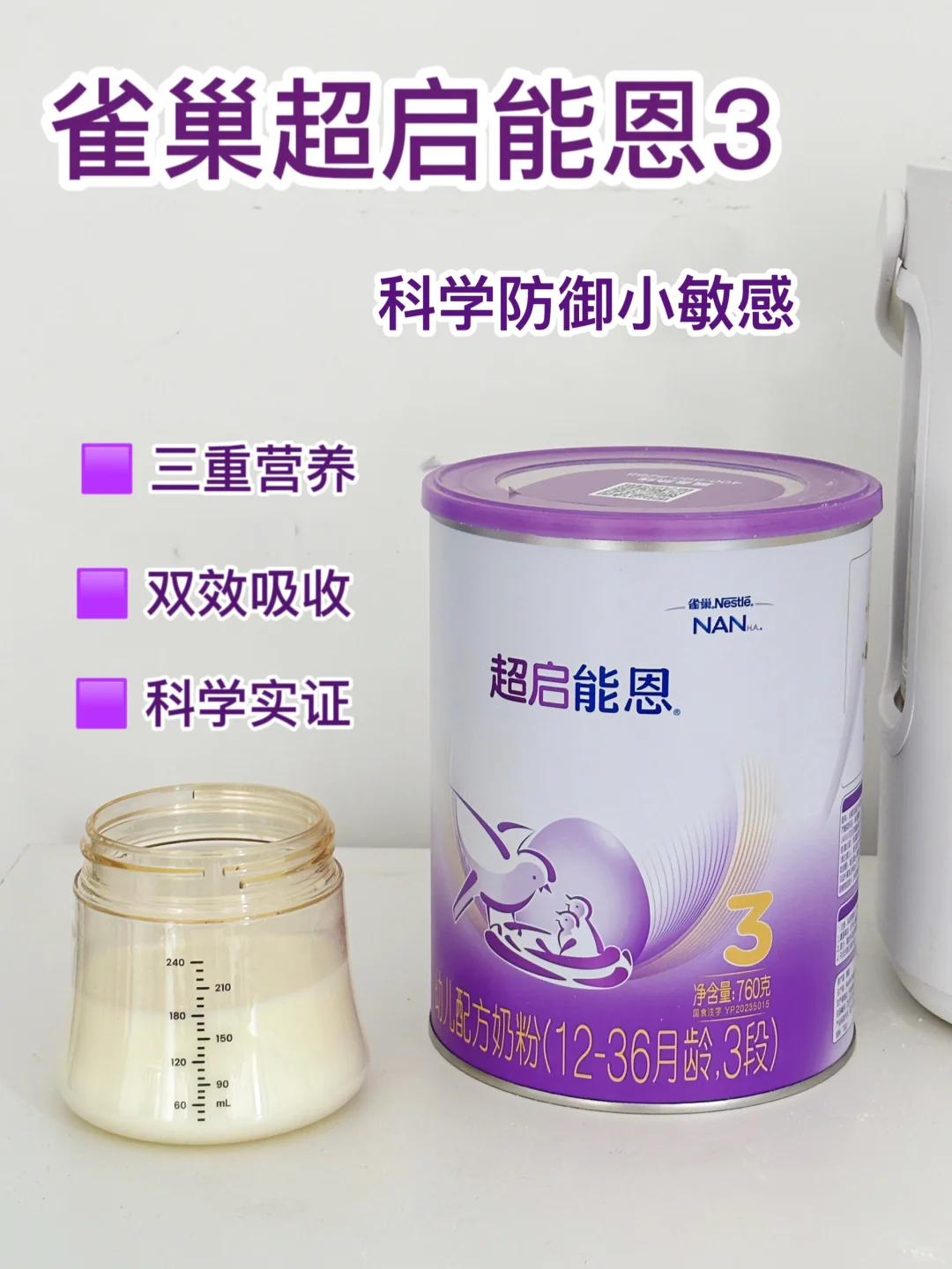 因为普通奶粉里的大分子蛋白对于小敏感宝宝娇嫩的肚肚来说是满满的负担,所以建议我们把奶粉换成部分水解奶粉,也叫适度水解奶粉,回家各种攻略,问身边的姐妹,最后选择了这款雀巢超启能恩3,他们家的口碑跟销量都是特别好的。