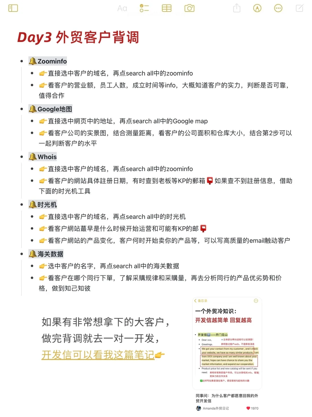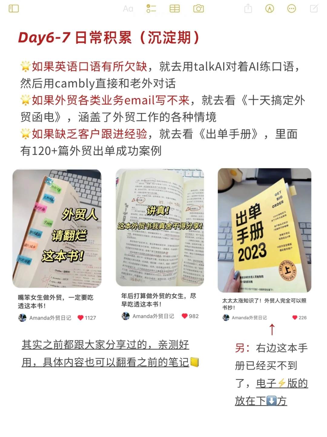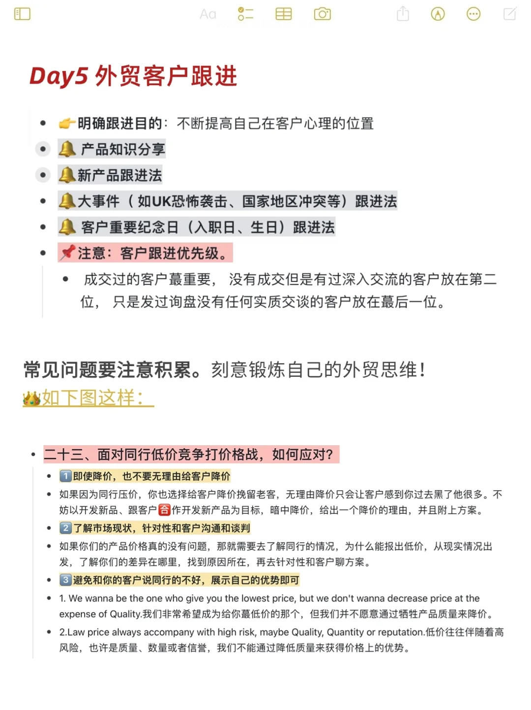 无论是没有经验的外贸新人,还是想不停向上的业务员,都可以参照我这个“7天学习法”。 7天为一个周期,每次学完,都会有所收获。 一个个周期不断地循环积累,就像水滴石穿,量变产生质变。 无论是你的开发背调能力,还是和客户沟通谈判的能力,乃至一些工作细节,都会得到质的飞跃。 加油吧外贸人!💪