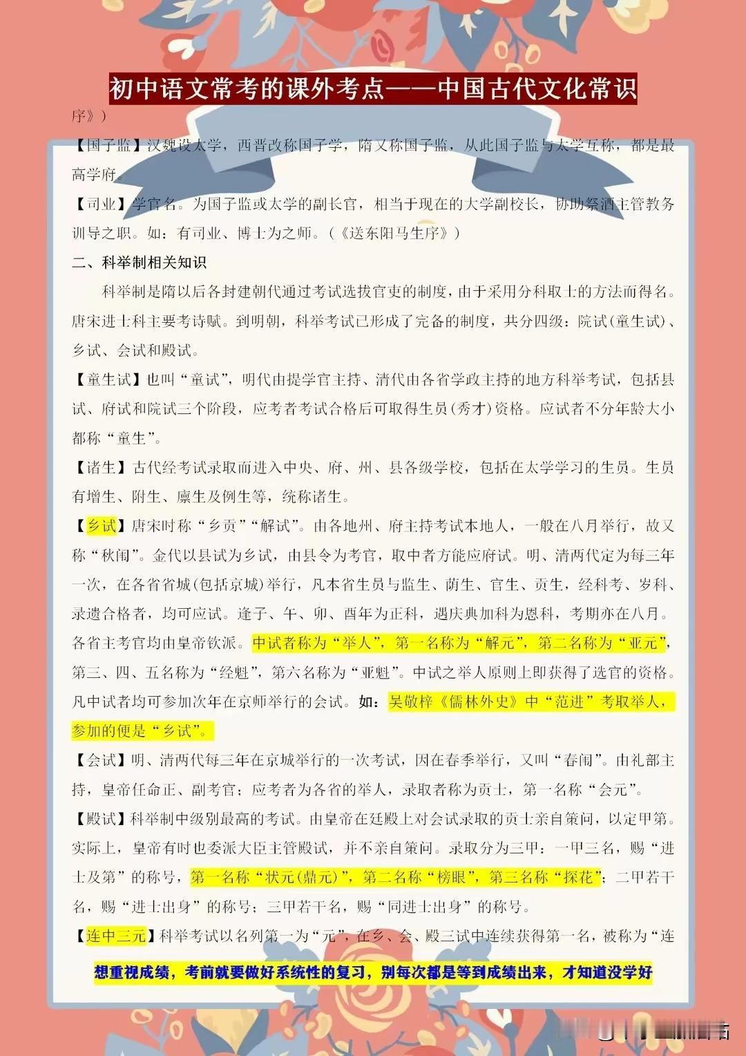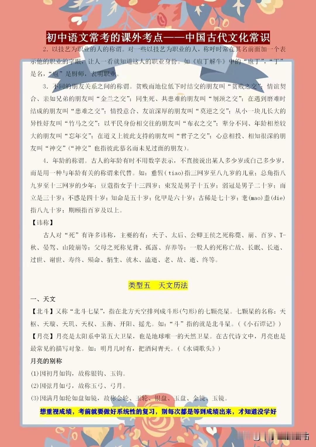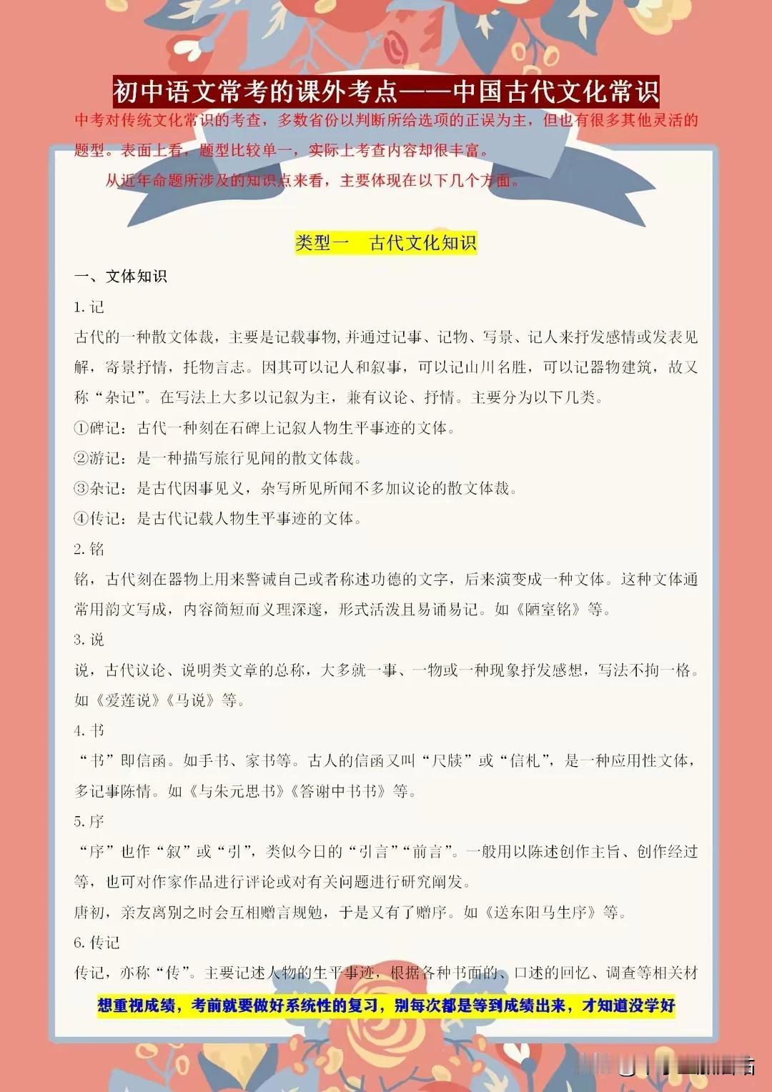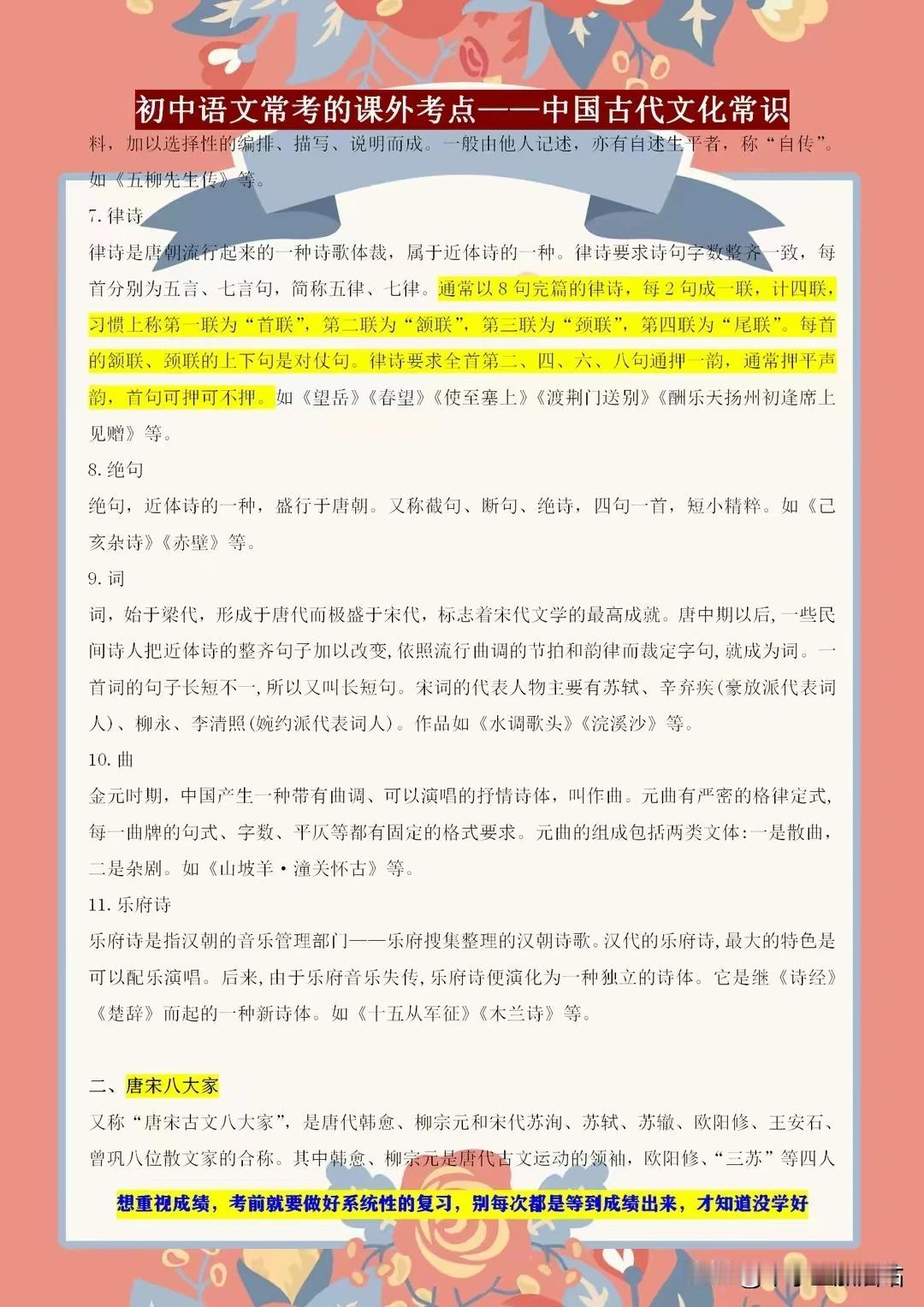 初中语文常考的课外知识点——古代文学常识,课上不讲的都在这! 初中语文考试中,古代文学常识是课外知识点的重要一环。课上未及细讲的内容,这里一应俱全!从先秦诸子到唐宋八大家,从诗词歌赋到戏曲小说,我们带你领略古代文学的博大精深。了解这些常识,不仅能提升你的文化素养,更能在考试中助你轻松应对。 别错过这个宝贵的学习机会,让我们一起探索古代文学的奥秘,感受中华文化的魅力!记住,这些知识点或许课上未讲,但考试中却可能遇到,提前掌握,赢在起跑线! 【左上角,点击我的“头像”,进入主页,有电子版获取方式】