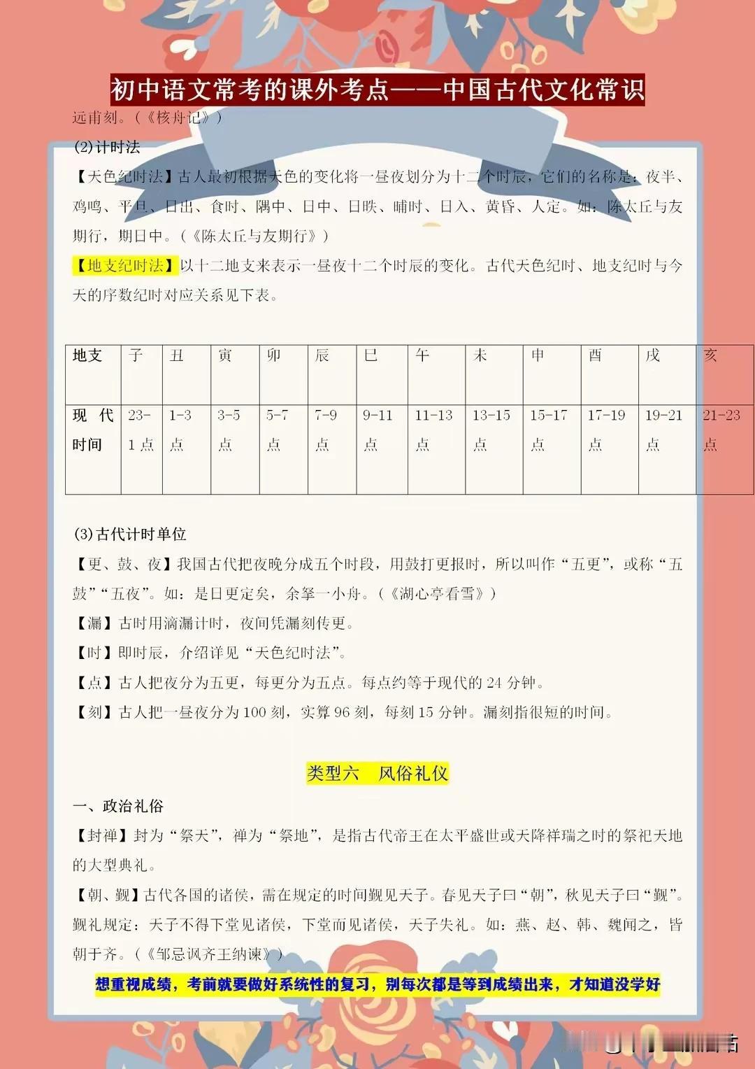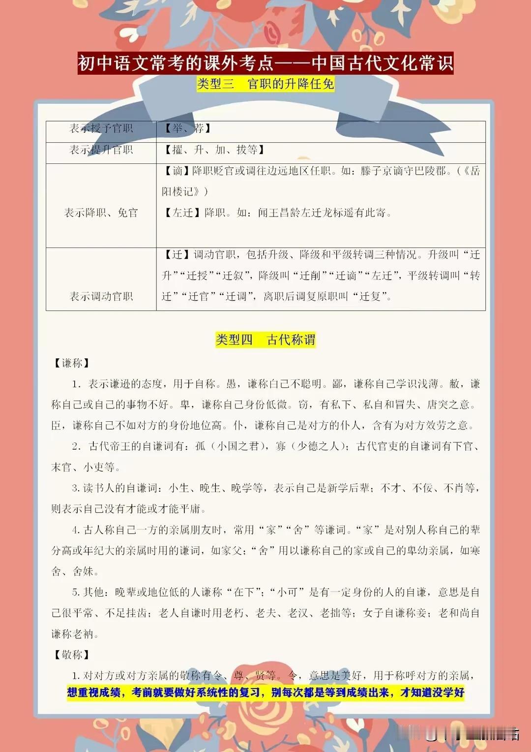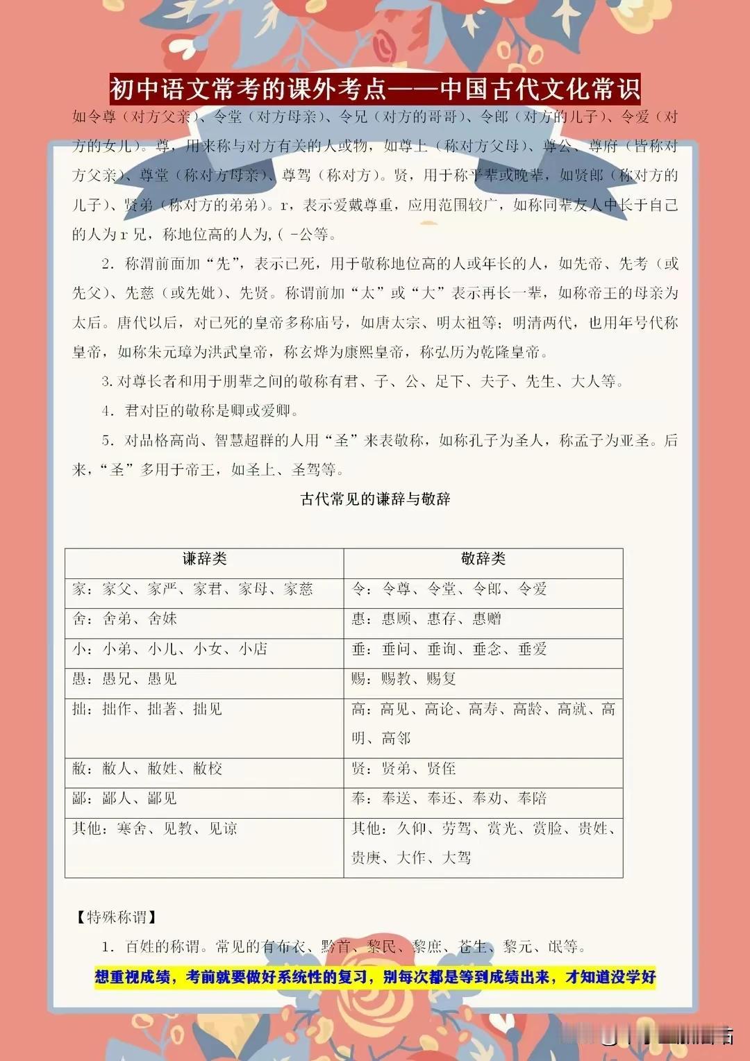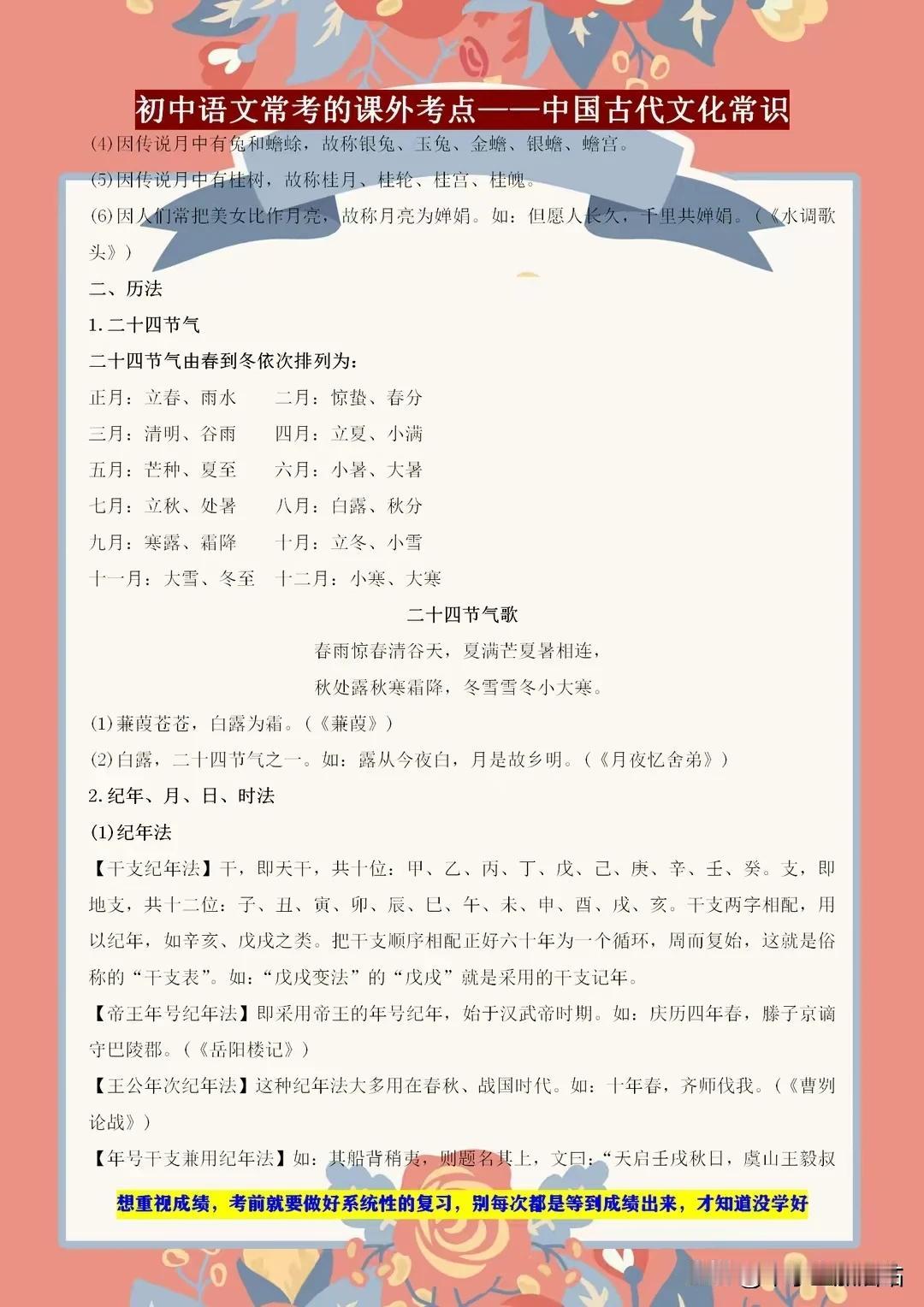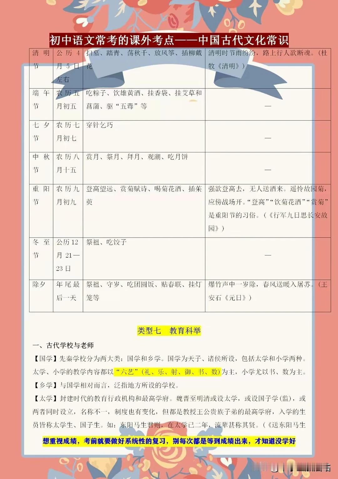 初中语文常考的课外知识点——古代文学常识,课上不讲的都在这! 初中语文考试中,古代文学常识是课外知识点的重要一环。课上未及细讲的内容,这里一应俱全!从先秦诸子到唐宋八大家,从诗词歌赋到戏曲小说,我们带你领略古代文学的博大精深。了解这些常识,不仅能提升你的文化素养,更能在考试中助你轻松应对。 别错过这个宝贵的学习机会,让我们一起探索古代文学的奥秘,感受中华文化的魅力!记住,这些知识点或许课上未讲,但考试中却可能遇到,提前掌握,赢在起跑线! 【左上角,点击我的“头像”,进入主页,有电子版获取方式】