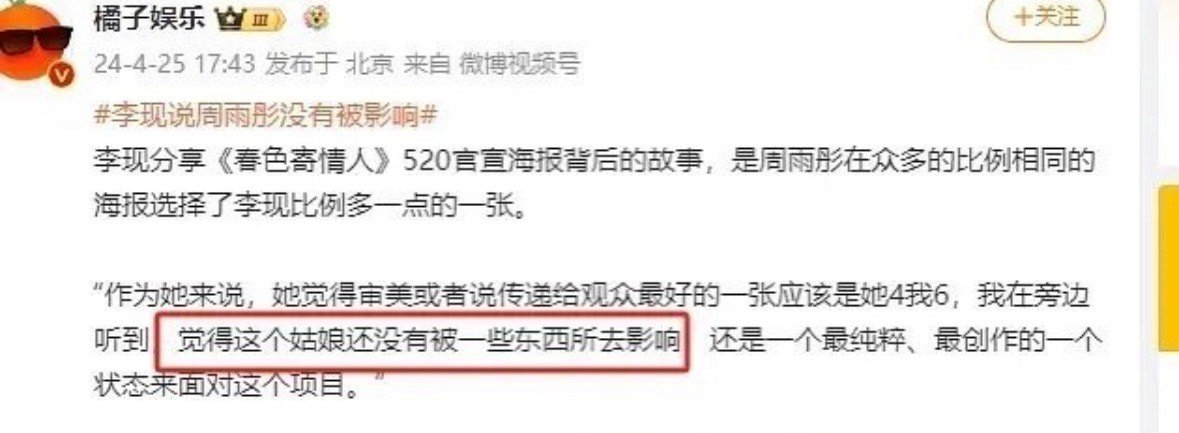 李现说在海报上,周雨彤没有被其他一些东西影响,而是注重审美,有一种创作的状态。然