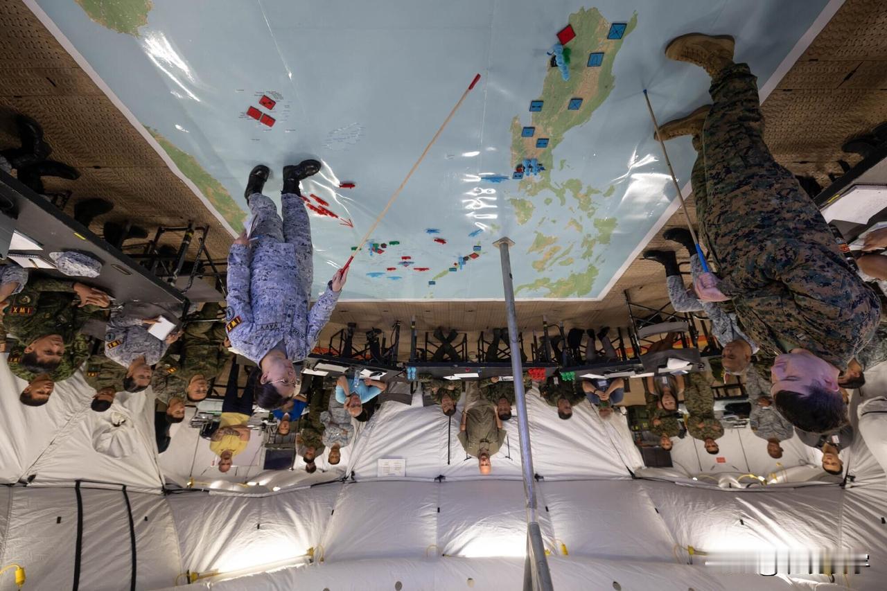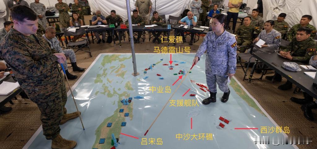 4月25日,美军与菲律宾武装部队进行的,所谓“肩并肩”联合军演,进行了地图沙盘兵棋推演。从公开的内容来看,涉及菲律宾武装吕宋岛和巴拉望岛的抗登陆作战,以及中国海军与美国海军,菲律宾海军在南海进行的海战,范围包括了西沙群岛,南沙群岛,菲律宾本土等。画面中,红方显然是中国海军,蓝方是美国海军,绿方是菲律宾武装部队。美军与菲律宾武装部队设想大概是中国收复南沙群岛岛礁后,美军出动中导,驱逐舰,核潜艇,开始打击中国,中国海军出动驱逐舰,护卫舰,登陆舰,核潜艇,实施攻击。甚至设想,中国在吕宋岛和巴拉望岛登陆了。美国陆军主力大头在欧洲,恐怕真打时候兵力不够守。美国陆军已经不会打头上没有美国空军,美国海军的仗了。按照菲律宾武装部队设想,中国,还有攻击菲律宾本土的需求?菲律宾本土我们不感兴趣,但是对在菲律宾建立的美军基地,我们首战必将率先摧毁。现在美国人是迫切想制造第二个乌克兰,拉中国下水,美国海军都在红海被也门胡塞武装揍了半年了,也就小马科斯还在这里配合美国演戏,毕竟小马科斯整个家族的钱和命都在美国本土呢。