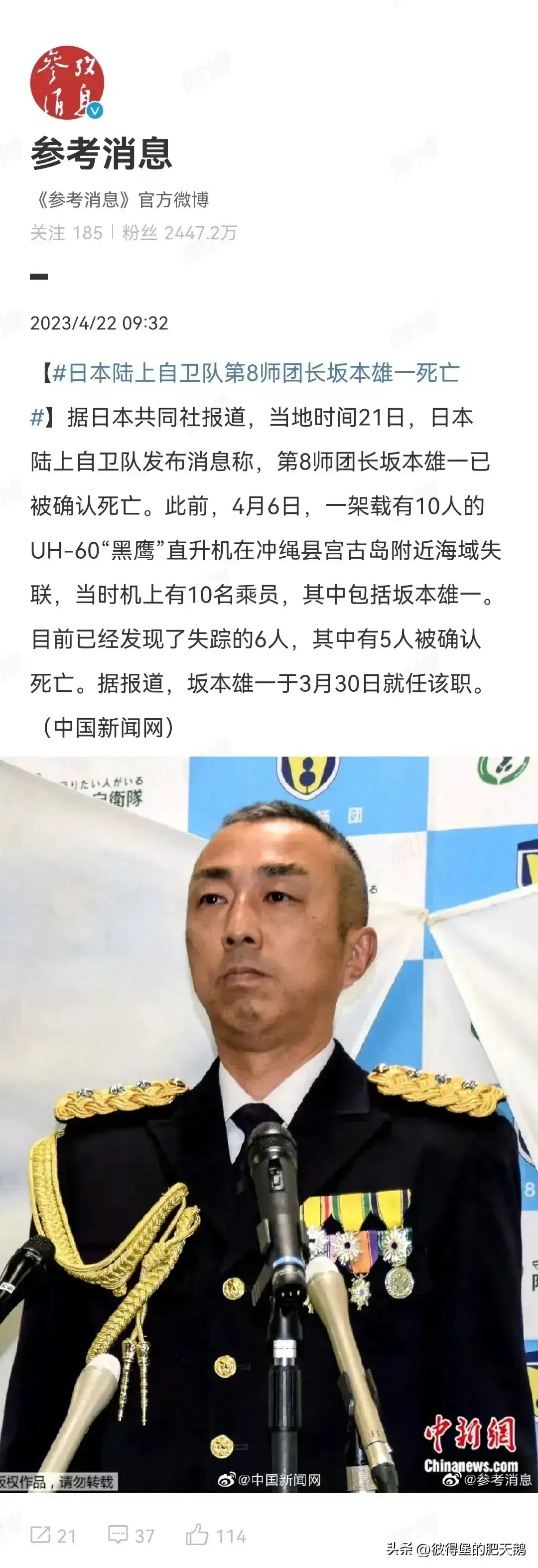 上一次可以追溯到2023年4月21日,那个说“台湾有事就是日本有事”的日本第八师团中将师团长坂本雄一也是演练自杀式攻击死了,一直没找出原因,人也找不到了。
