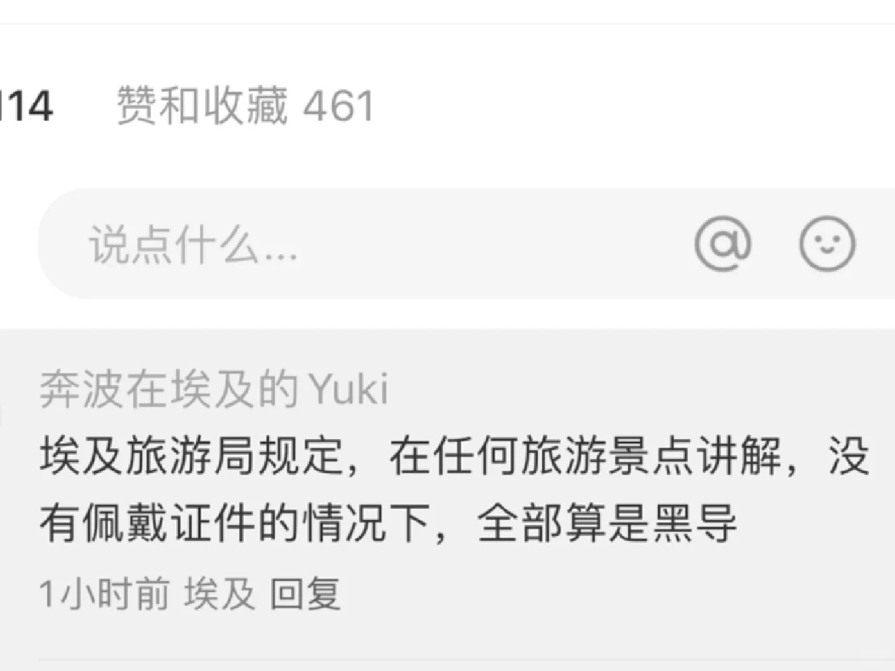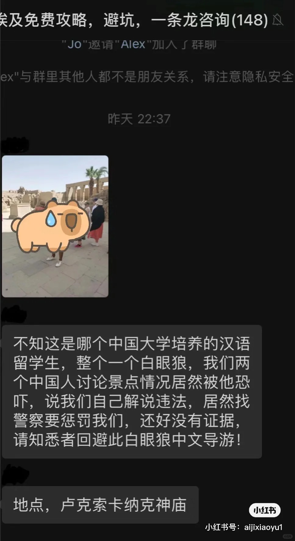 最近有不少人和我们遇到相同的情况,明明只是朋友间讨论历史,或者把导游的讲解再复述一遍给朋友听,都被莫名扣上了“黑导游”的帽子,即将去埃及自由行的中国兄弟姐妹们注意⚠️⚠️别被无赖缠上(没看懂的uu可以移步上一篇帖子)