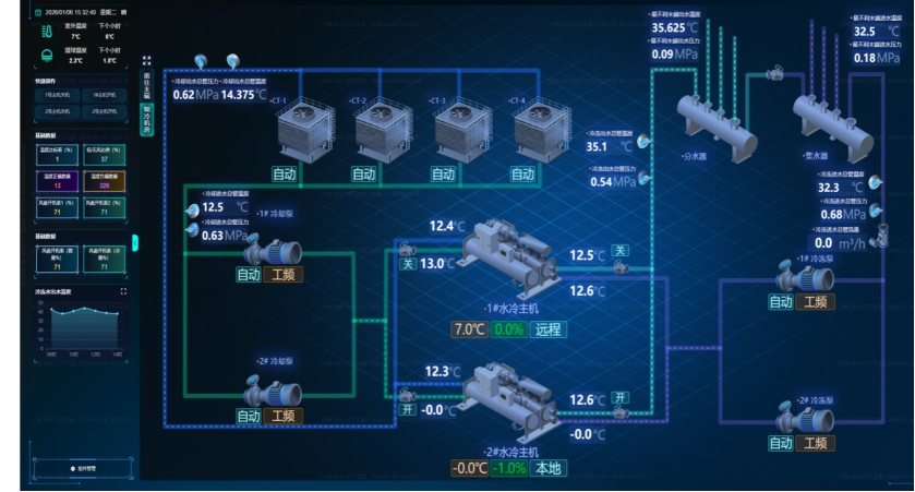 飞奕科技的平台系统能够实时监测并反馈每台机组的运行状态、关键参数及能耗数据,所有信息一目了然。此外,系统智能算法还能够综合政务大厅室内外温湿度、人员流动等实时数据,自动执行最优运行策略,在持续保障政务服务环境舒适的同时,最大限度降低能耗,助力政务中心实现舒适服务与节能降耗的高效平衡。