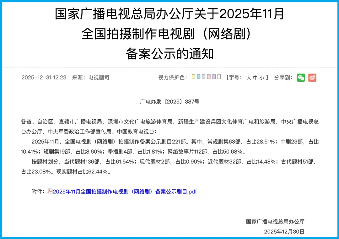 广电总局最新发布的《2025年11月全国拍摄制作电视剧(网络剧)备案公示剧目》一定程度上给出了答案。