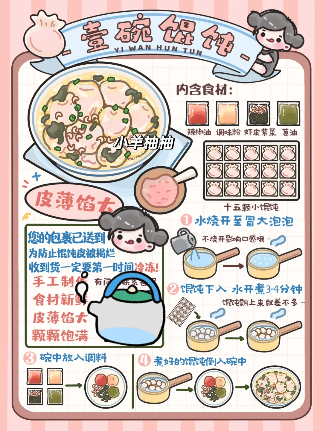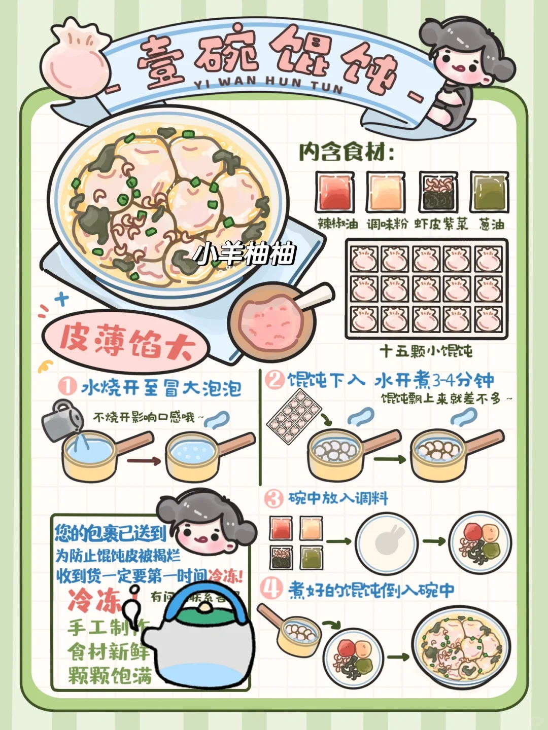 是给另一家私房馄饨设计的小卡片哦~已经发现很多很多抄袭我卡片的了(能不能好好做设计 不会设计就别来赚这个💰)我们柚子设计的卡片真的太好看了🤩这个ip是电阻宝宝原本就有的,我负责黑白logo转成了彩色卡通形象👍(就是说思路打开 手工水饺 手工冷吃 手工甜品都可以找我的 做一个小卡片让顾客了解制作流程,半成品怎么操作,真的直接把产品拉高一个档次 做贴心电阻💡)