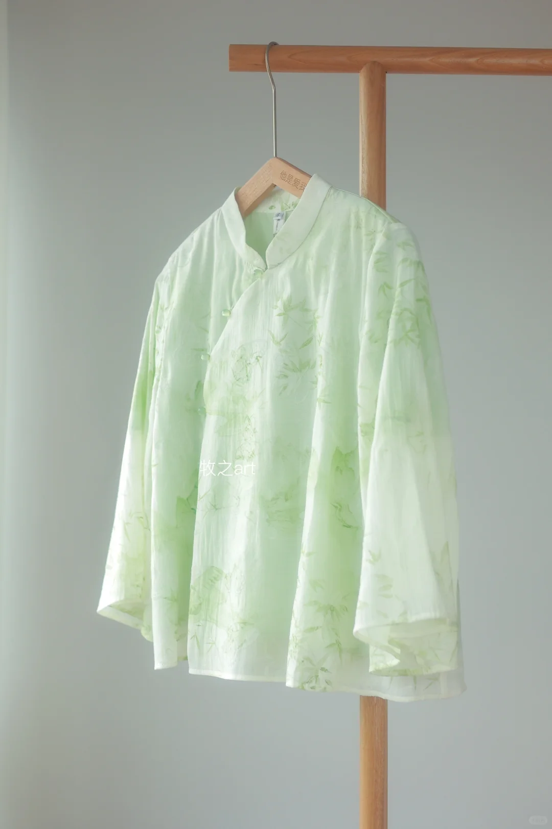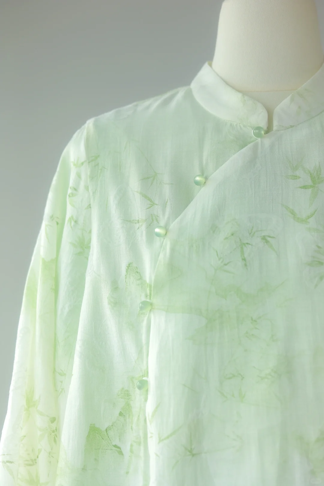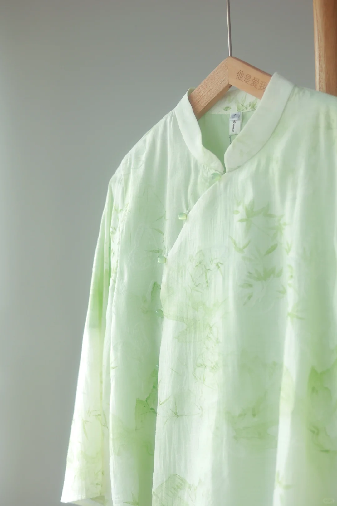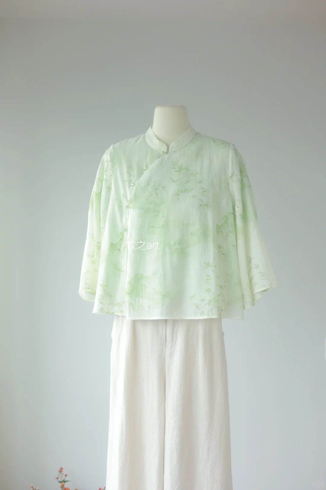 面料真的太灵动啦,印花➕提花面料 自然清新 斜襟浅绿色珠扣,方便穿脱 宽松的版型,包容性很强,适合所有体型的姑娘,有新中式的清新自然 有内衬 上衣袖子的内衬是短袖的,夏天穿也不会闷热 3️⃣码,有少量现货 搭配半裙或者裤子都好看~ 裤子:知君 -