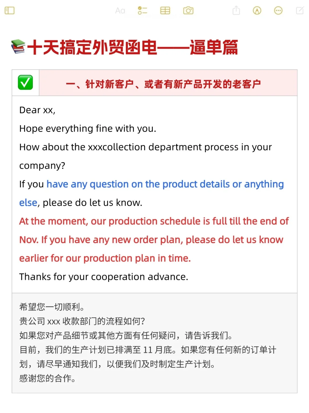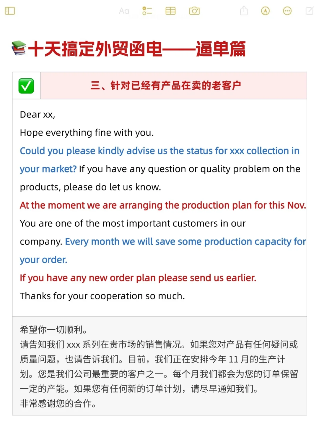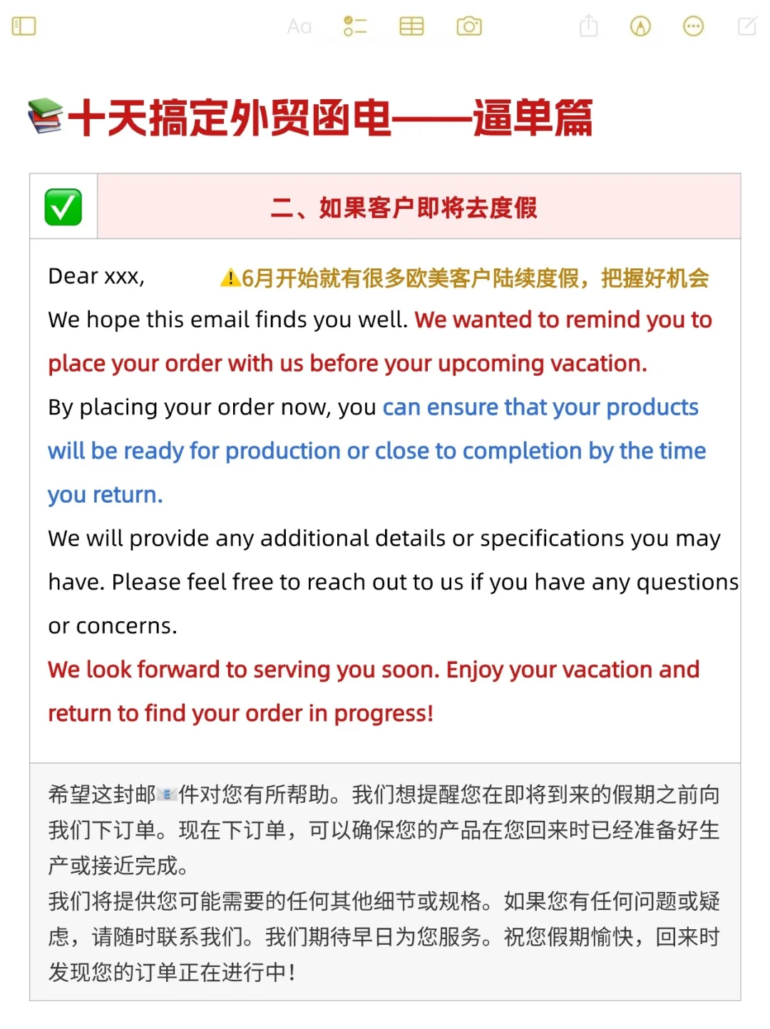 其实,外贸客户只问不买的情况,非常常见,有些客户真的很难搞😅 不过对于外贸新人来说,这里要学的一课就是“逼单”,学会对不同的客户、不同的进程,选择不一样的逼单理由。 之前也有分享过这本📚十天搞定外贸函电,帮你应对各种常见的业务情况,不同的阶段如何跟客户沟通。 - 另外要提醒一下大家,6月份开始欧美客户就陆陆续续开始度假了,如果有意向客户,争取五月能把订单谈妥✊ 不然战线会拉得很长,很心累🤦🏻♀️