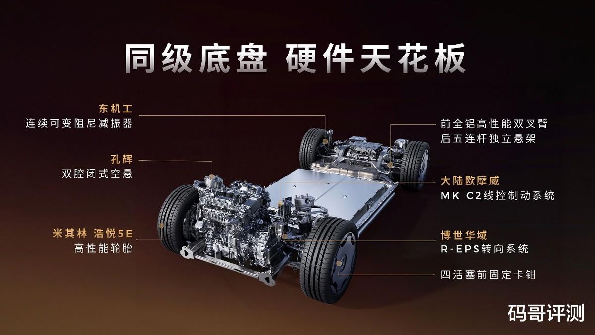 零跑D19底盘架构100%自研,搭载前双叉臂、后五连杆独立悬架,经中欧联合专业团队精细化调校,兼顾操控精准与乘坐舒适。纯电版三电机四驱,最大功率540kW、峰值扭矩745N·m,零百加速3秒级,双矢量电驱可实现毫秒级扭矩分配,过弯更稳、加速更强。同时,新车还配备孔辉双腔闭式空气悬架、东机工连续可变阻尼减振器,搭配博世华域R-EPS转向、欧摩威(原大陆)MKC2线控制动、四活塞前固定卡钳和米其林高性能轮胎,硬件规格媲美百万级豪车。