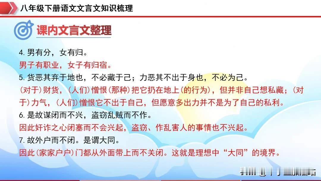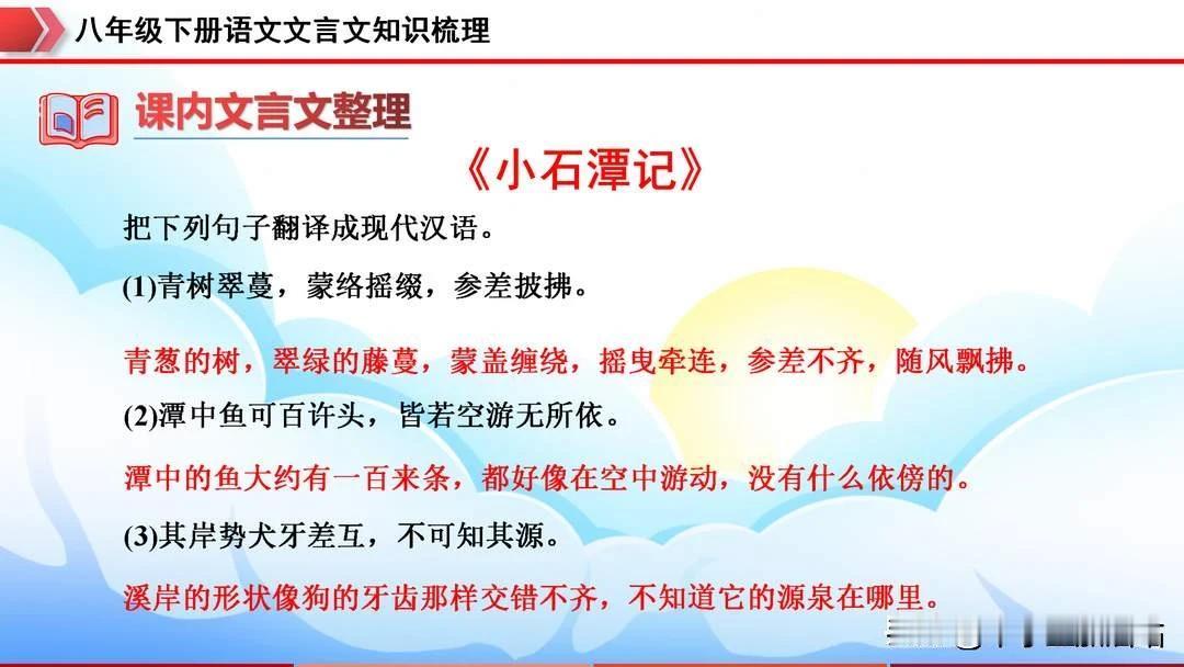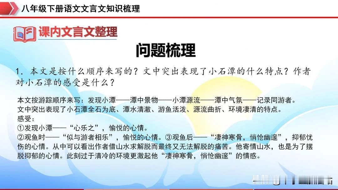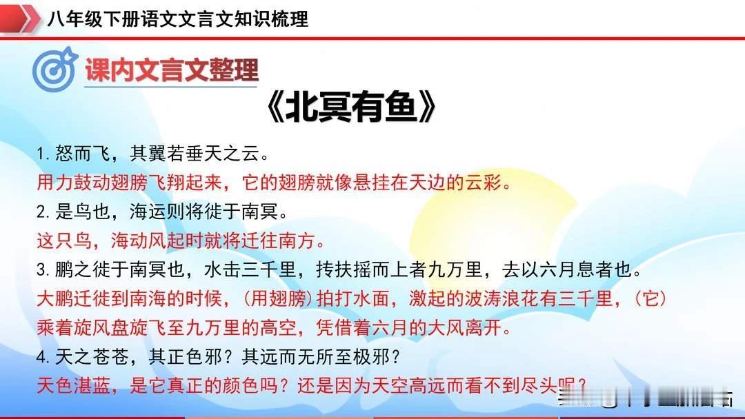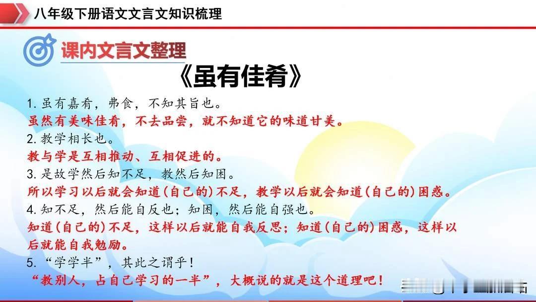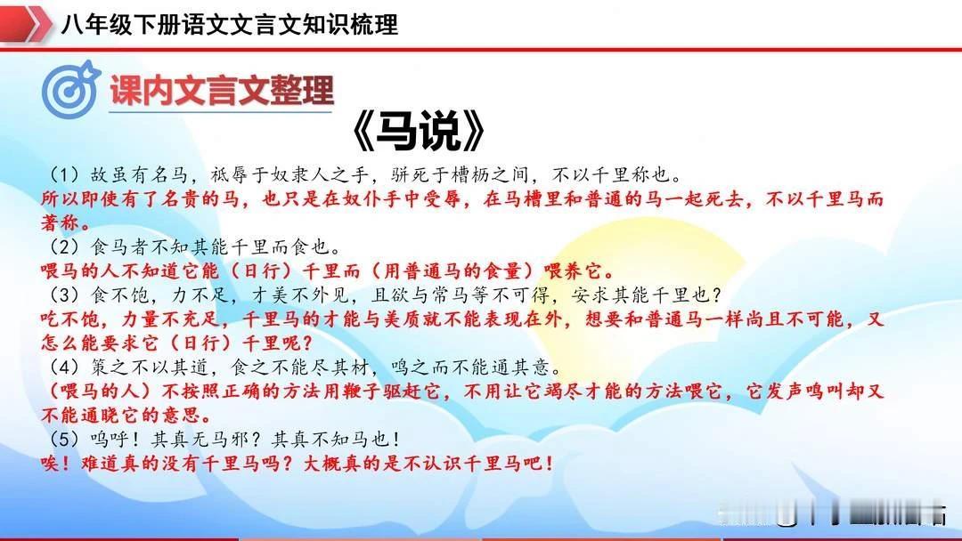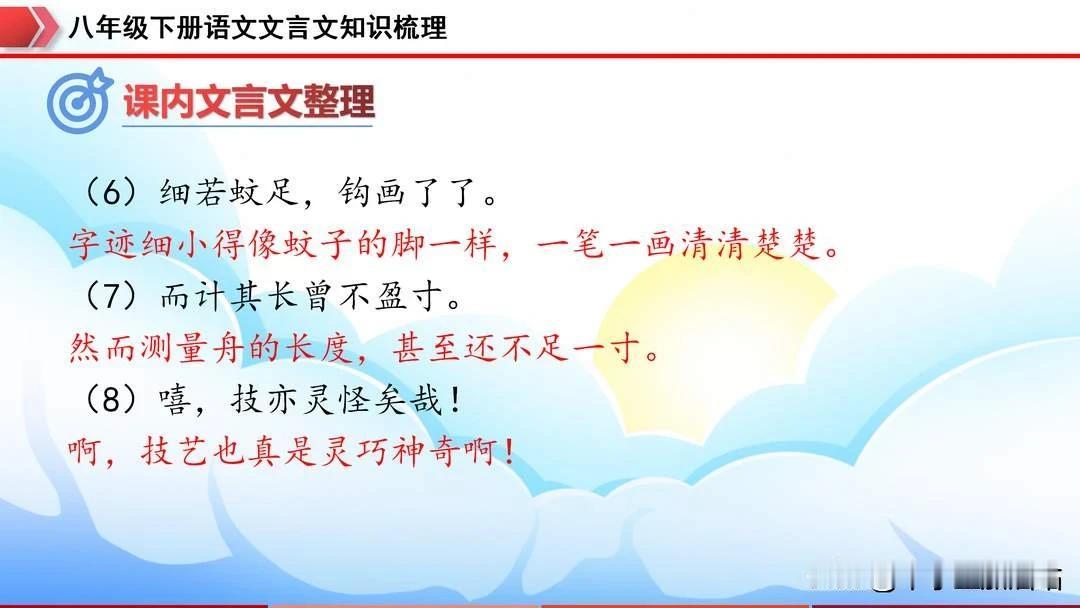 八年级语文课内文言文知识梳理,吃透这些字词句,文言文再也不怕! 八年级语文课内文言文知识,是学习古代文化的重要窗口。字词句的理解,是解读文言文的基础。我们要仔细梳理每篇文言文的重点字词,掌握其含义和用法;深入理解句子结构,把握文言文的语法特点;同时,还需品味文中的经典名句,感受古人的智慧与情感。 吃透这些字词句,不仅能提升文言文阅读能力,更能培养我们的文化素养。让我们用心去感受文言文的魅力,让文言文学习变得轻松有趣,再也不用害怕文言文了! 【左上角,点击我的“头像”,进入主页,有电子版获取方式】#八年级语文# #六下文言文练习# #初中语文怎么学# #语文课内积累# #语文复习课件#