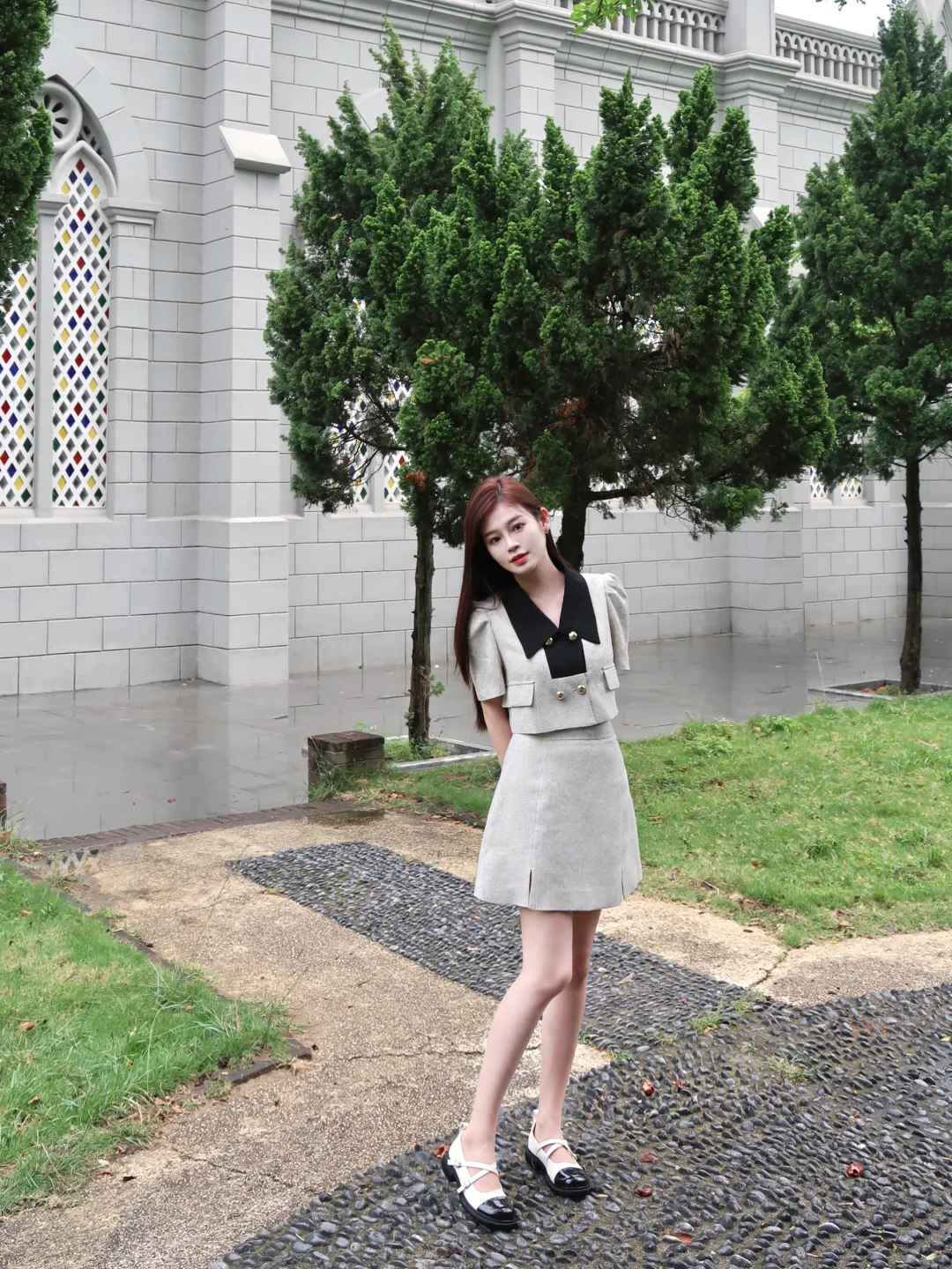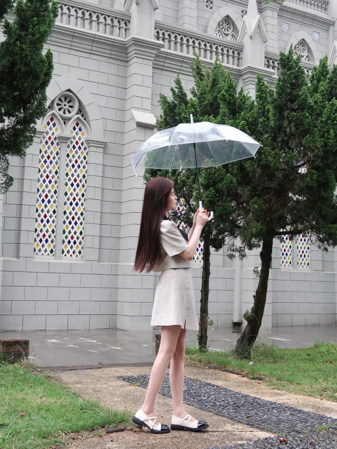 广东的天气就像女人的心 捉摸不定😂 打卡了霞山的天主教堂 小香风套装裙子果然很出片 建议天气好来拍!