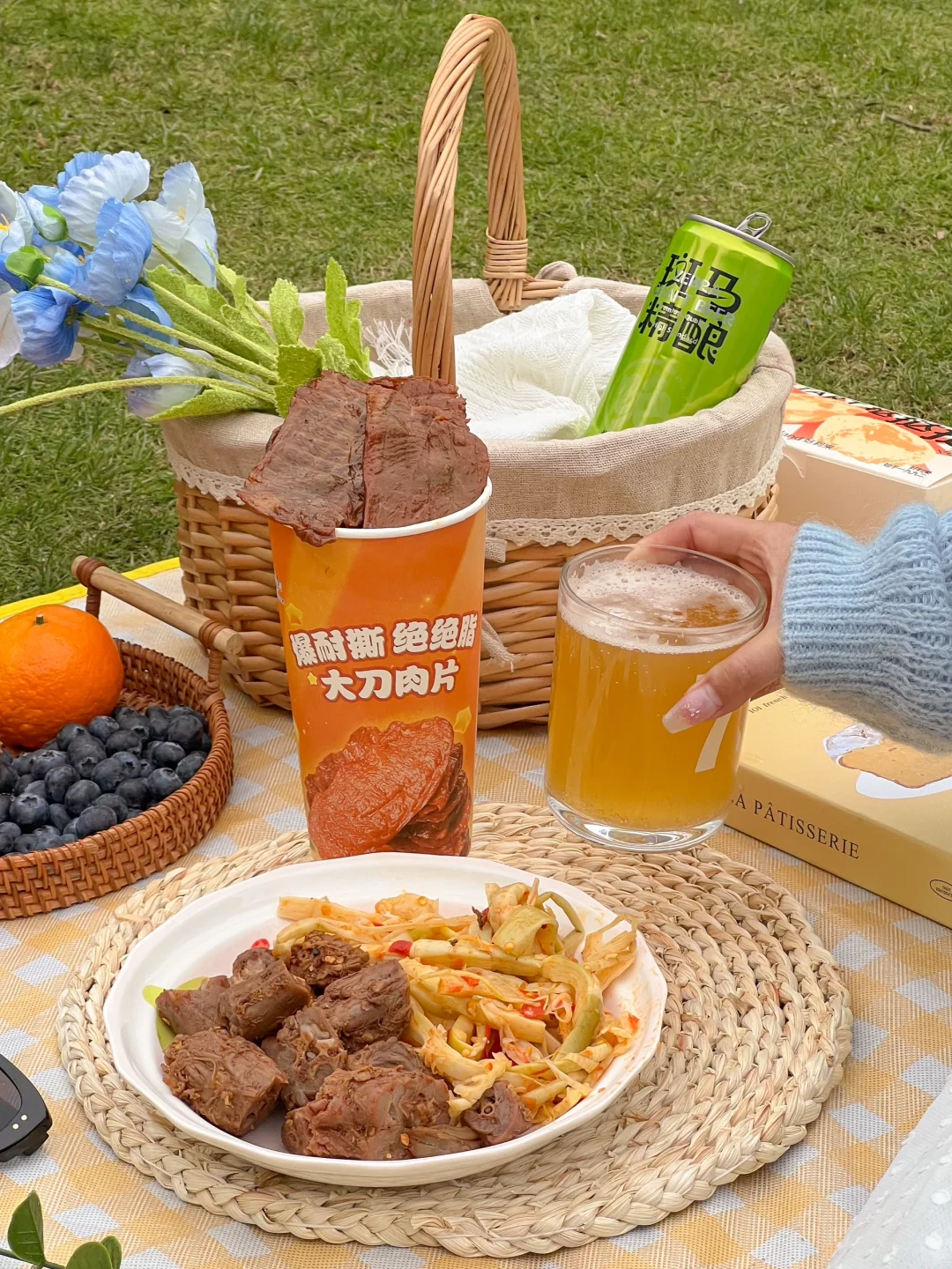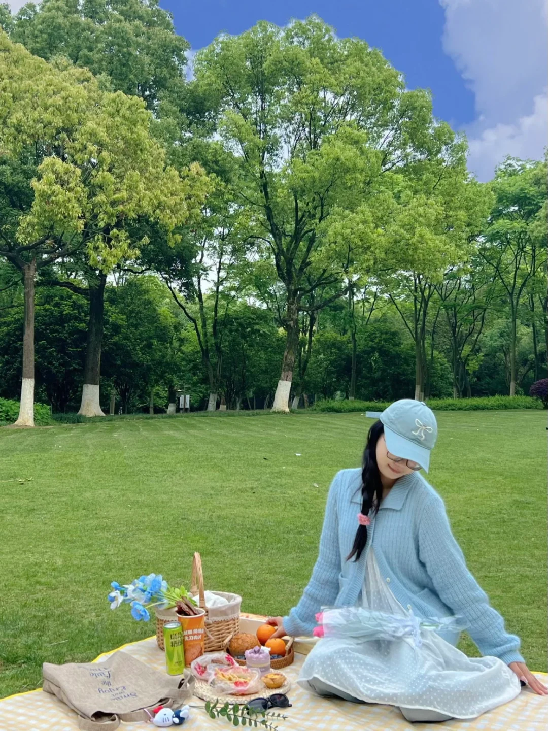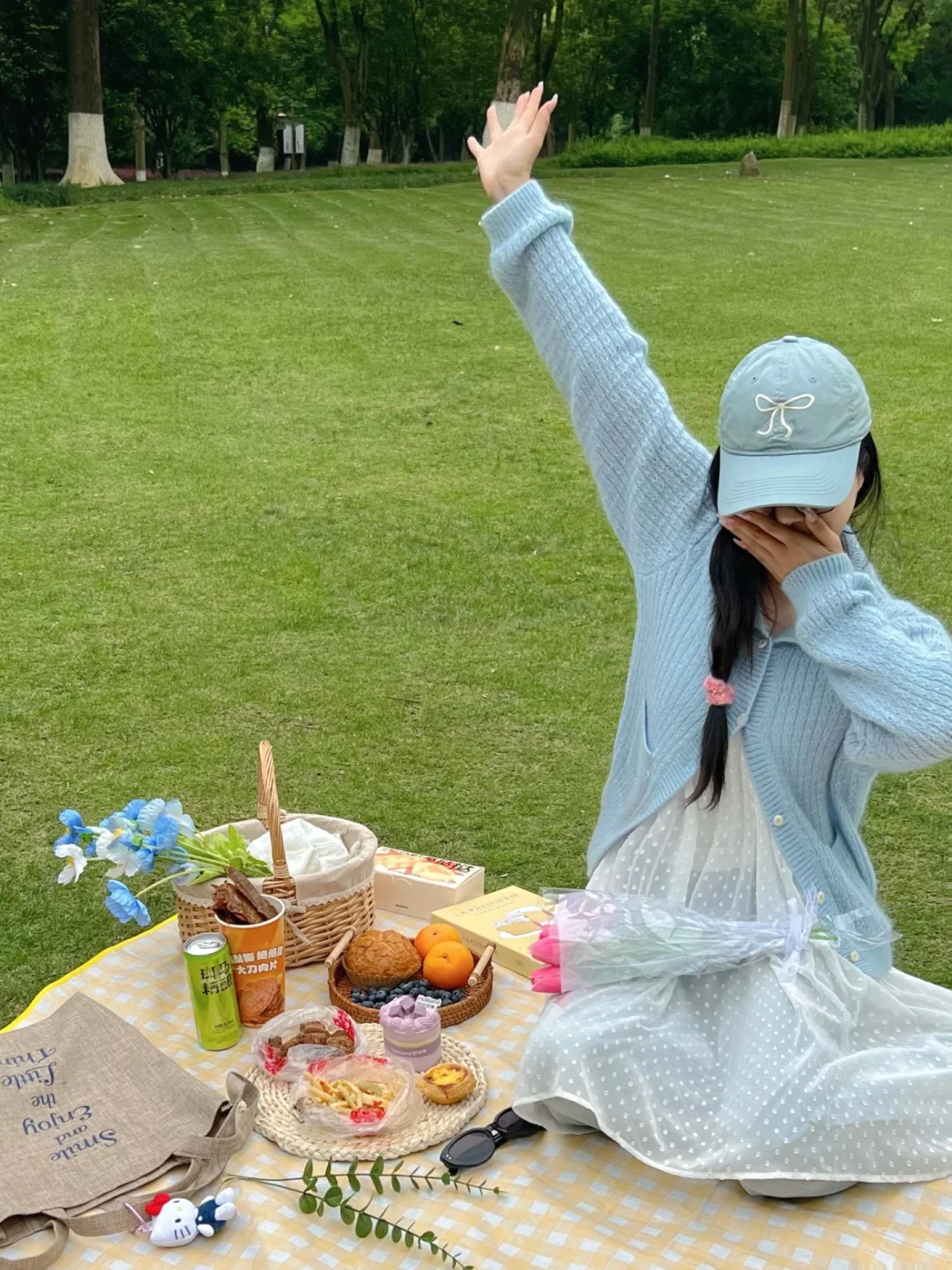 我最爱的春季🌞又来啦~ 现在这个天气太适合和朋友外出郊游野餐啦~ 趁着五一假期快邀请你最好的朋友🧑🤝🧑 一起吹吹公园的微风吧~ 野餐准备: 好看的野餐布、玻璃杯、水果、零食、拍照道具 穿白色或蓝色的衣服拍照更好看哦